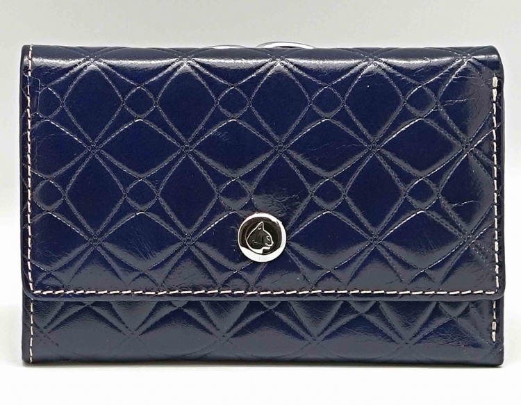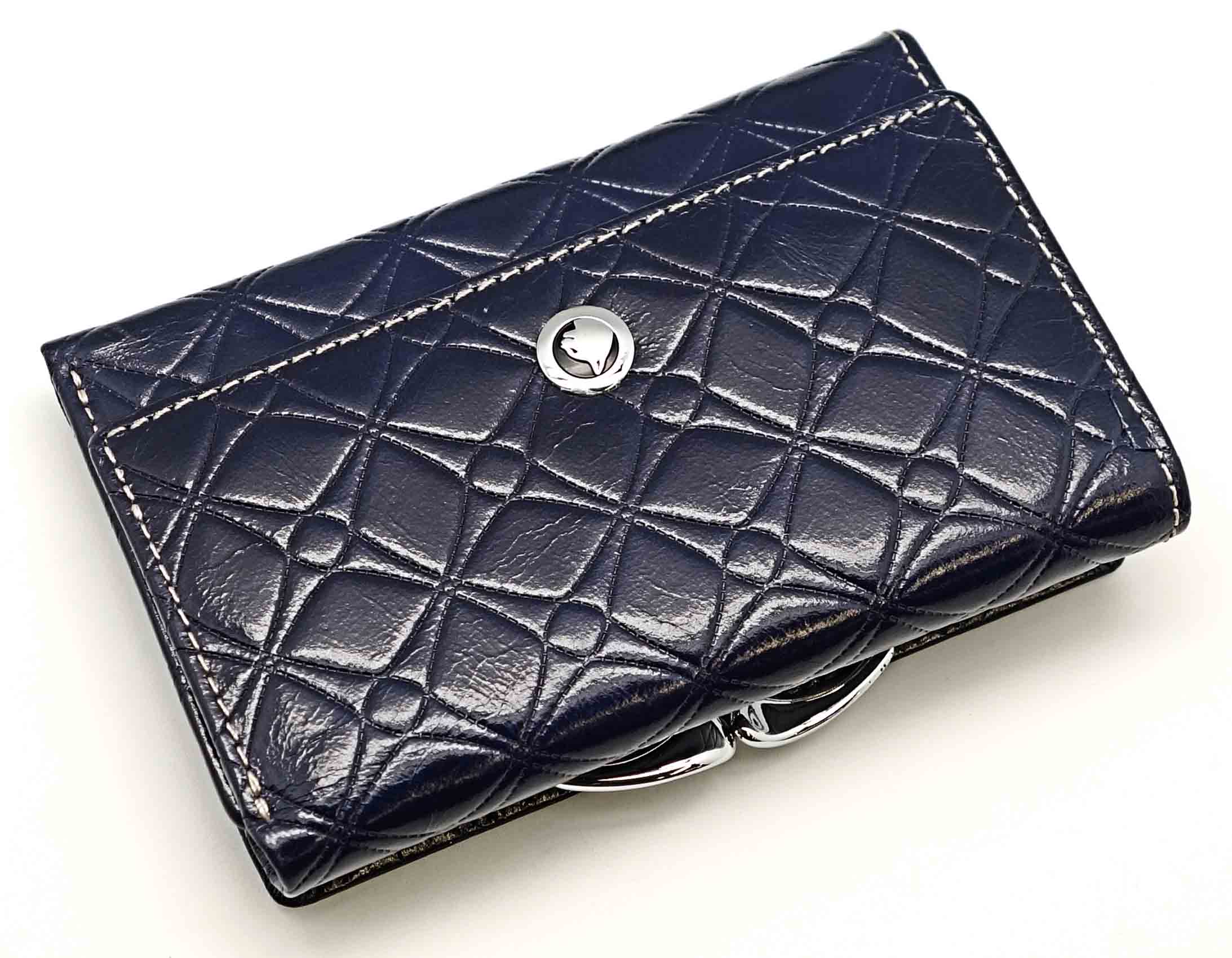 Размер 12,5 х 8,5 см.. Закрывается на кнопку. Снаружи - отделение для монет под рамочным замком. Внутри - три отделения для купюр (одно на молнии), три кармашка для пластиковых карт, два боковых кармана, прозрачное окошко для фотографии.