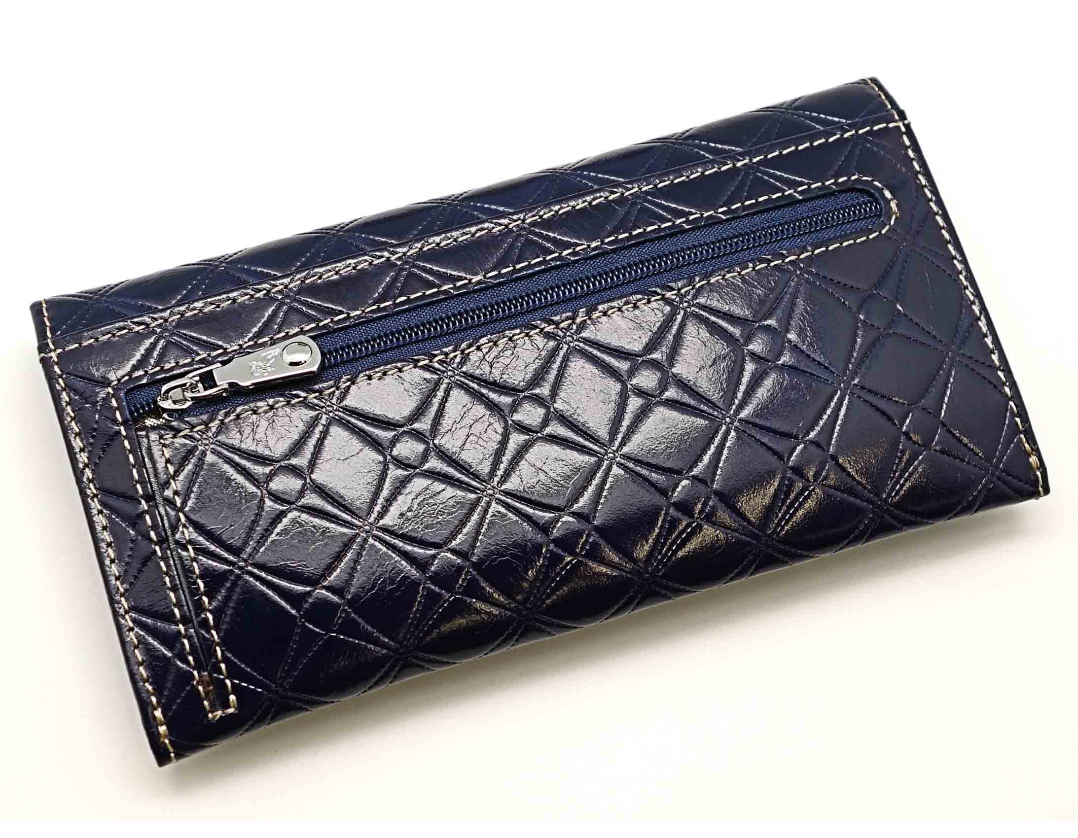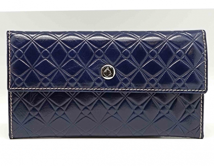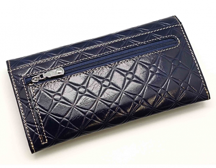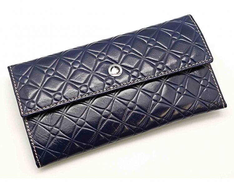 Размер 18 х 9,5 см.. Закрывается на кнопку. Внутри - одно отделение и два кармана для купюр ,8 кармашков для пластиковых карт, продольное отделение в клапане. Снаружи, на тыльной стороне - карман без застёжки и отделение для монет на молнии.