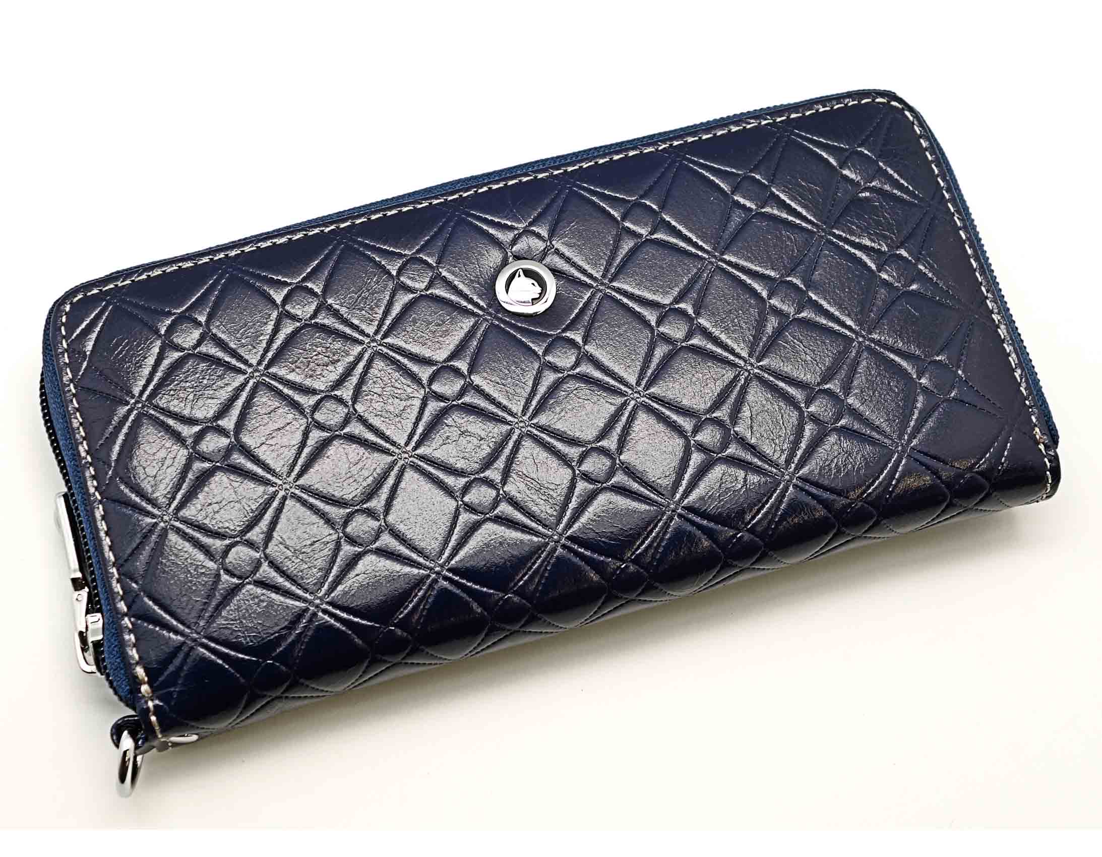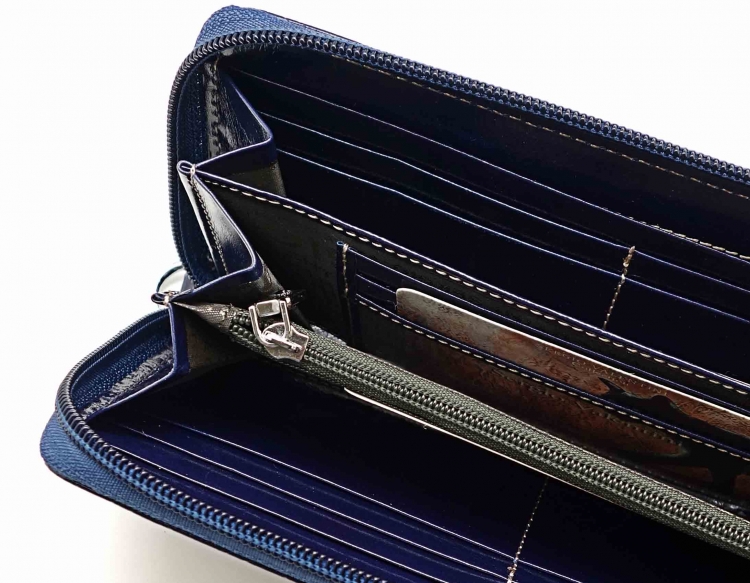 Размер 19 х 9,5 см.. Закрывается на молнию. Внутри - три отделения и два кармана для купюр, отделение для монет на молнии, 15 кармашков для пластиковых карт. Снаружи: на оборотной стороне карман на молнии, в нижней левой части металлическое полукольцо для крепления кожаного ремешка с карабином.