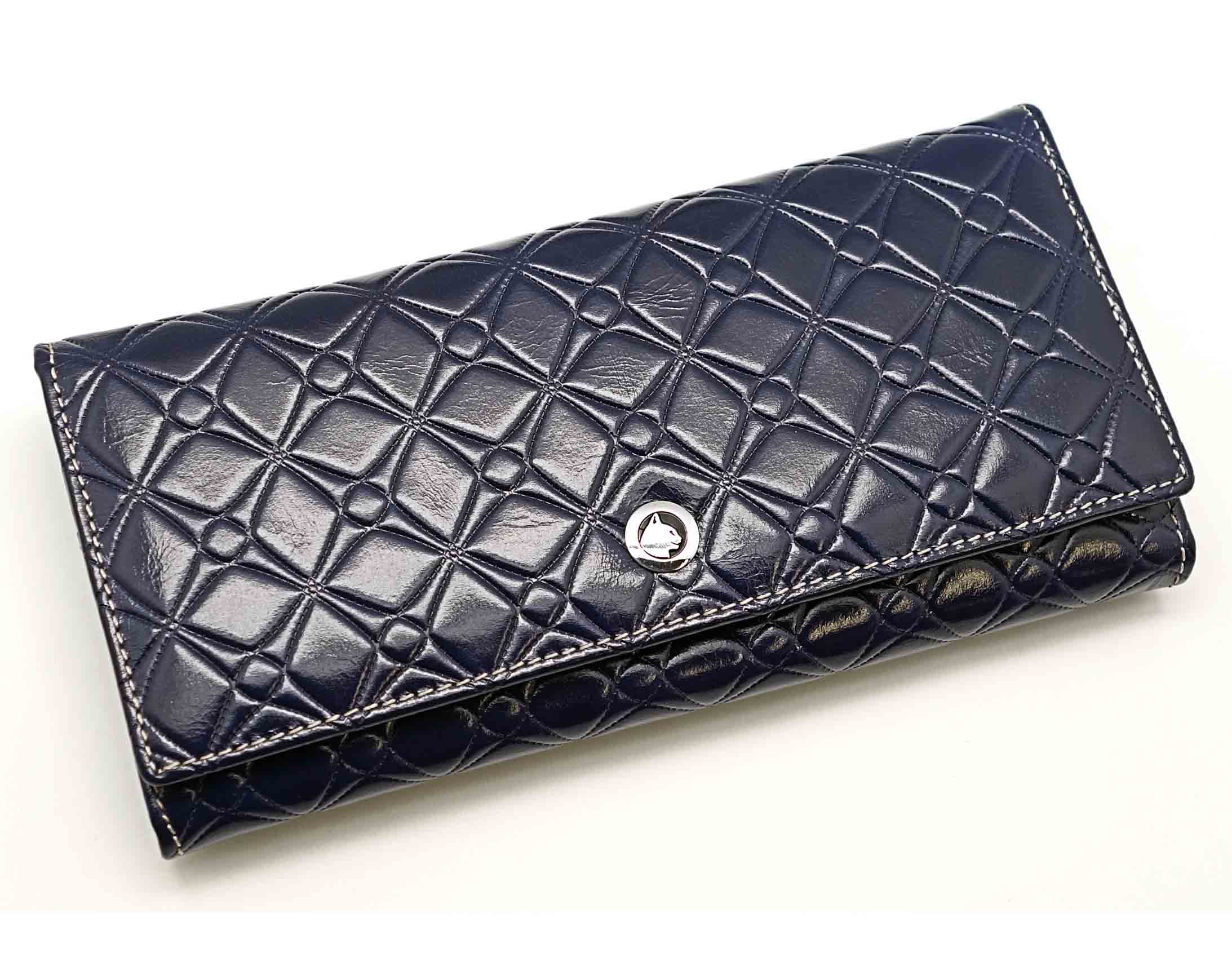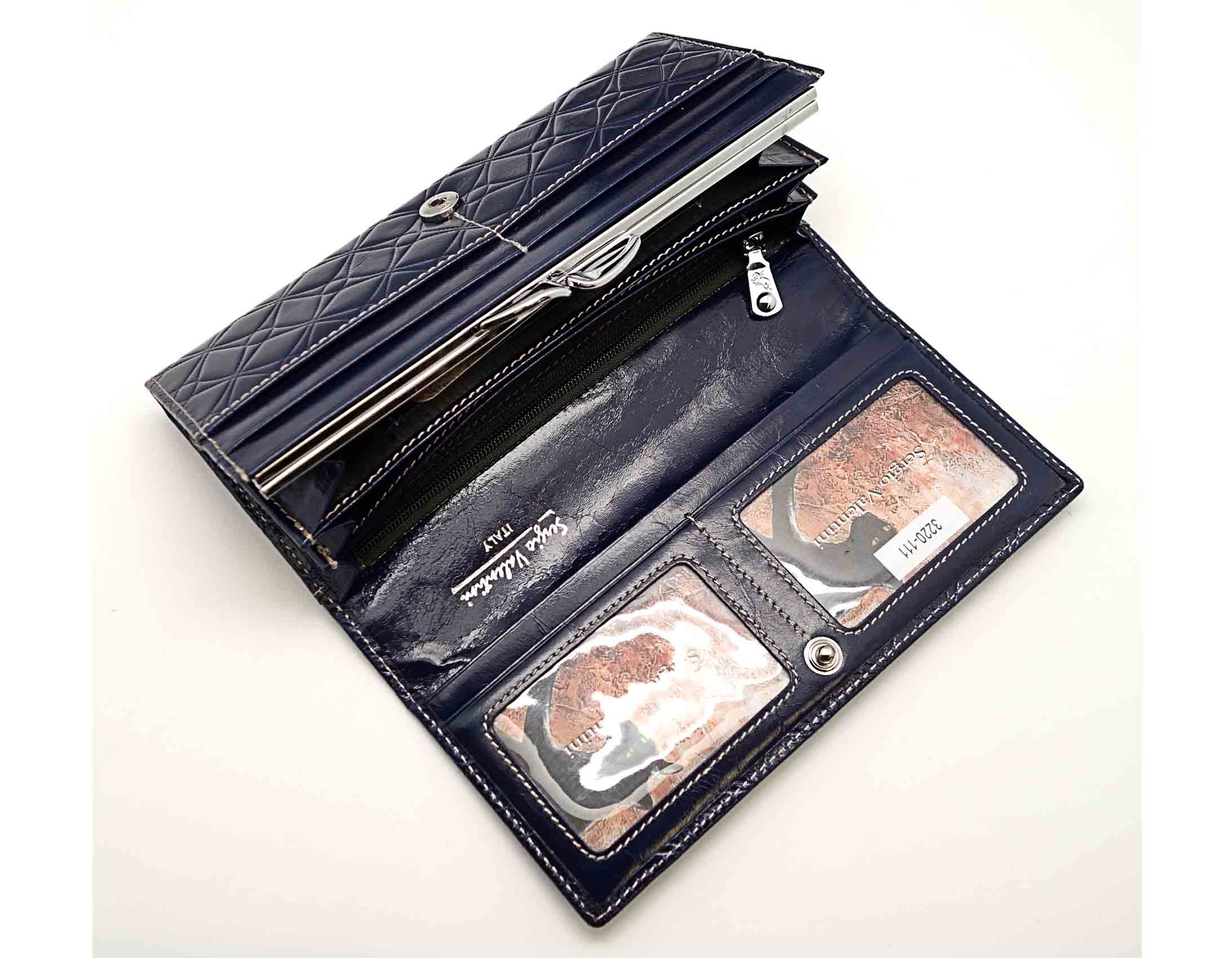 Размер 18,5 х 9.5 см. Закрывается на кнопку. Внутри - три отделения и карман для купюр, два отделения для монет под рамочным замком, карман на молнии, 7 кармашков для пластиковых карт, два прозрачных окошка, один продольный карман на створке. Снаружи, на оборотной стороне - карман без застёжки.