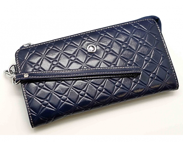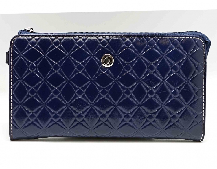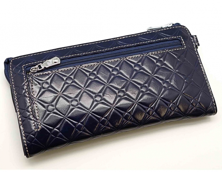 Размер 20 х 10 см.. Закрывается на молнию. Внутри - два отделения и два кармана для купюр, отделение для монет на молнии, 14 кармашков для пластиковых карт. Снаружи: на оборотной стороне карман на молнии, в левой части металлическое полукольцо для крепления кожаного ремешка с карабином.