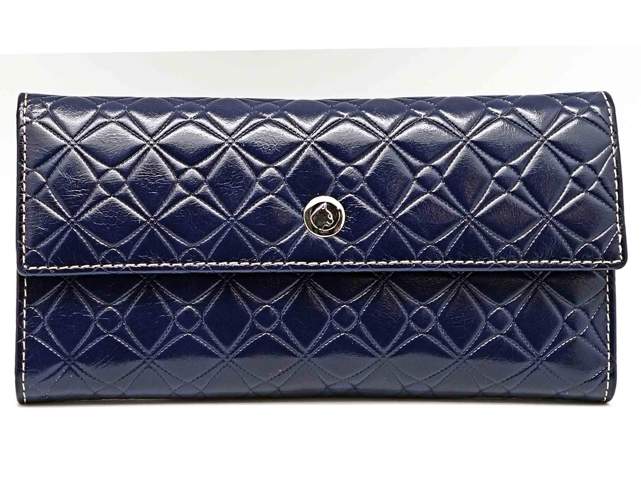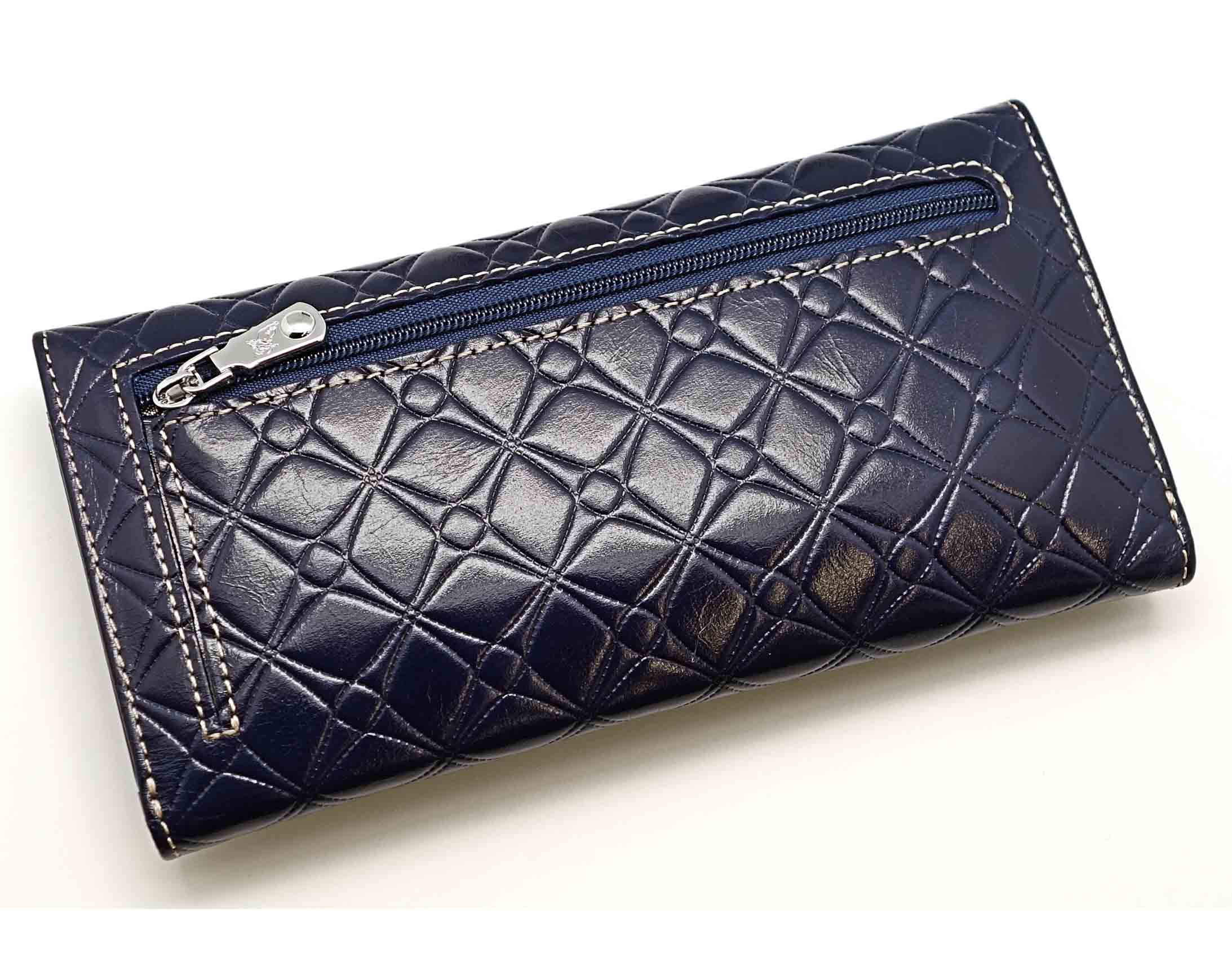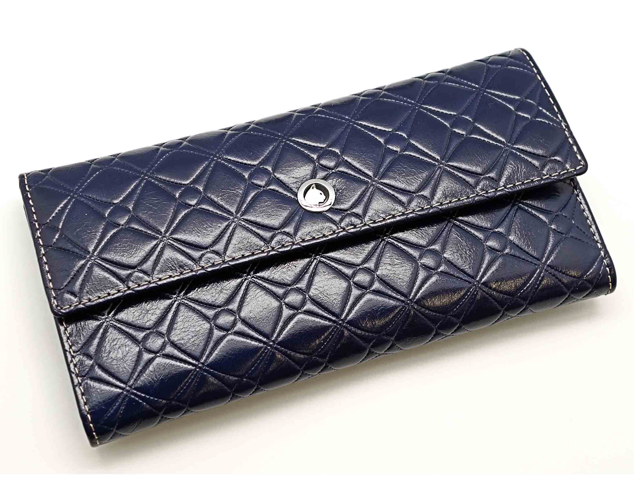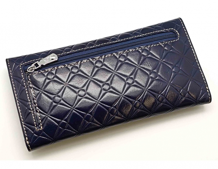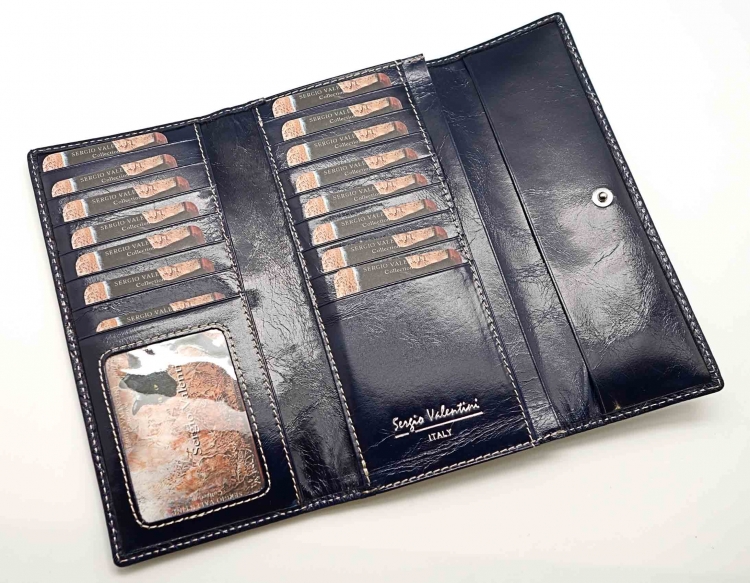 Размер 18 х 9,5 см.. Закрывается на кнопку. Внутри - одно отделение и два кармана для купюр,14 кармашков для пластиковых карт, прозрачное окошко для фотографии, продольное отделение в клапане. Снаружи, на оборотной стороне отделение для монет на молнии.