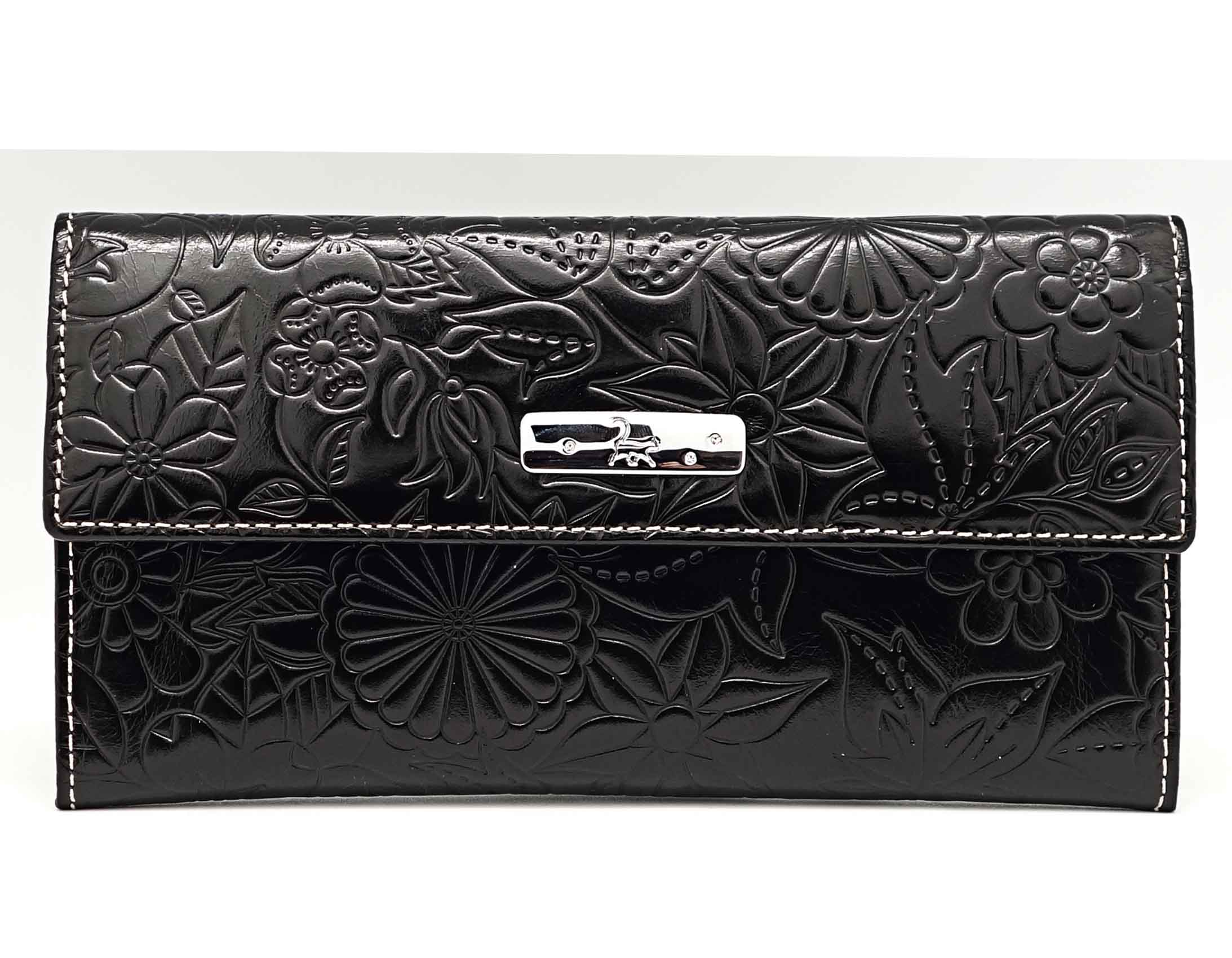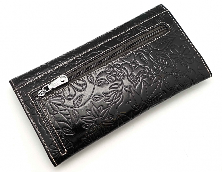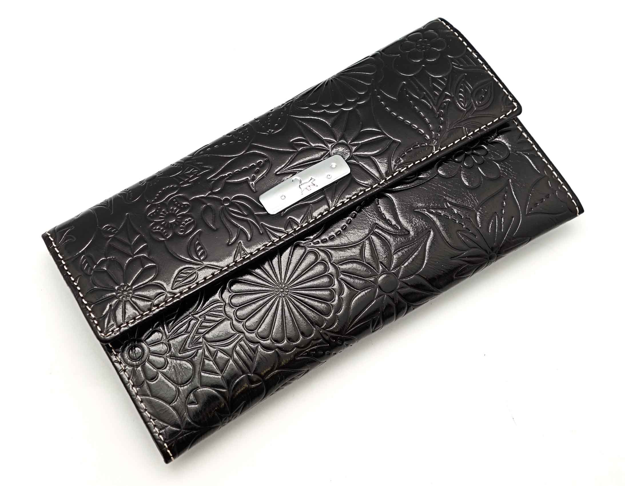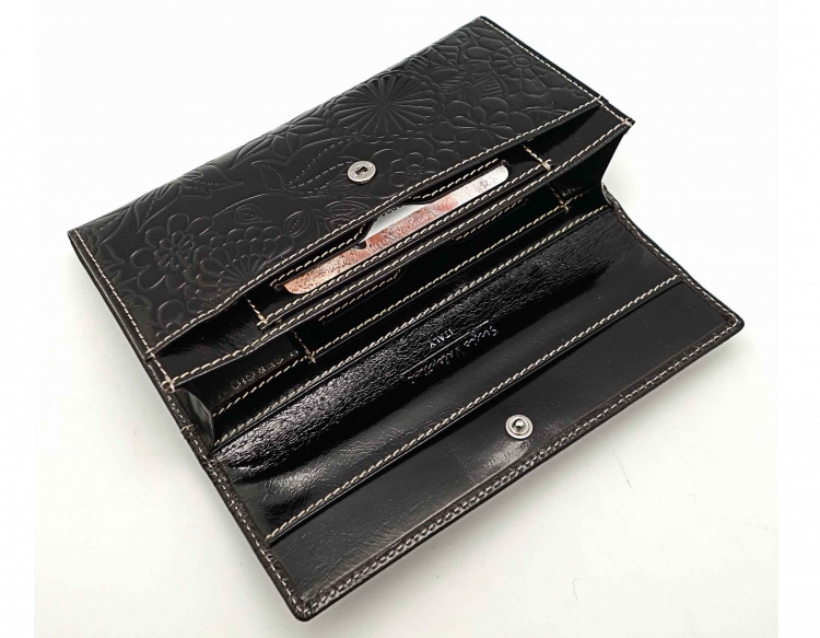 Размер 18 х 9,5 см.. Закрывается на кнопку. Внутри - одно отделение и два кармана для купюр ,8 кармашков для пластиковых карт, продольное отделение в клапане. Снаружи, на тыльной стороне - карман без застёжки и отделение для монет на молнии.