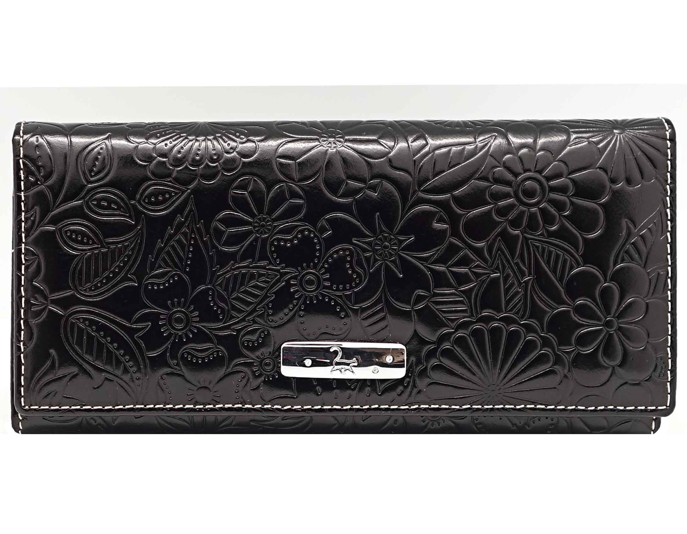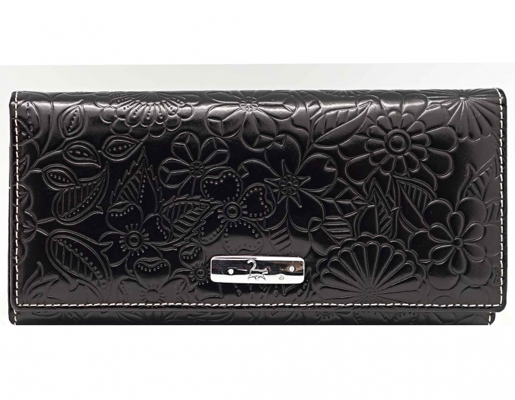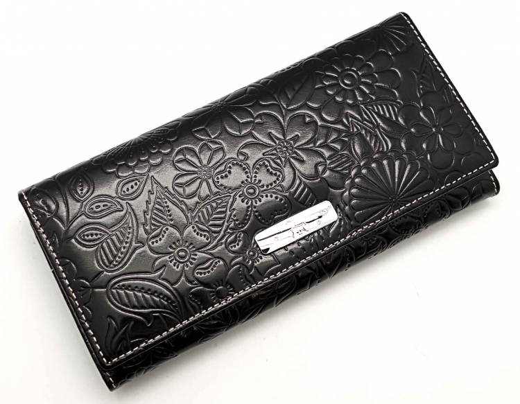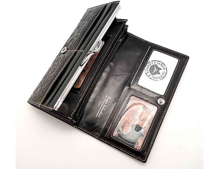Размер 18,5 х 9.5 см. Закрывается на кнопку. Внутри - три отделения и карман для купюр, два отделения для монет под рамочным замком, карман на молнии, 7 кармашков для пластиковых карт, два прозрачных окошка, один продольный карман на створке. Снаружи, на оборотной стороне - карман без застёжки.