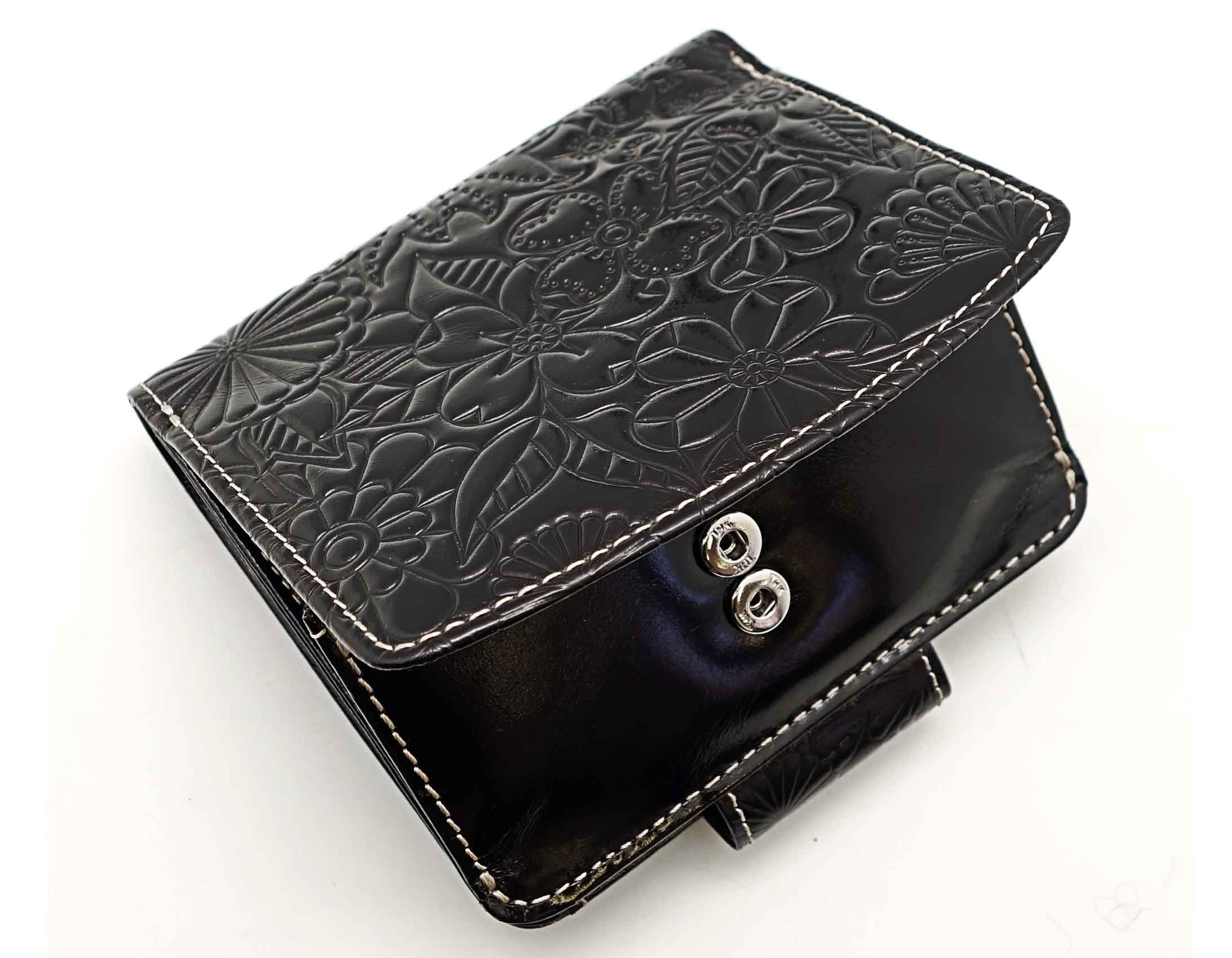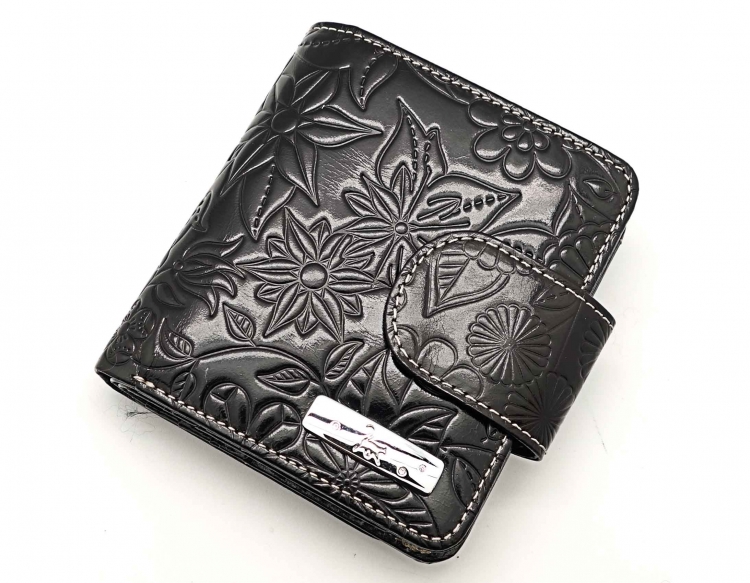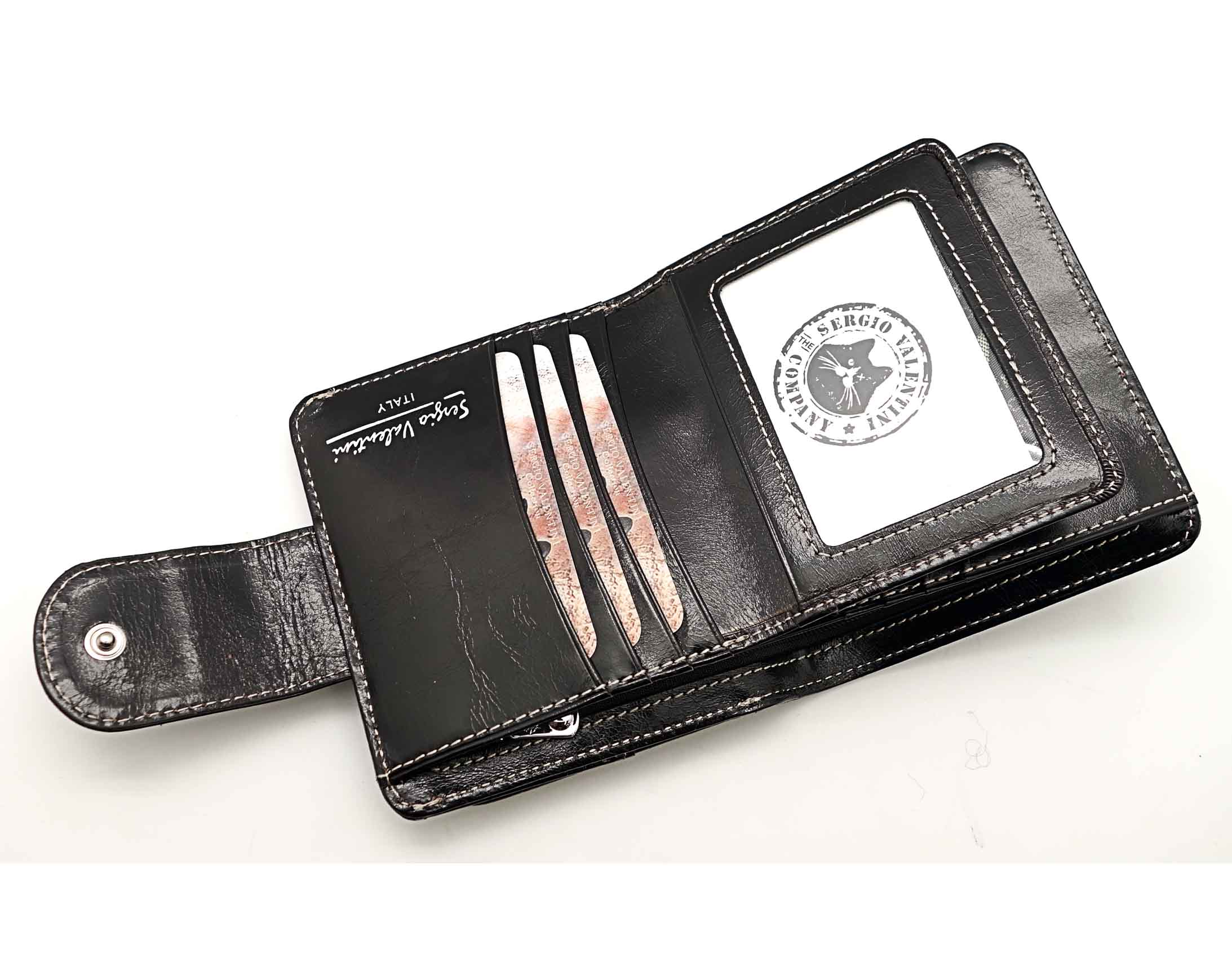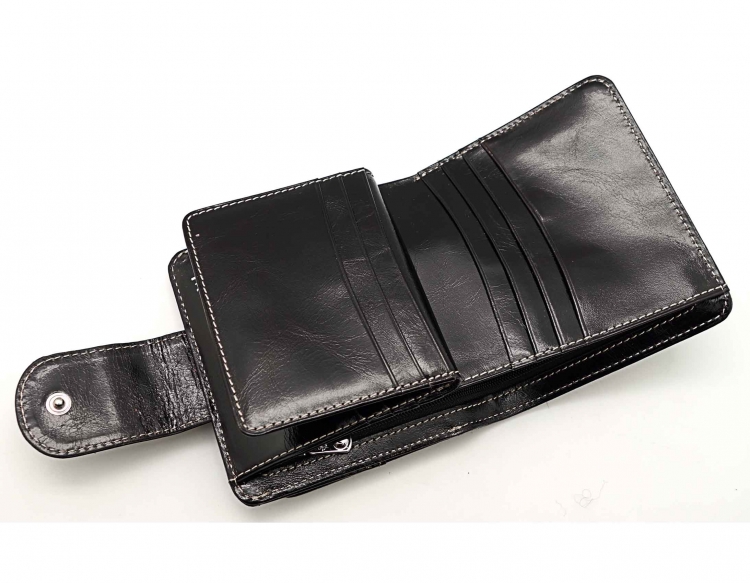 Размер 10,5 х 11 см. Закрывается на хлястик с кнопкой. Внутри - два отделения для купюр и один карман на молнии, 9 кармашков для пластиковых карт, 3 боковых кармана, прозрачное окошко. Снаружи- карман для монет на кнопке.