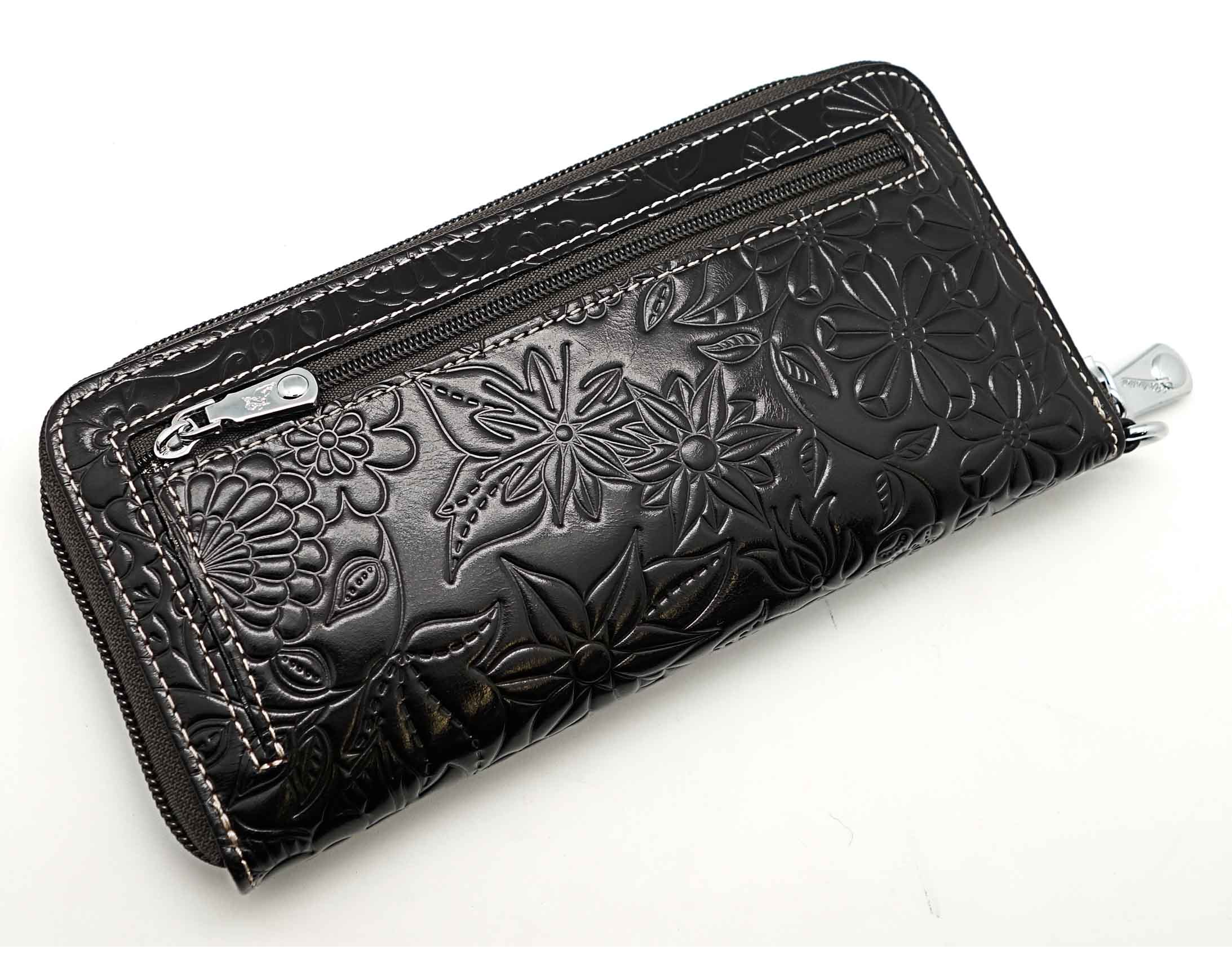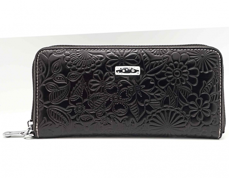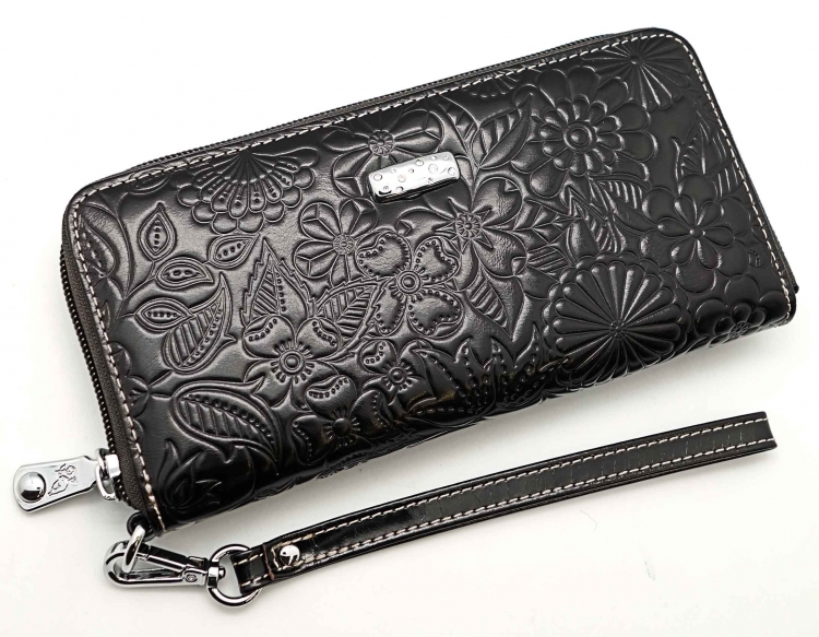 Размер 19 х 9,5 см.. Закрывается на молнию. Внутри - три отделения и два кармана для купюр, отделение для монет на молнии, 15 кармашков для пластиковых карт. Снаружи: на оборотной стороне карман на молнии, в нижней левой части металлическое полукольцо для крепления кожаного ремешка с карабином.