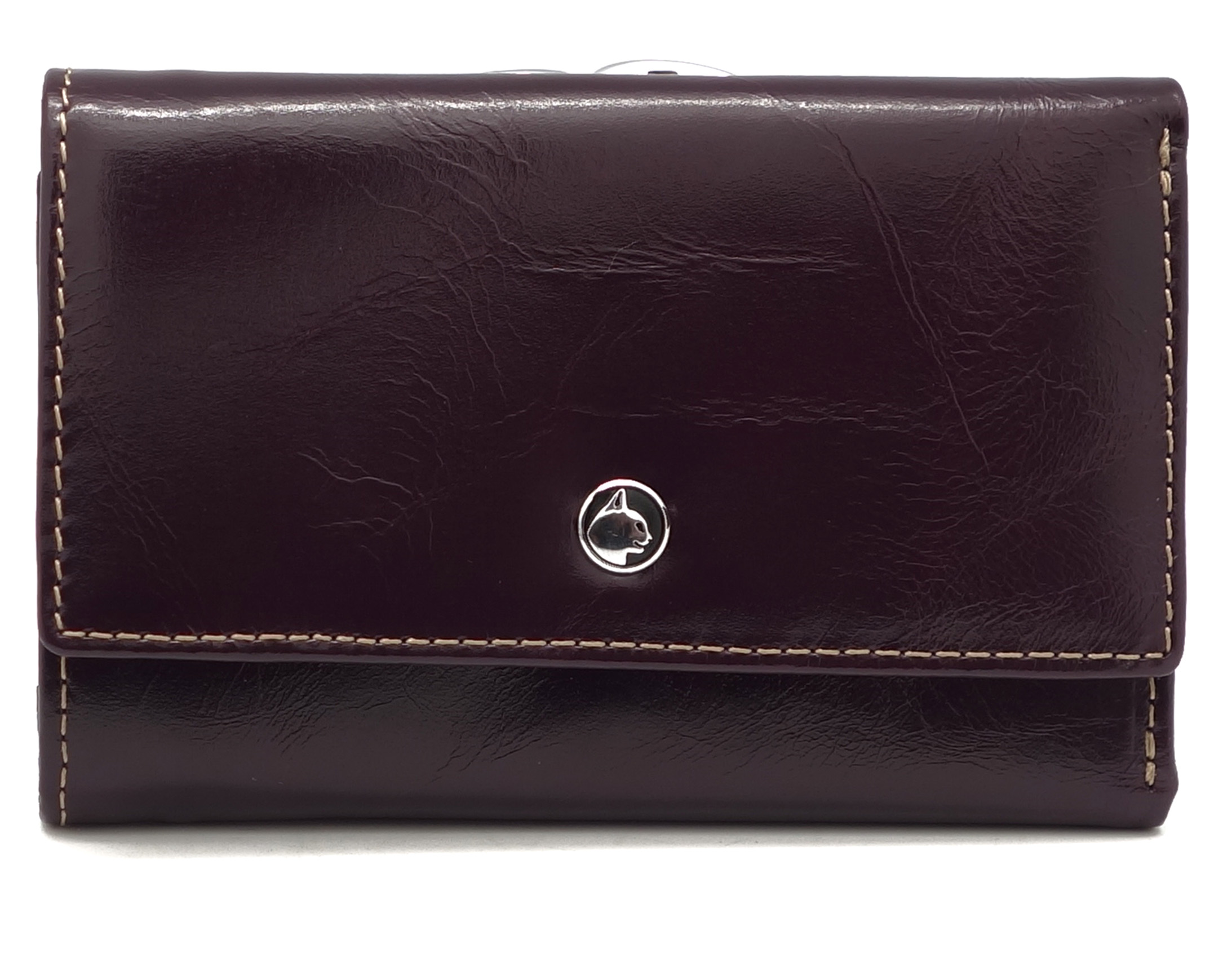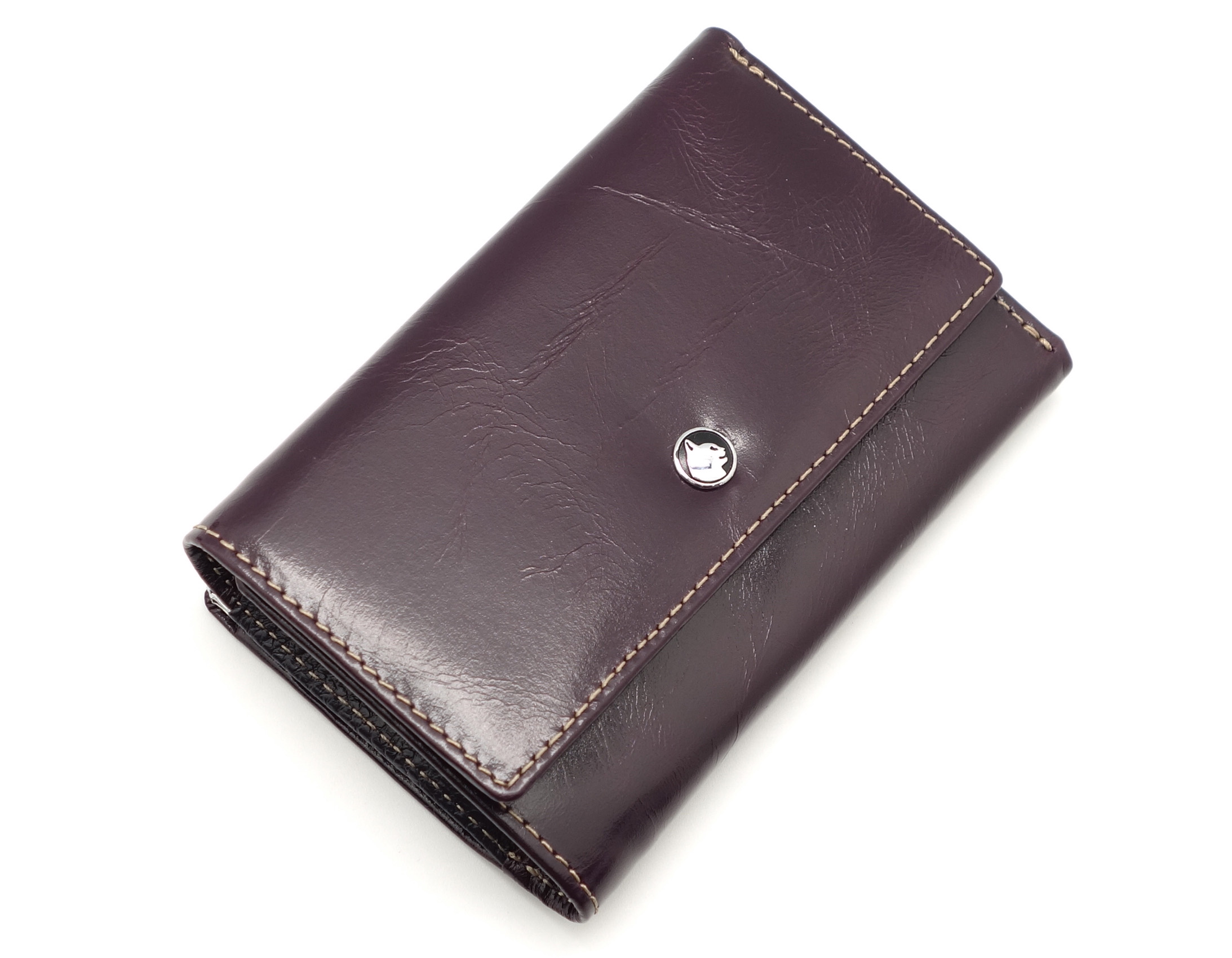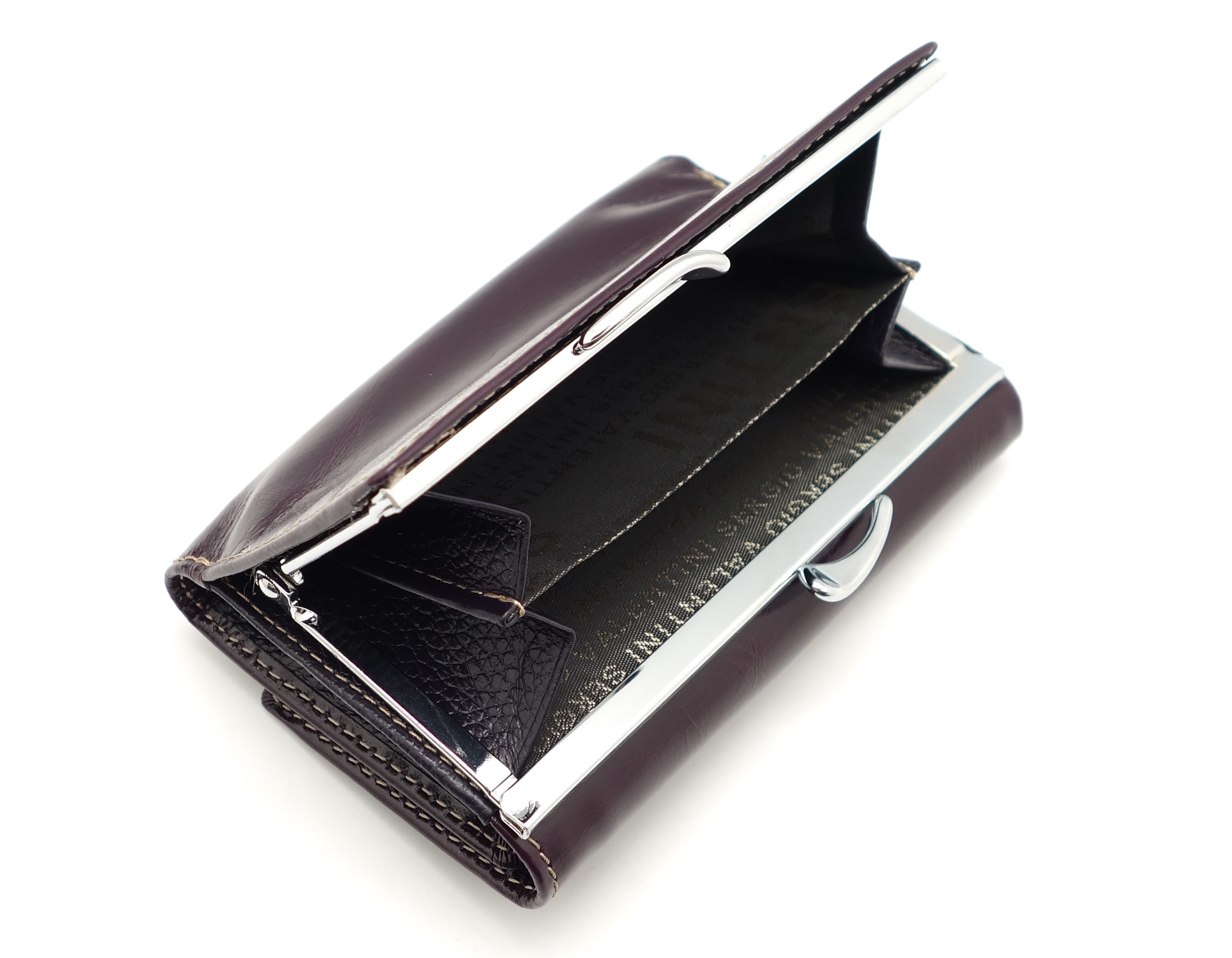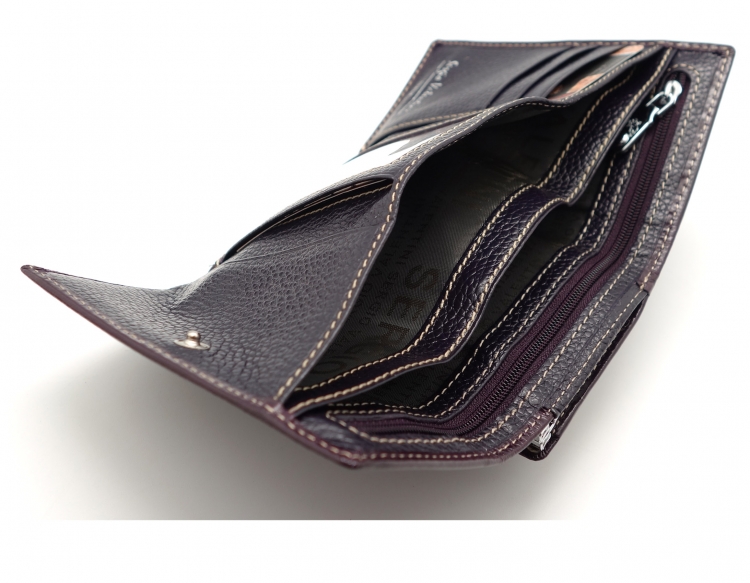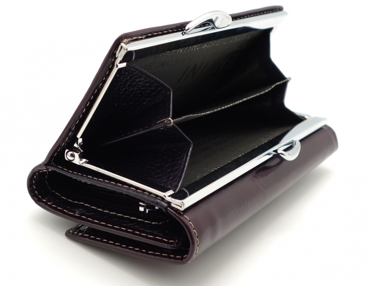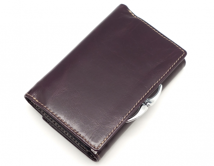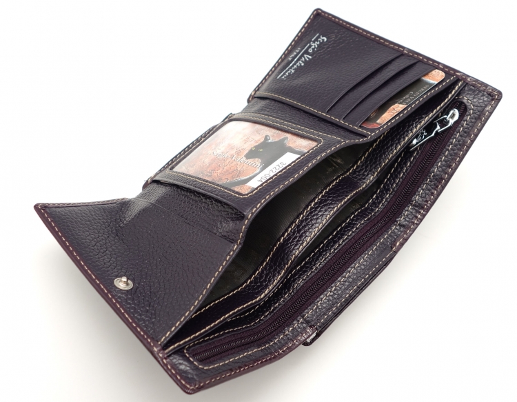 Размер 12,5 х 8,5 см.. Закрывается на кнопку. Снаружи - отделение для монет под рамочным замком. Внутри - три отделения для купюр (одно на молнии), три кармашка для пластиковых карт, два боковых кармана, прозрачное окошко для фотографии.