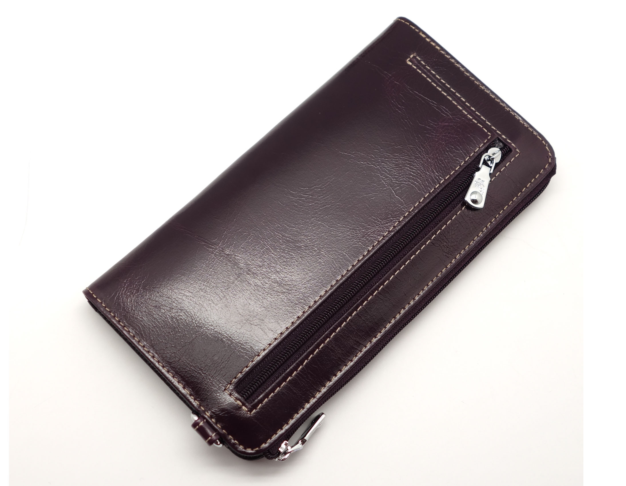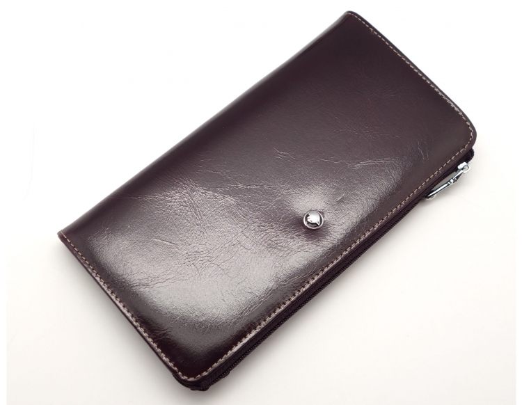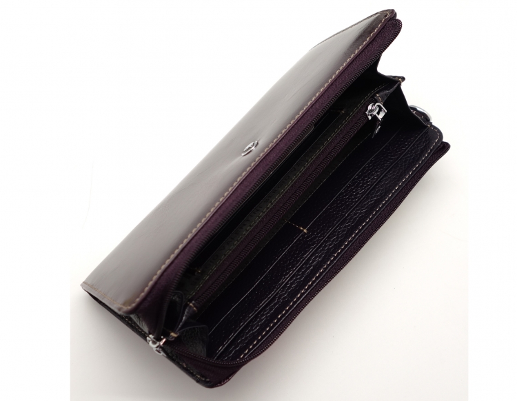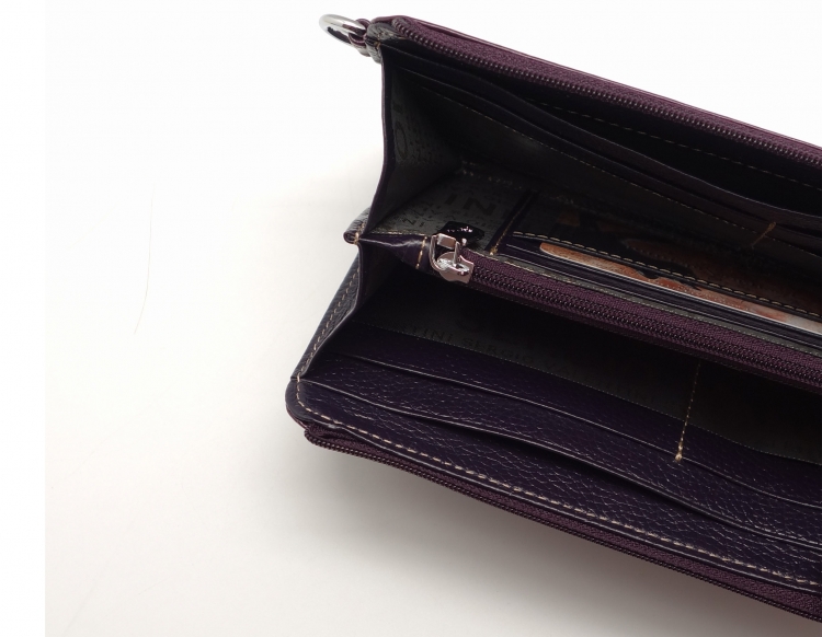 Размер 20 х 10 см.. Закрывается на молнию. Внутри - два отделения и два кармана для купюр, отделение для монет на молнии, 14 кармашков для пластиковых карт. Снаружи: на оборотной стороне карман на молнии, в левой части металлическое полукольцо для крепления кожаного ремешка с карабином.