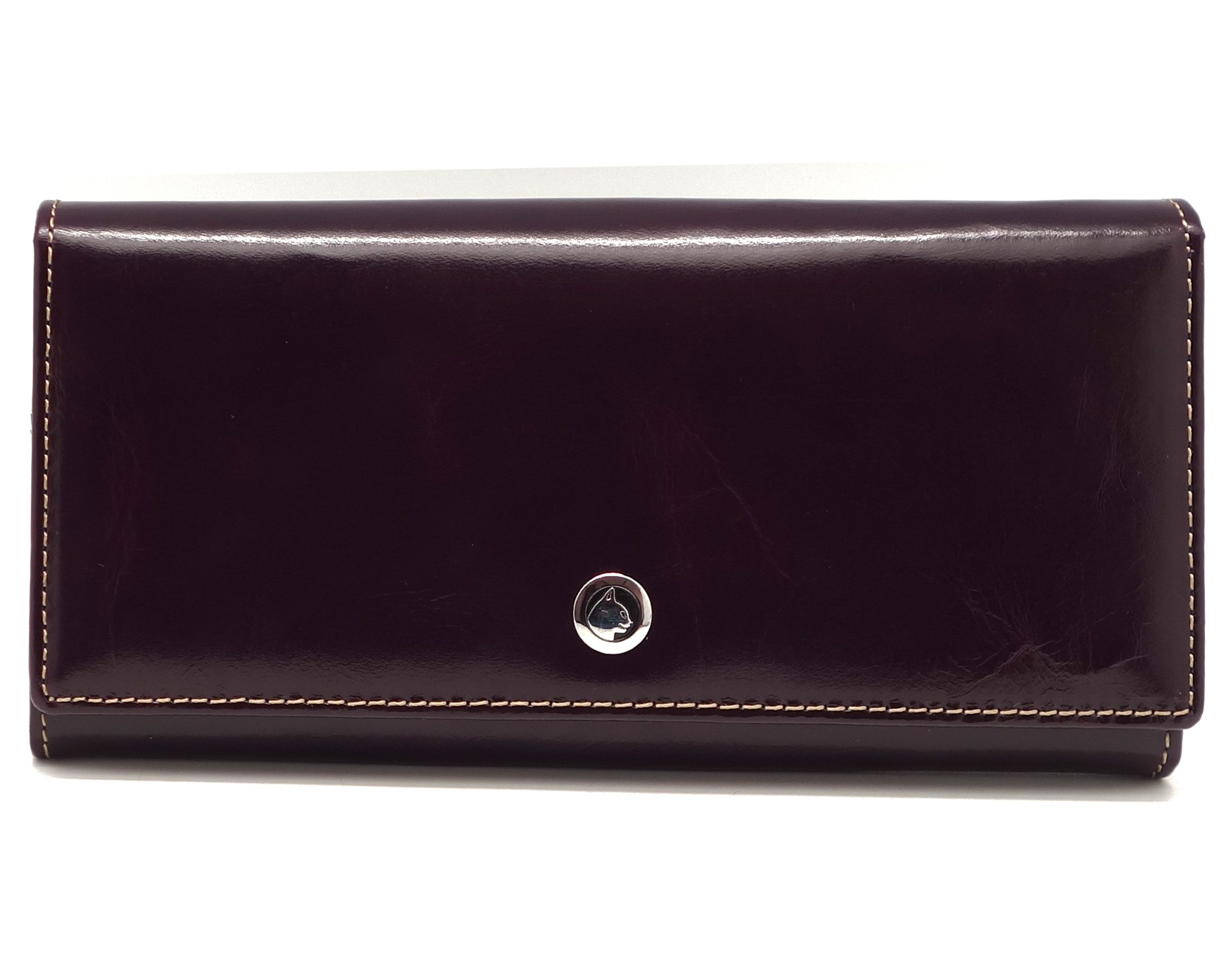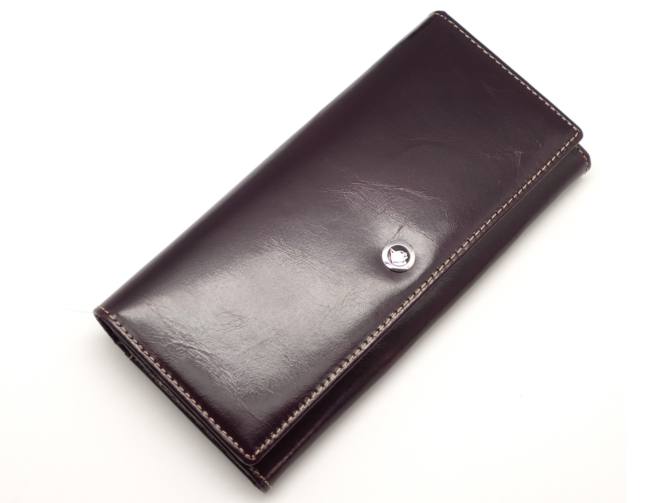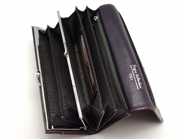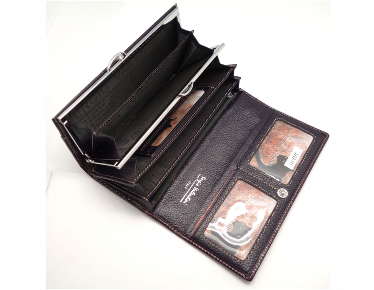 Размер 18,5 х 9.5 см. Закрывается на кнопку. Внутри - три отделения и карман для купюр, два отделения для монет под рамочным замком, карман на молнии, 7 кармашков для пластиковых карт, два прозрачных окошка, один продольный карман на створке. Снаружи, на оборотной стороне - карман без застёжки.
