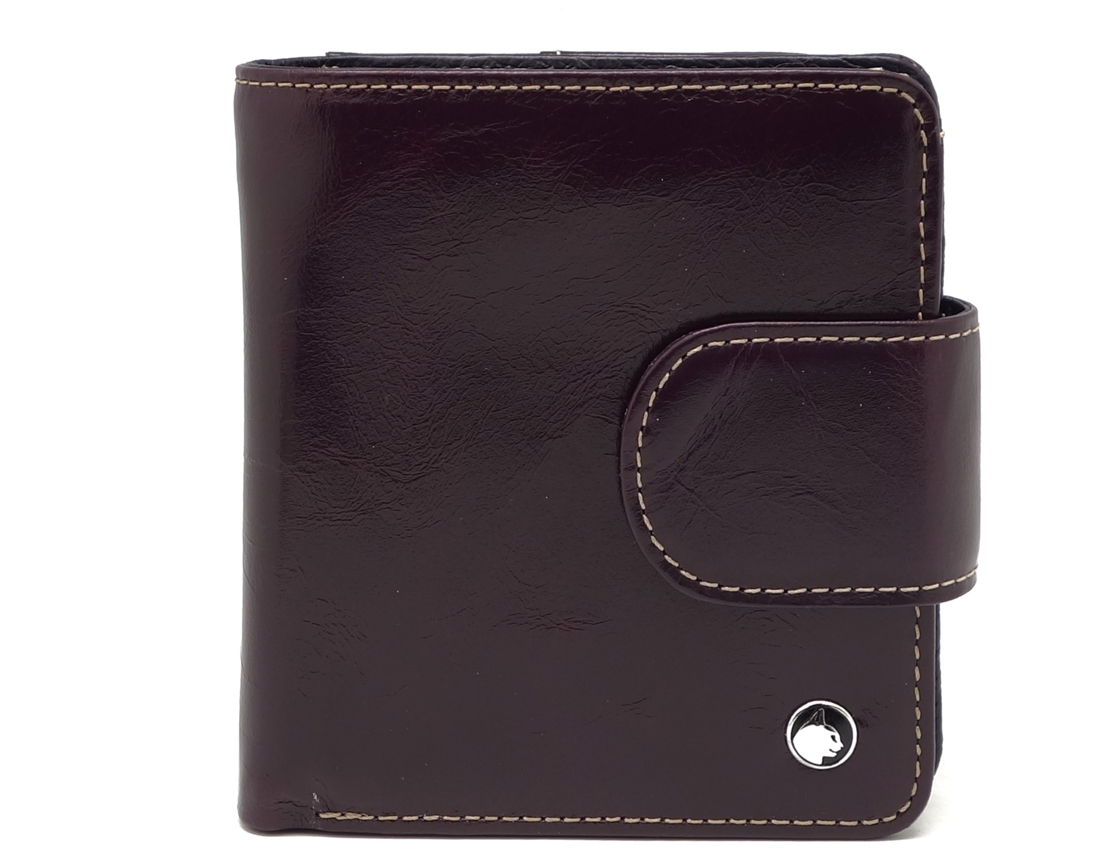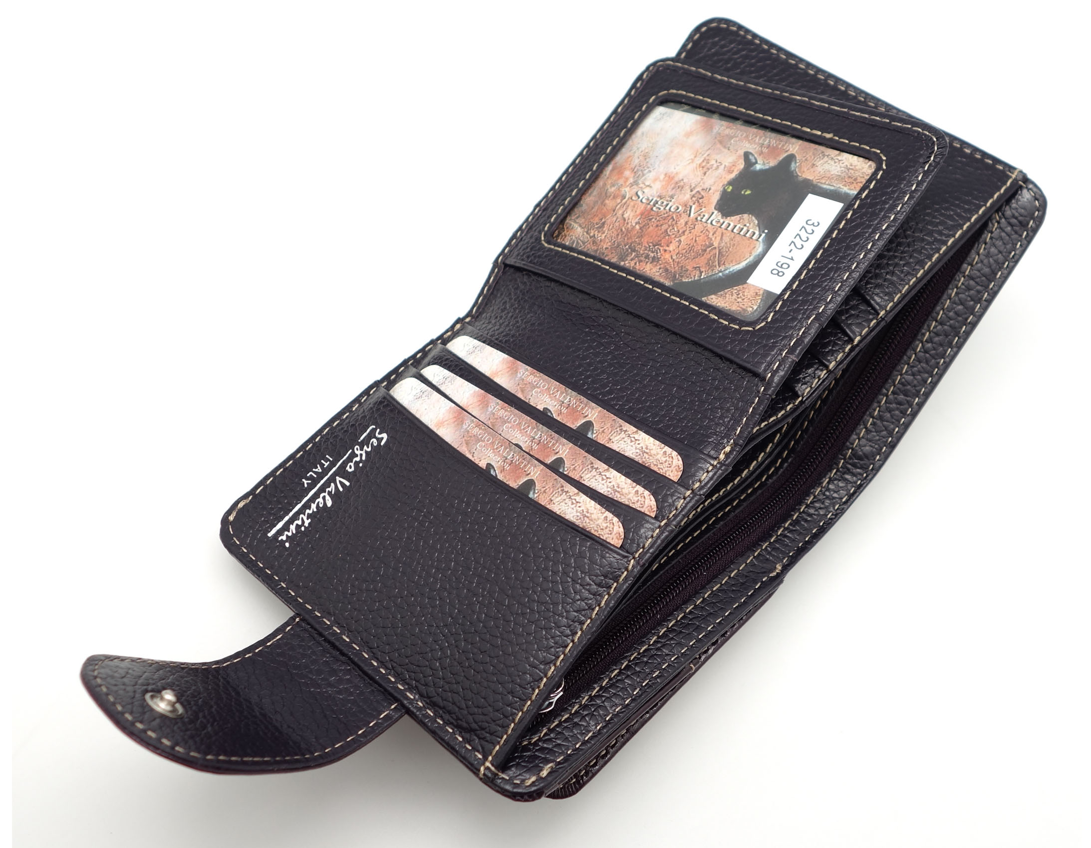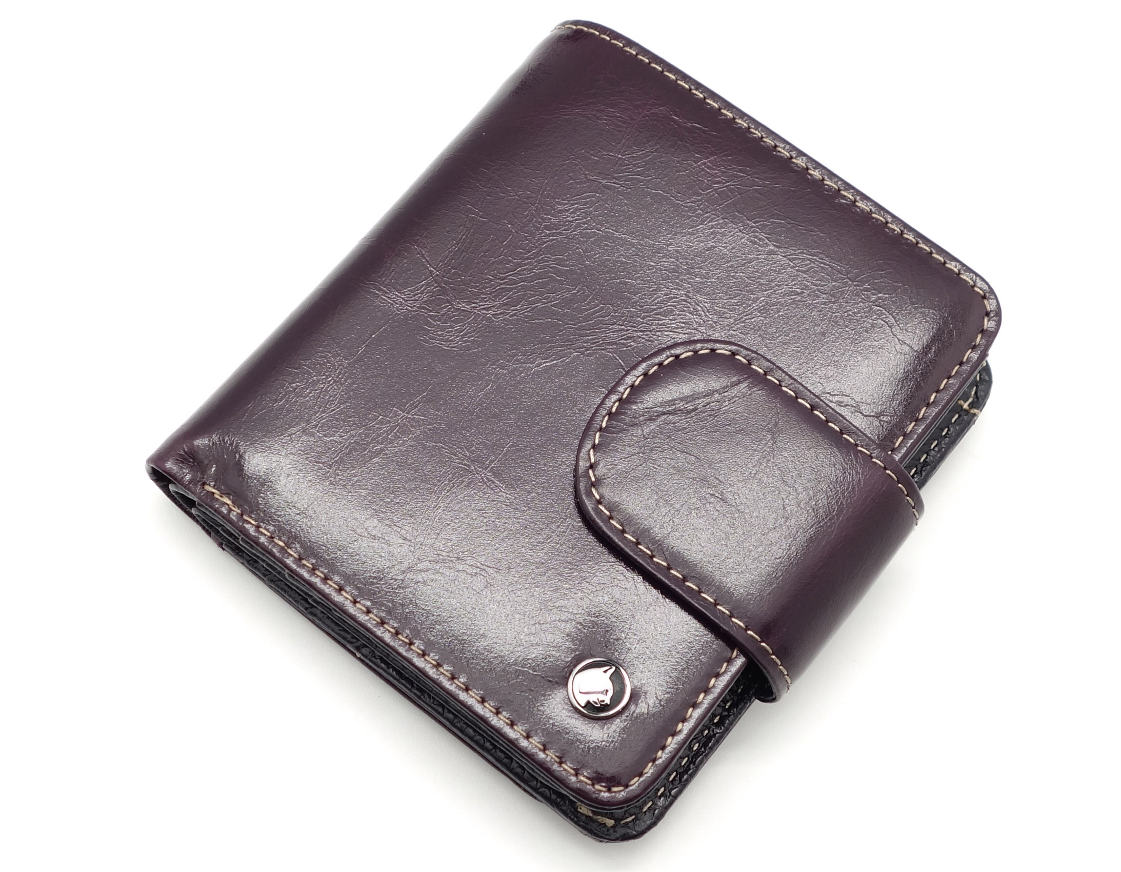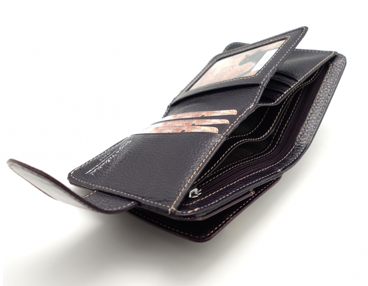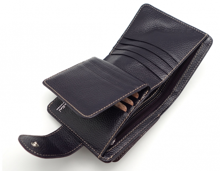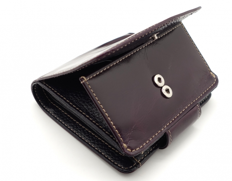 Размер 10,5 х 11 см. Закрывается на хлястик с кнопкой. Внутри - два отделения для купюр и один карман на молнии, 9 кармашков для пластиковых карт, 3 боковых кармана, прозрачное окошко. Снаружи- карман для монет на кнопке.
