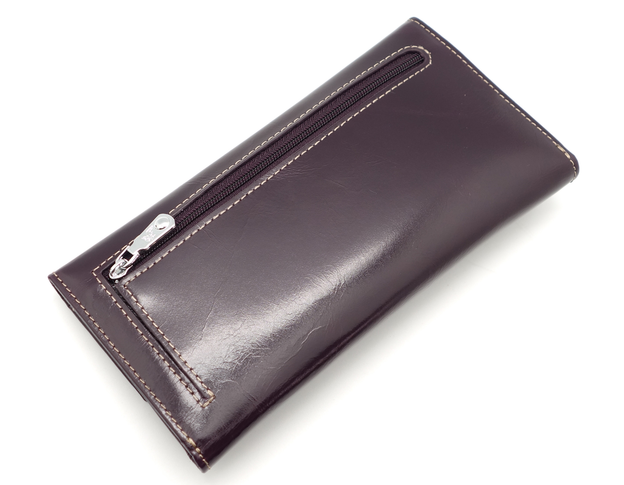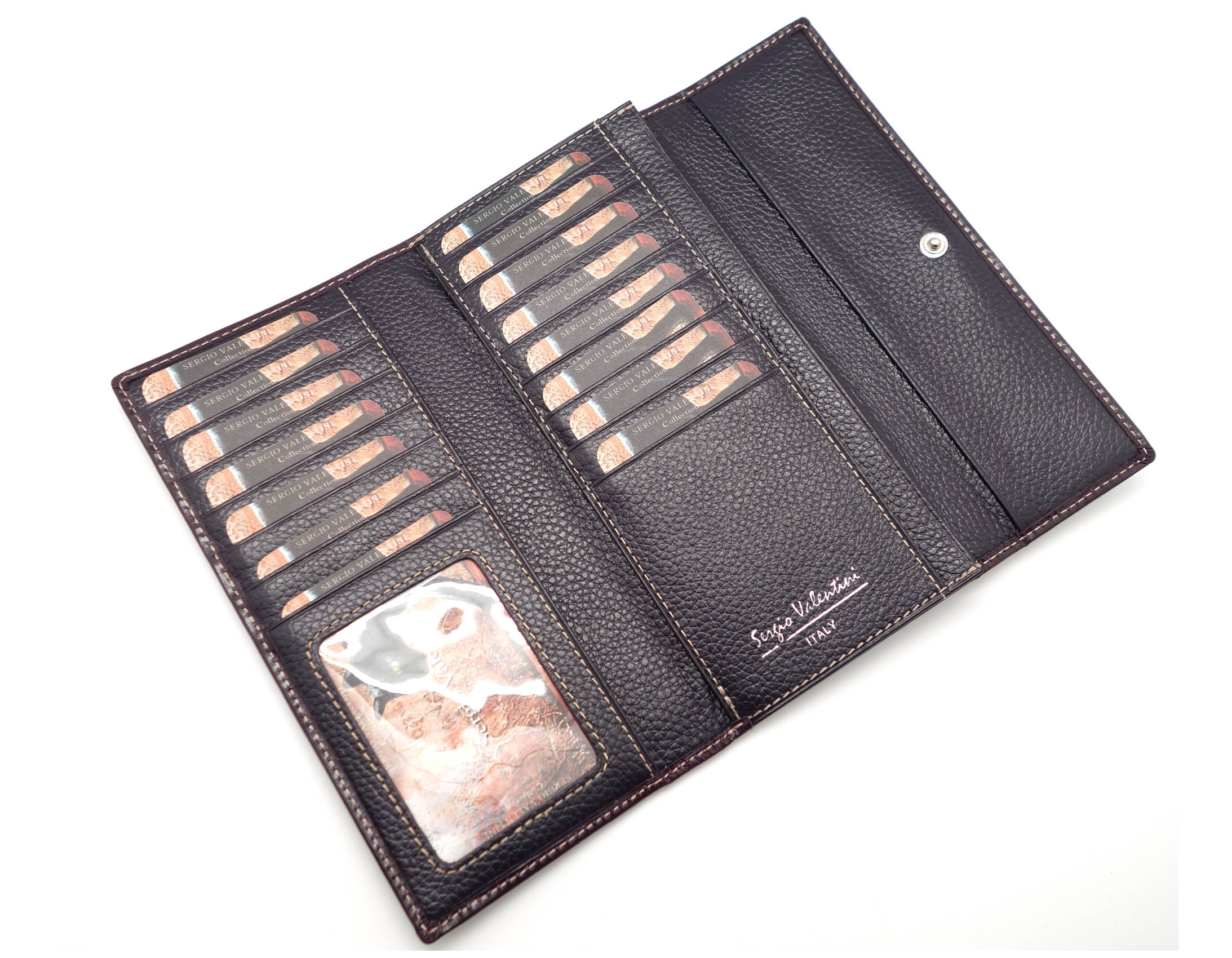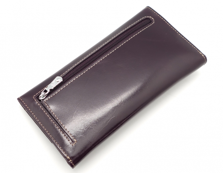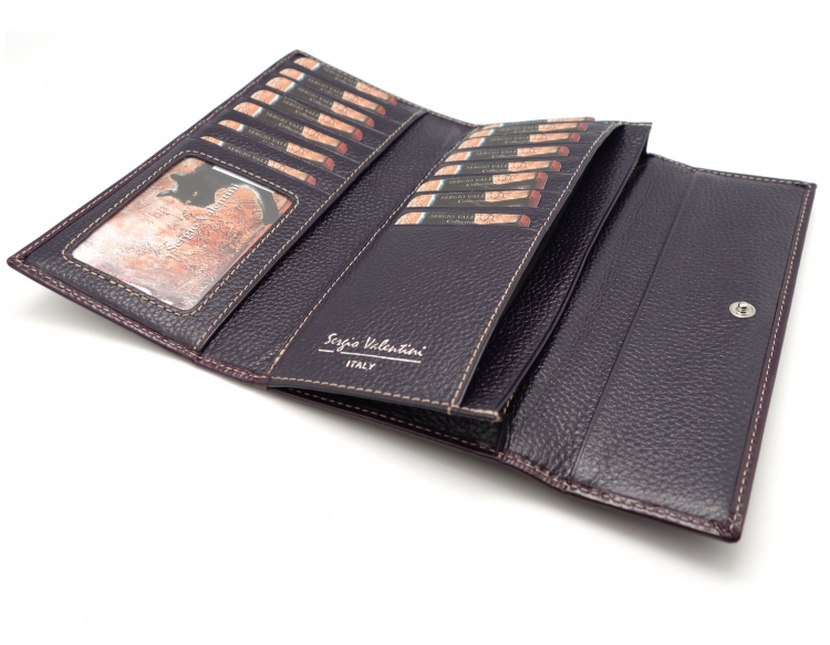 Размер 18 х 9,5 см.. Закрывается на кнопку. Внутри - одно отделение и два кармана для купюр,14 кармашков для пластиковых карт, прозрачное окошко для фотографии, продольное отделение в клапане. Снаружи, на оборотной стороне отделение для монет на молнии.