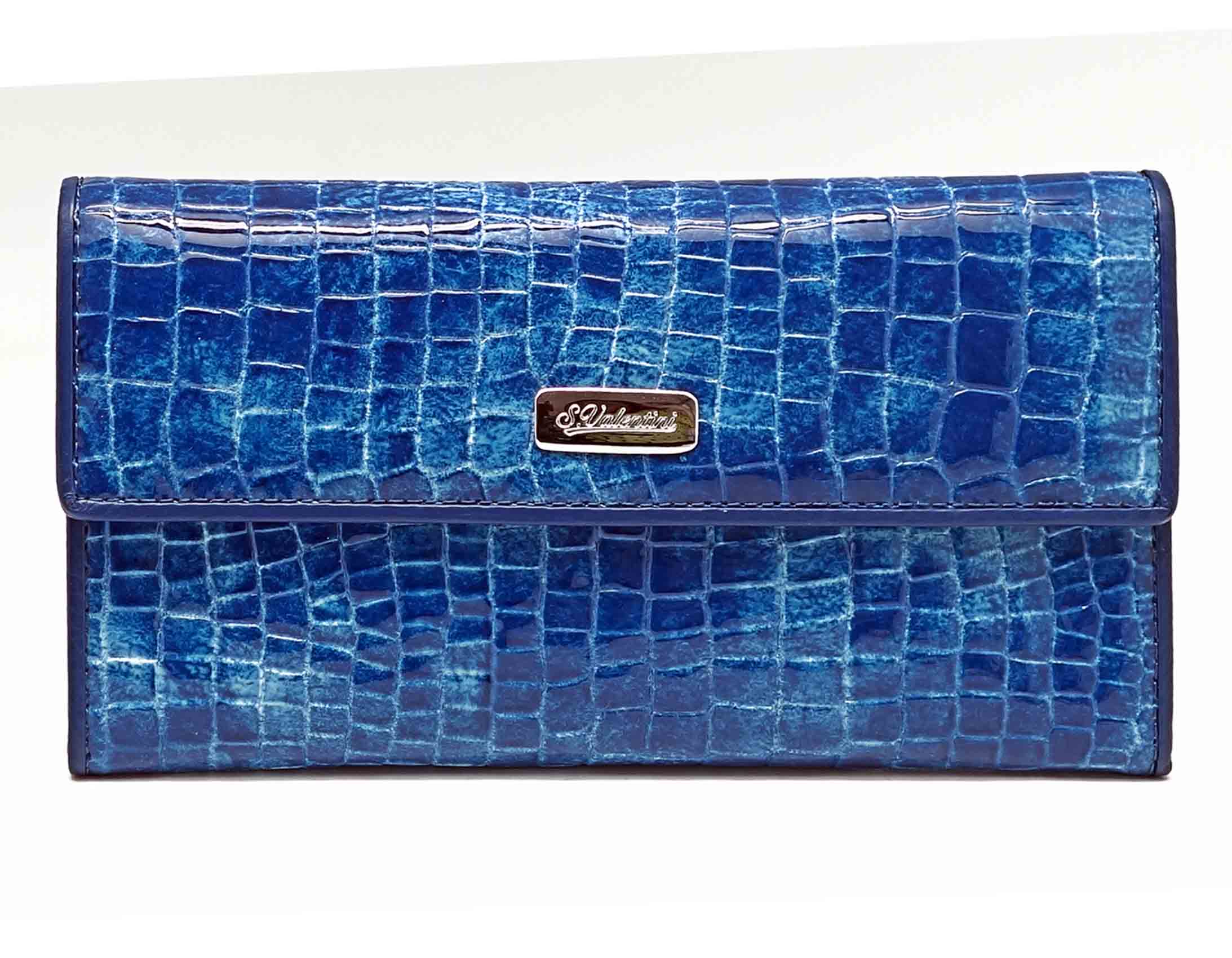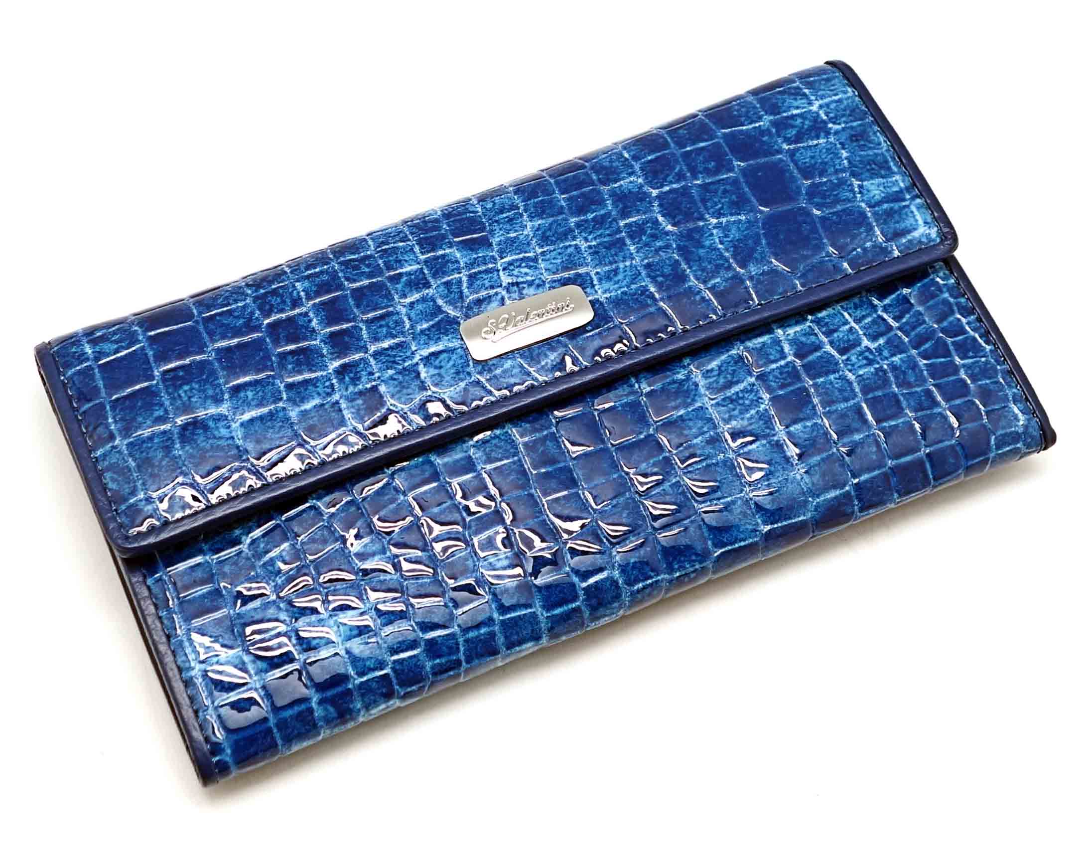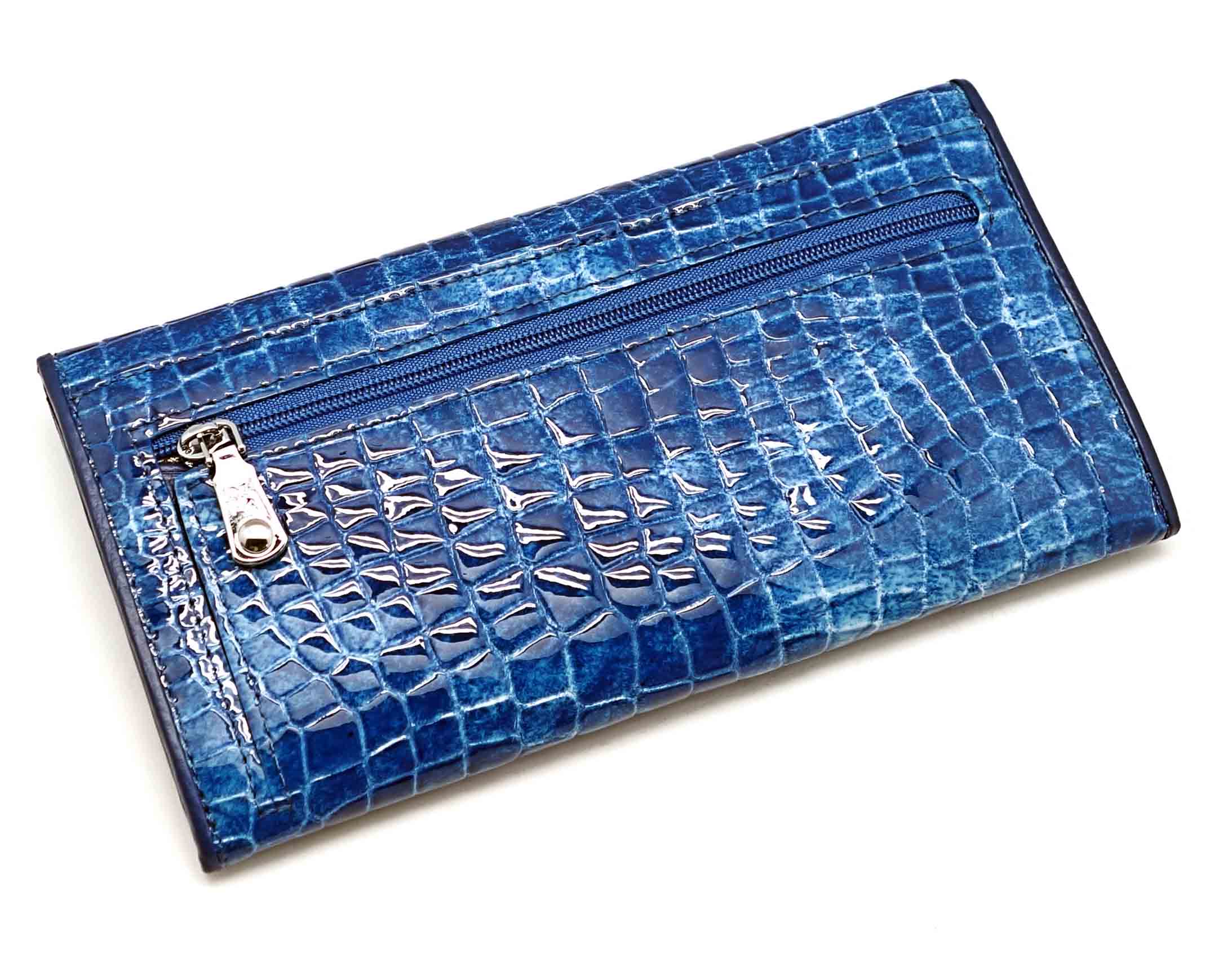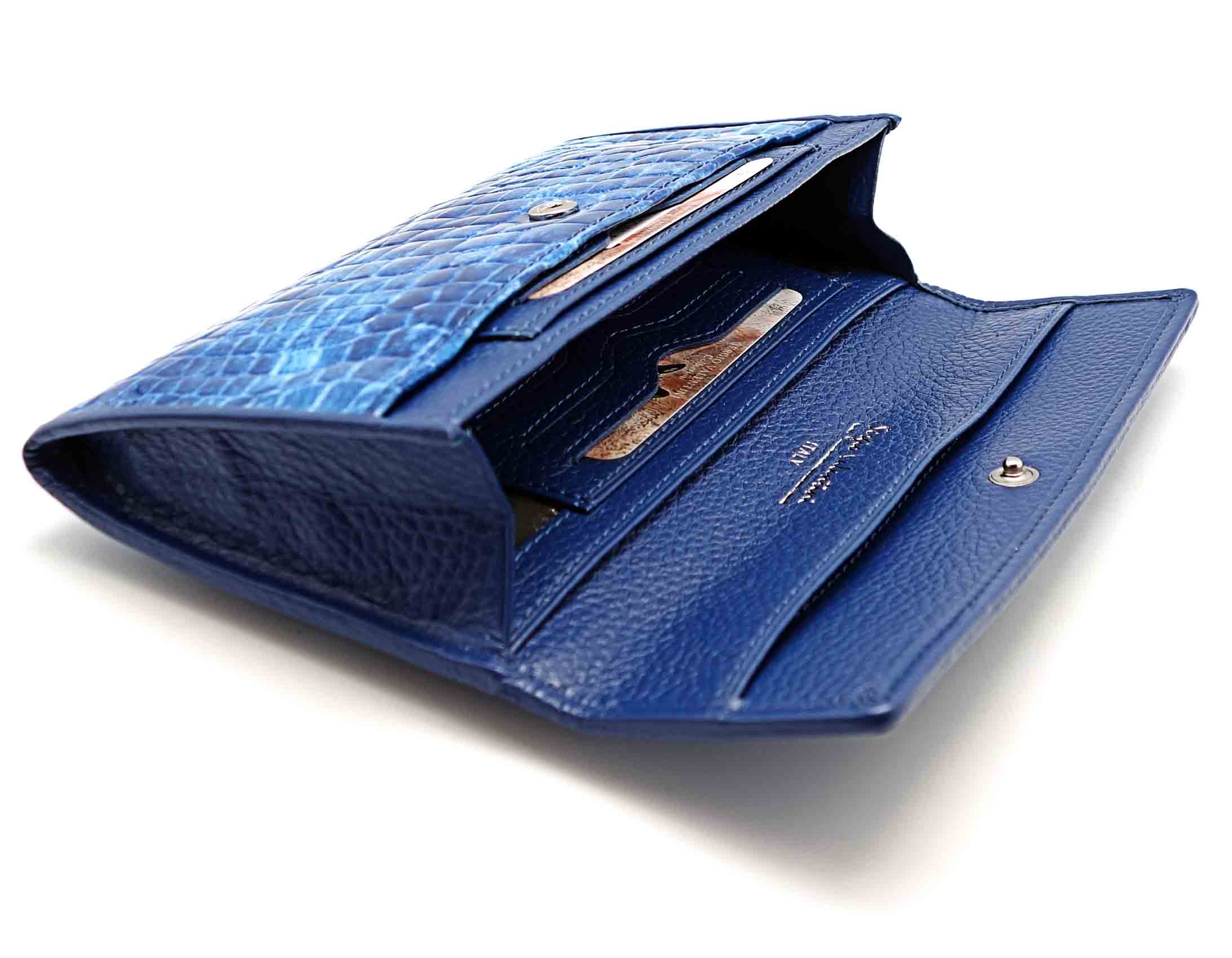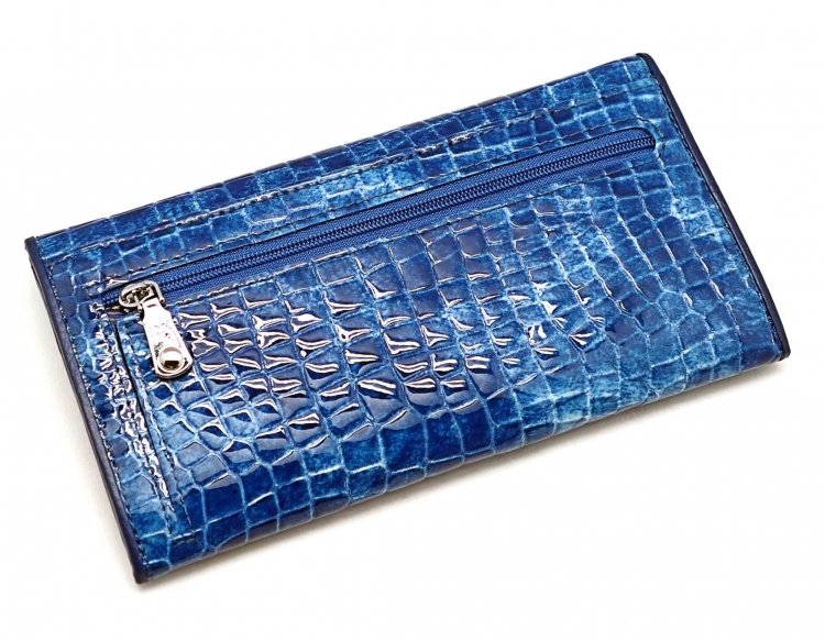 Размер 18 х 9,5 см.. Закрывается на кнопку. Внутри - одно отделение и два кармана для купюр ,8 кармашков для пластиковых карт, продольное отделение в клапане. Снаружи, на тыльной стороне - карман без застёжки и отделение для монет на молнии.