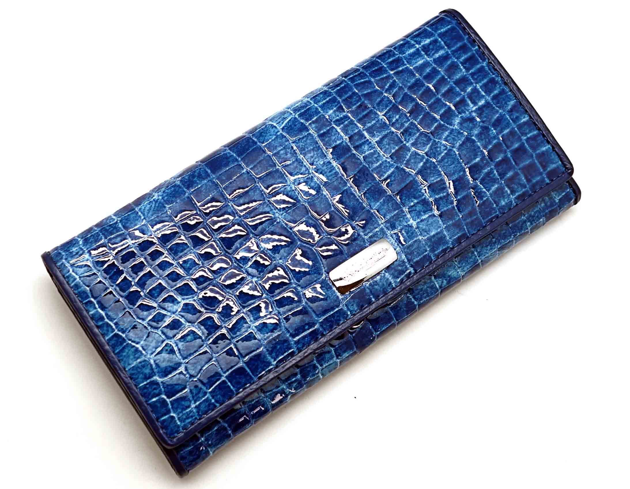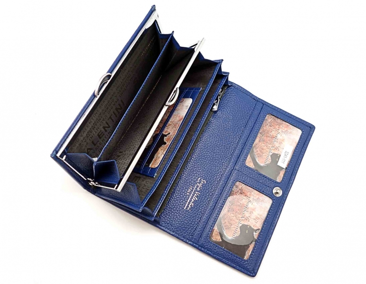 Размер 18,5 х 9.5 см. Закрывается на кнопку. Внутри - три отделения и карман для купюр, два отделения для монет под рамочным замком, карман на молнии, 7 кармашков для пластиковых карт, два прозрачных окошка, один продольный карман на створке. Снаружи, на оборотной стороне - карман без застёжки.