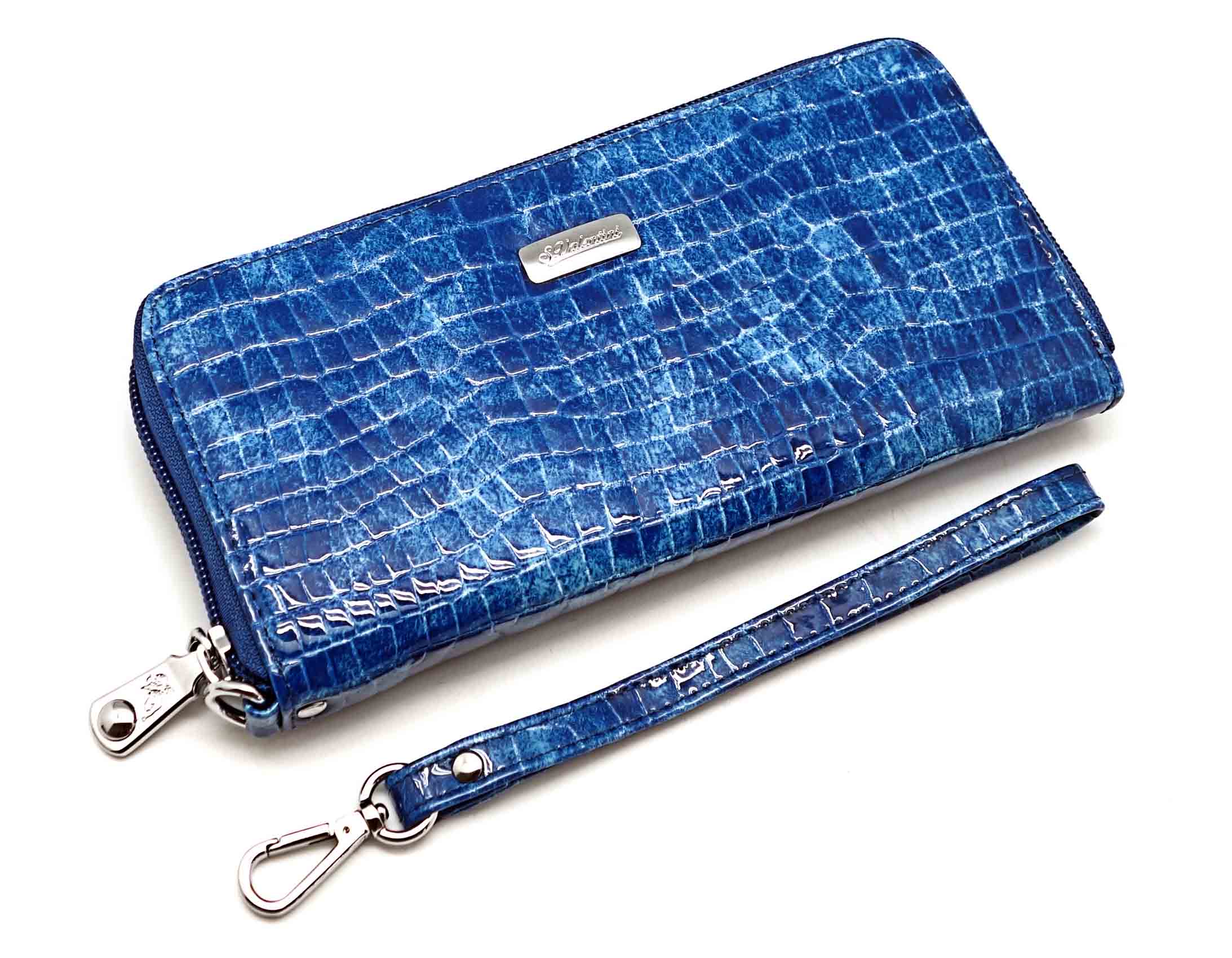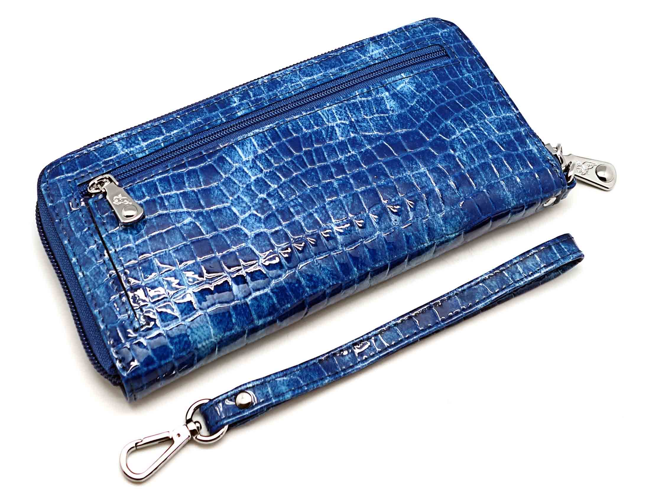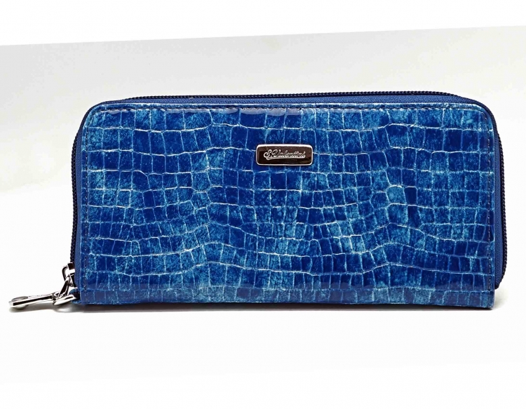 Размер 19 х 9,5 см.. Закрывается на молнию. Внутри - три отделения и два кармана для купюр, отделение для монет на молнии, 15 кармашков для пластиковых карт. Снаружи: на оборотной стороне карман на молнии, в нижней левой части металлическое полукольцо для крепления кожаного ремешка с карабином.