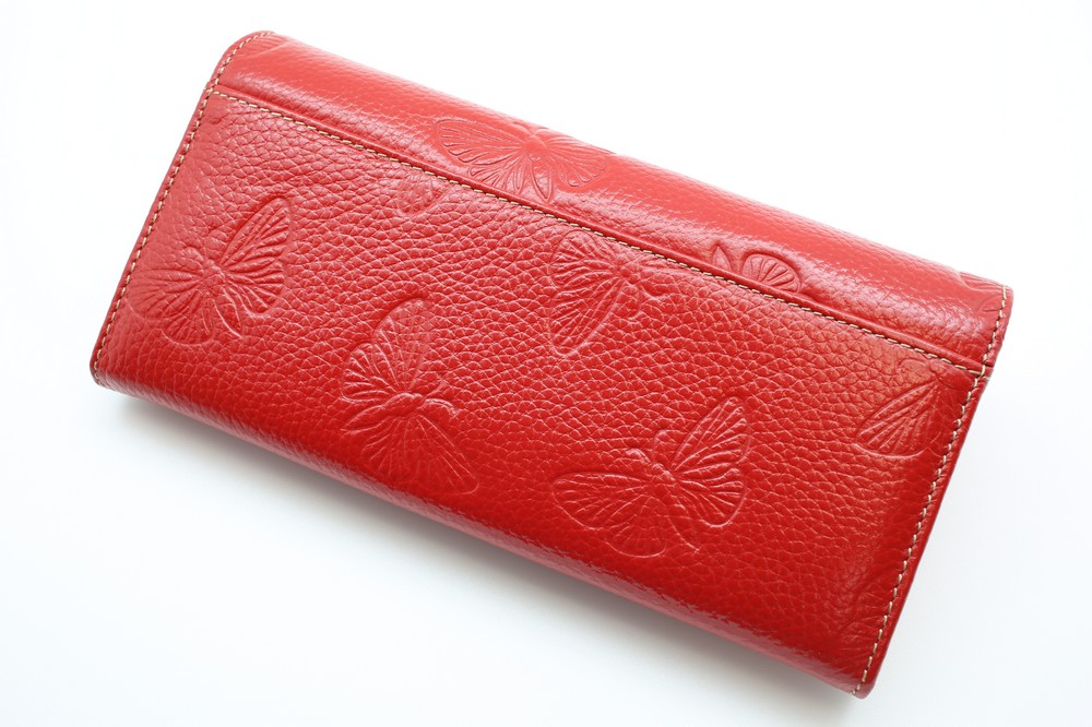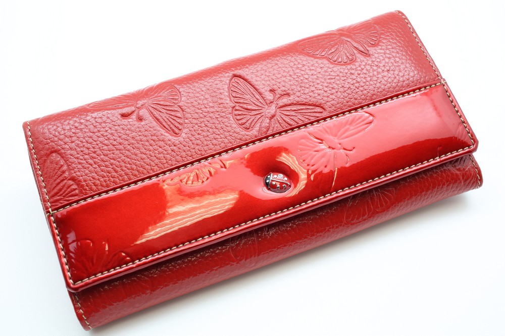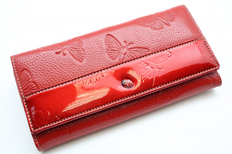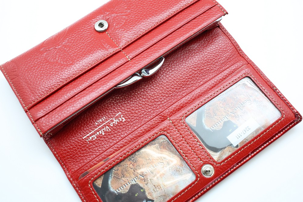 Размер 18,5 х 9.5 см. Закрывается на кнопку. Внутри - три отделения и карман для купюр, два отделения для монет под рамочным замком, карман на молнии, 7 кармашков для пластиковых карт, два прозрачных окошка, один продольный карман на створке. Снаружи, на оборотной стороне - карман без застёжки.