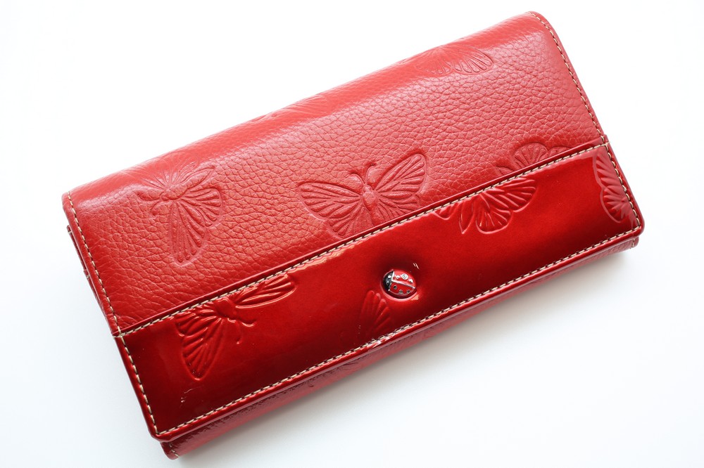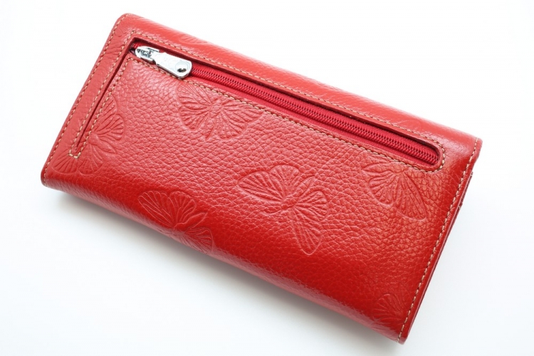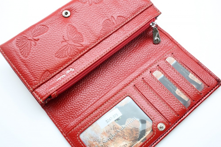 Размер 18,5 х 9 см. Закрывается на кнопку. Внутри - 4 отделения и один карман для купюр, отделение для монет на молнии, 11 кармашков для пластиковых карт, два продольных карман на створке. Снаружи, на оборотной стороне - карман на молнии.