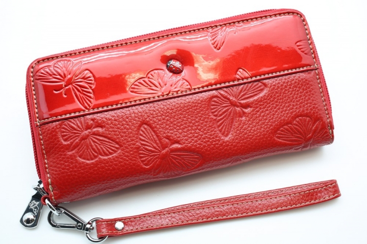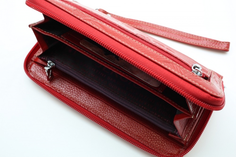 Размер 19 х 9,5 см.. Закрывается на молнию. Внутри - три отделения и два кармана для купюр, отделение для монет на молнии, 15 кармашков для пластиковых карт. Снаружи: на оборотной стороне карман на молнии, в нижней левой части металлическое полукольцо для крепления кожаного ремешка с карабином.