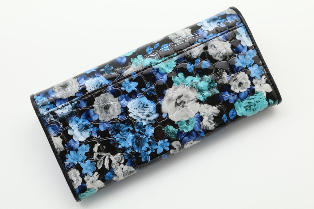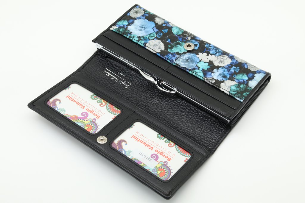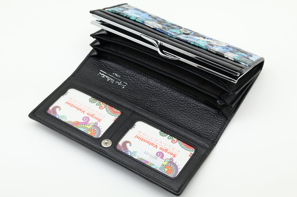 Размер 18,5 х 9.5 см. Закрывается на кнопку. Внутри - три отделения и карман для купюр, два отделения для монет под рамочным замком, карман на молнии, 7 кармашков для пластиковых карт, два прозрачных окошка, один продольный карман на створке. Снаружи, на оборотной стороне - карман без застёжки.