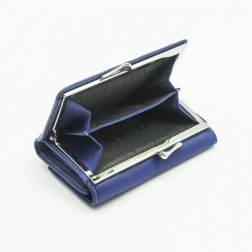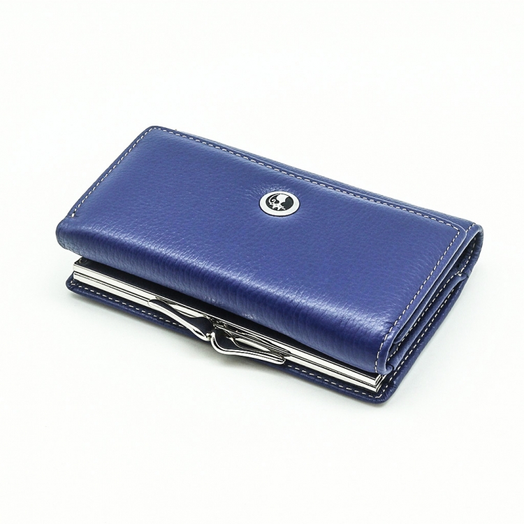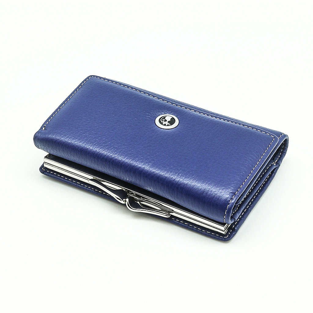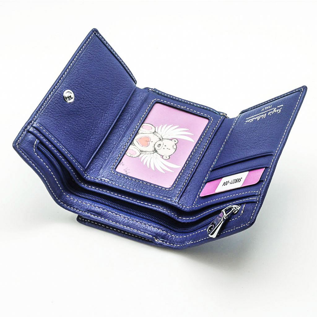 Размер 12,5 х 8,5 см. Закрывается на кнопку. Внутри - три отделения для купюр (одно на молнии), три кармашка для пластиковых карт, два боковых кармана, прозрачное окошко для фотографии. Снаружи - отделение для монет под рамочным замком.