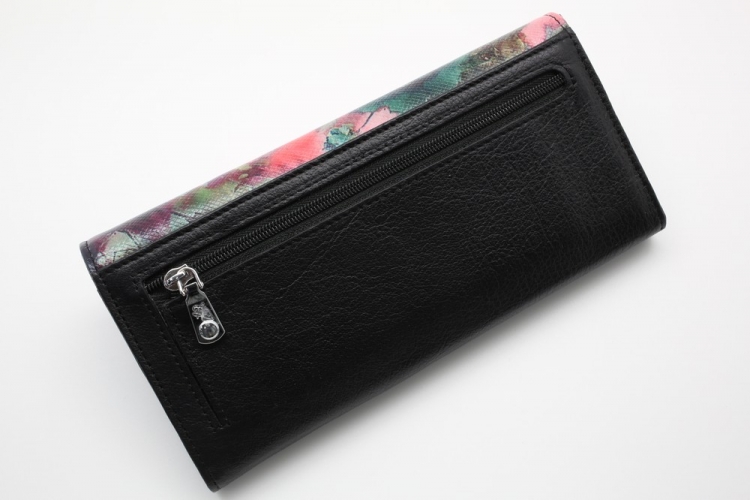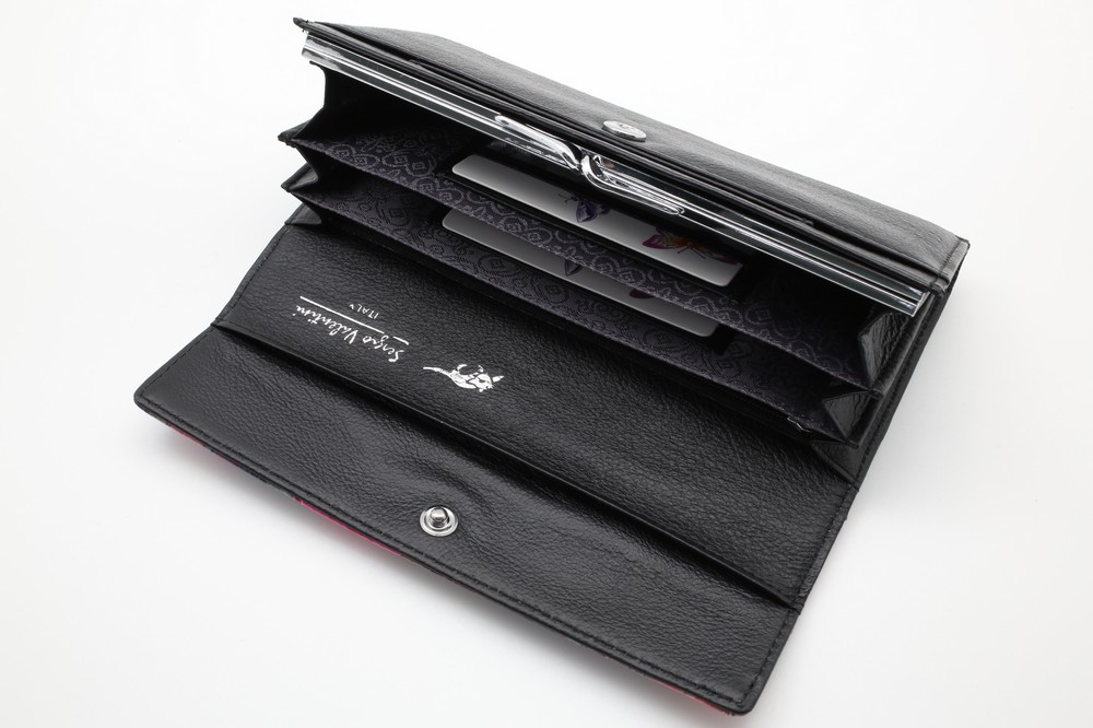 Размер 18,5 х 9,5 см. Закрывается на кнопку. Внутри - три отделения и два кармана для купюр, два отделения для монет под рамочным замком, карман на молнии, 9 кармашков для пластиковых карт, продольный карман на клапане. Снаружи, на тыльной стороне, два кармана- открытый и на молнии.