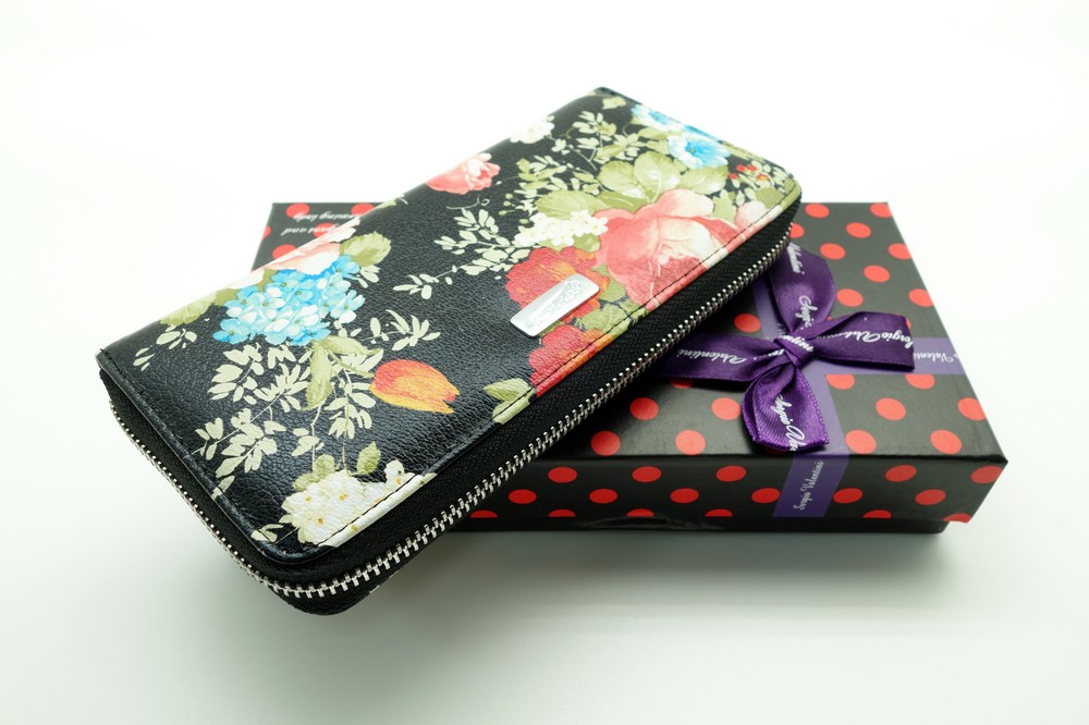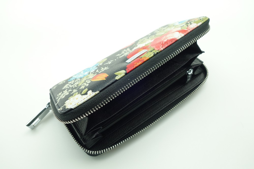 Размер 19 х 9,5 см. Закрывается на молнию. Внутри - три отделения и два кармана для купюр, отделение для монет на молнии, 9 кармашков для пластиковых карт.