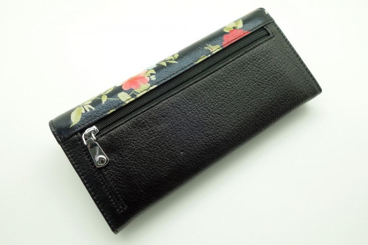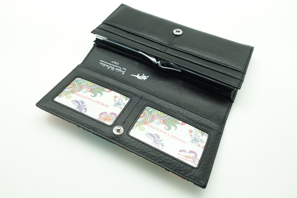 Размер 18,5 х 9.5 см. Закрывается на кнопку. Внутри - три отделения и карман для купюр, два отделения для монет под рамочным замком, карман на молнии, 7 кармашков для пластиковых карт, два прозрачных окошка и продольный карман на створке. Снаружи, на оборотной стороне, карман на молнии.