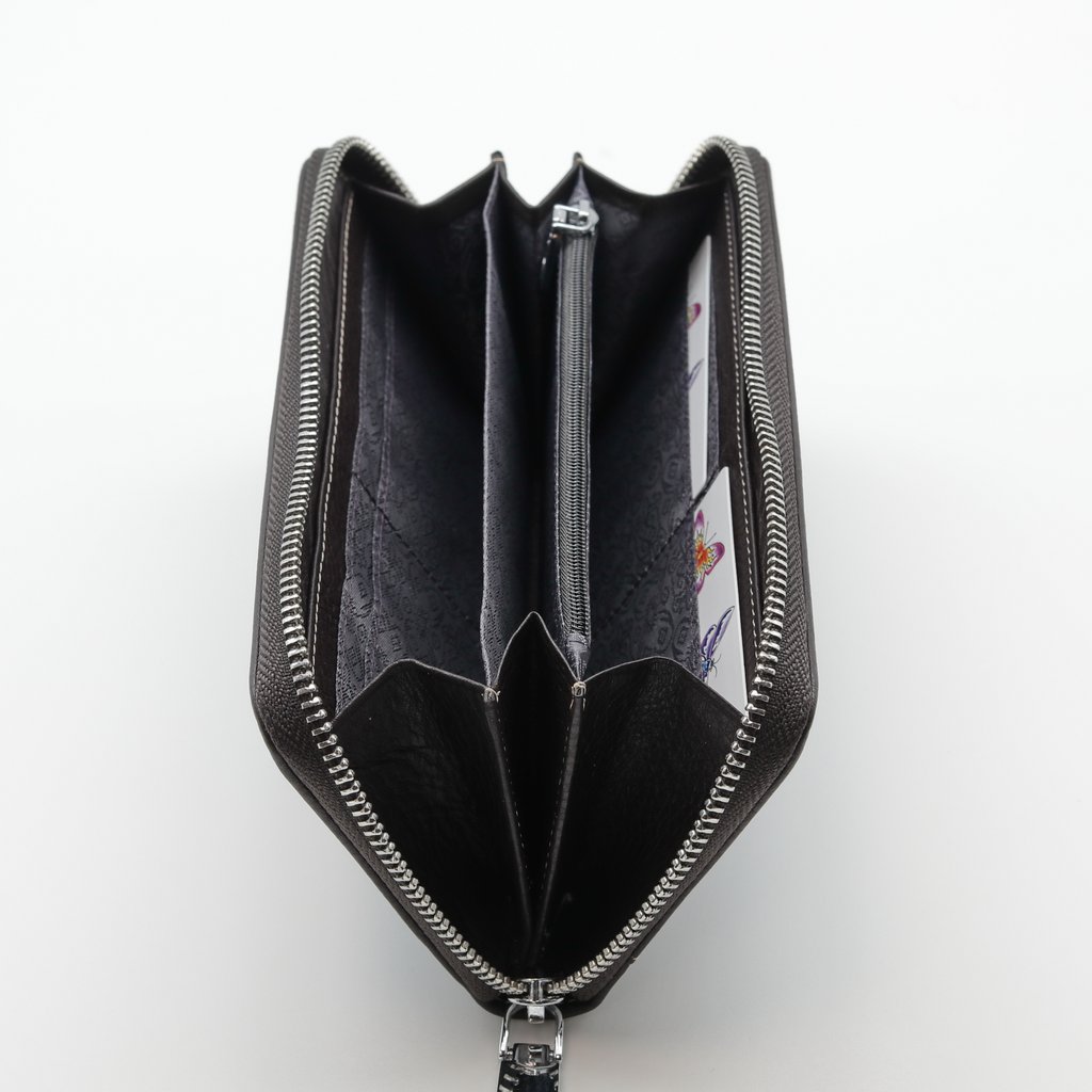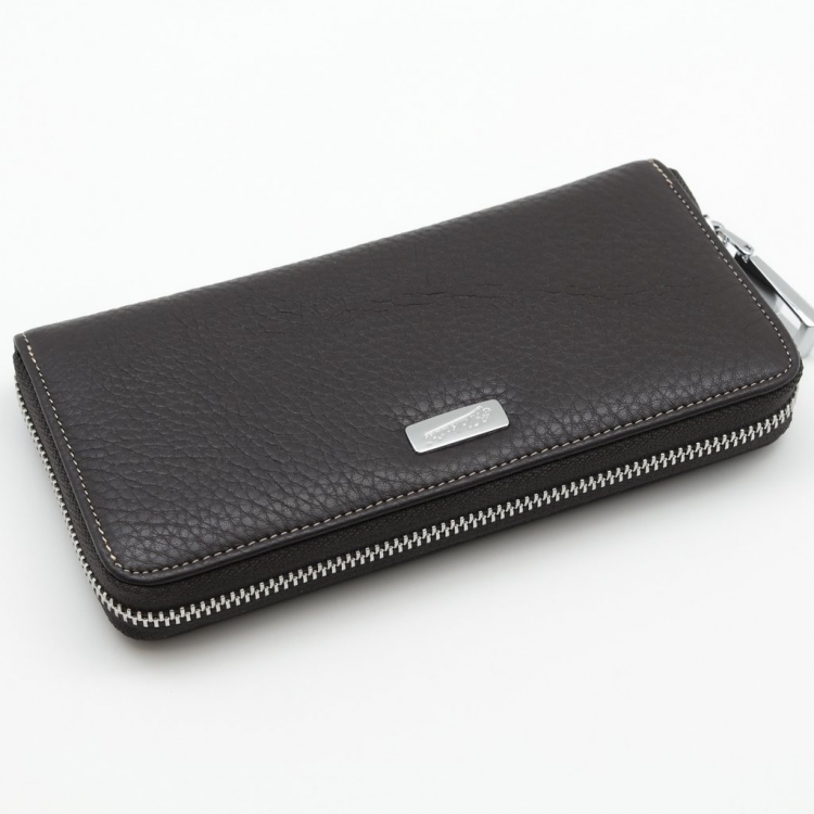 Изготовлено из натуральной кожи тёмно- коричневого цвета. Размер 19 х 9,5 см. Закрывается на молнию. Внутри - три отделения и два кармана для купюр, отделение для монет на молнии, 9 кармашков для пластиковых карт.