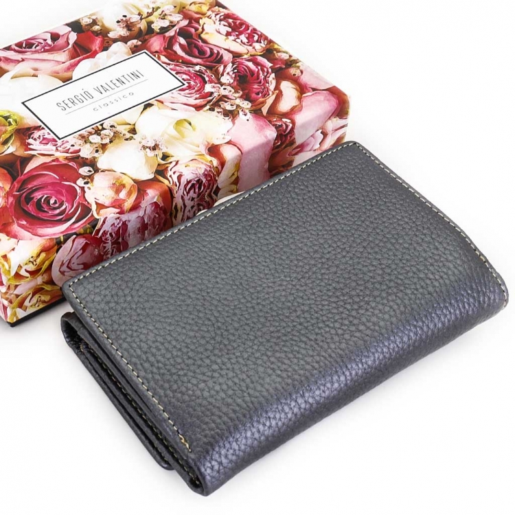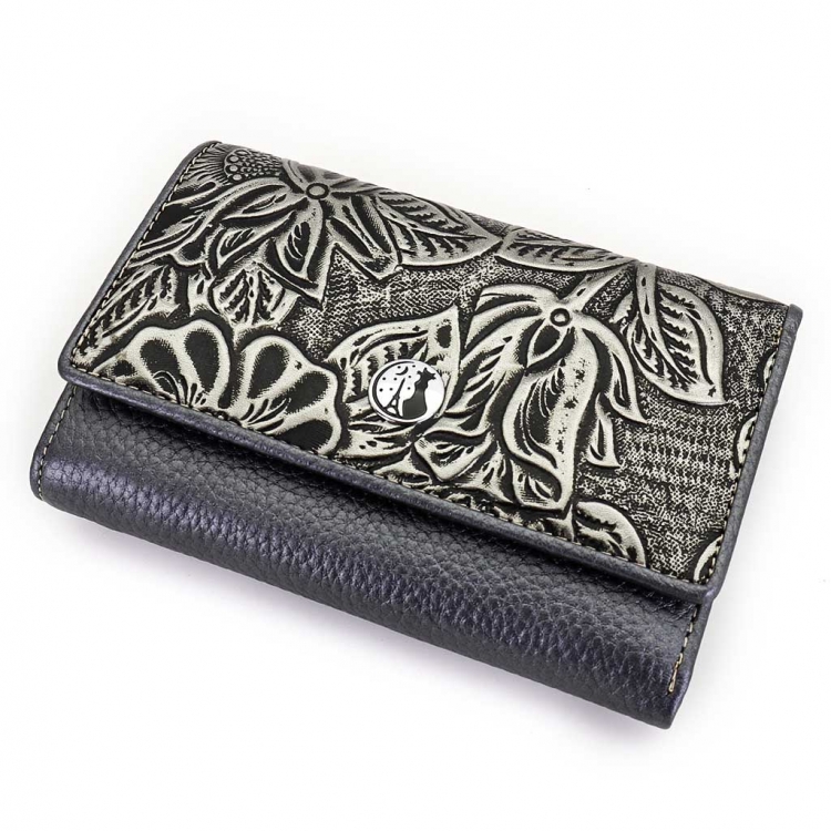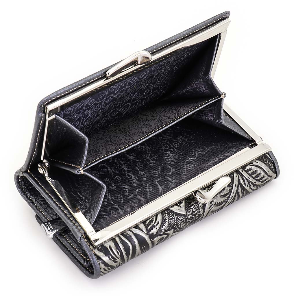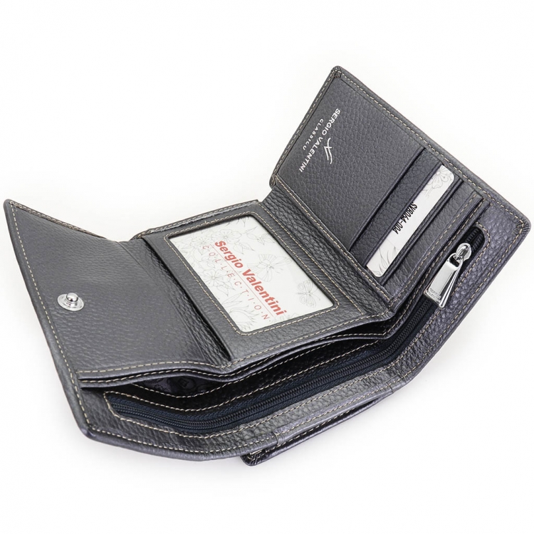 Размер 12,5 х 8,5 см. Закрывается на кнопку. Внутри - три отделения для купюр (одно на молнии), три кармашка для пластиковых карт, два боковых кармана, прозрачное окошко для фотографии. Снаружи - отделение для монет под рамочным замком.