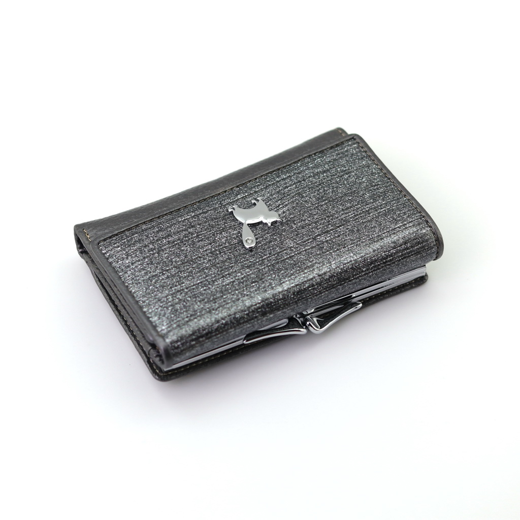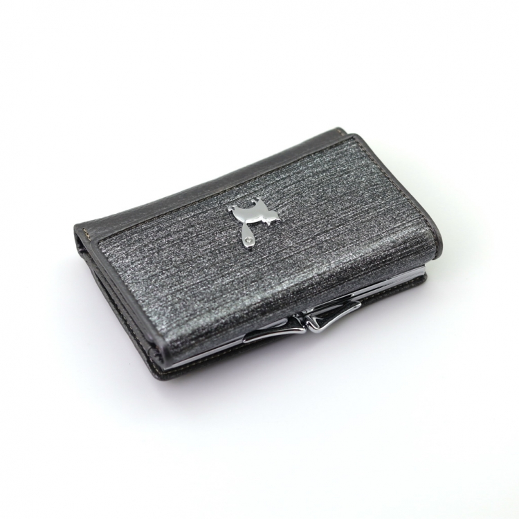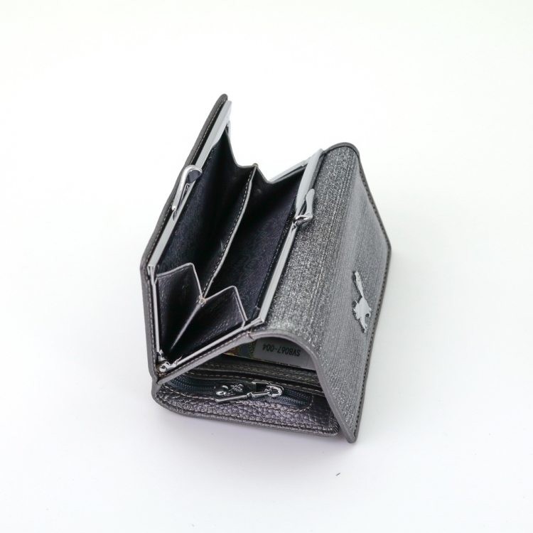 Размер 12,5 х 8,5 см. Закрывается на кнопку. Внутри - три отделения для купюр (одно на молнии), три кармашка для пластиковых карт, два боковых кармана, прозрачное окошко для фотографии. Снаружи - отделение для монет под рамочным замком.
