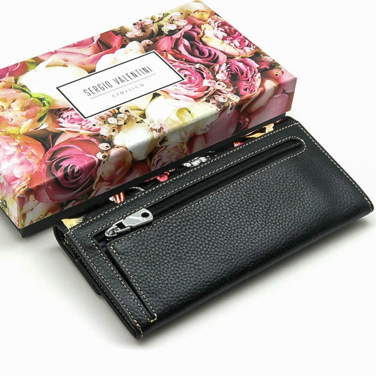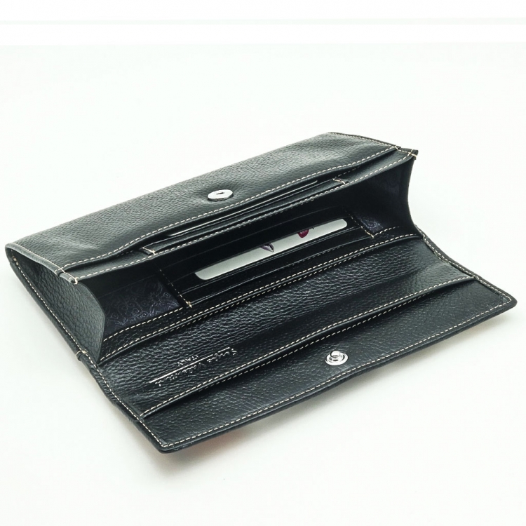 Размер 18,5 х 9,5 см.. Закрывается на кнопку. Внутри - одно отделение и два кармана для купюр ,8 кармашков для пластиковых карт, продольное отделение в клапане. Снаружи, на тыльной стороне - карман без застёжки и отделение для монет на молнии.
