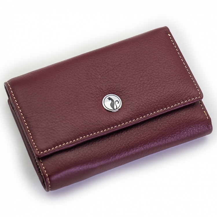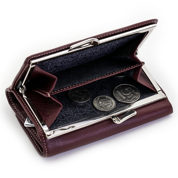 Размер 12,5 х 8,5 см. Закрывается на кнопку. Внутри - три отделения для купюр (одно на молнии), три кармашка для пластиковых карт, два боковых кармана, прозрачное окошко для фотографии. Снаружи - отделение для монет под рамочным замком.