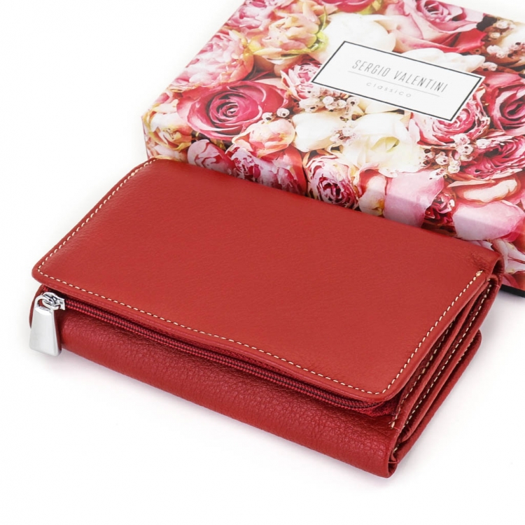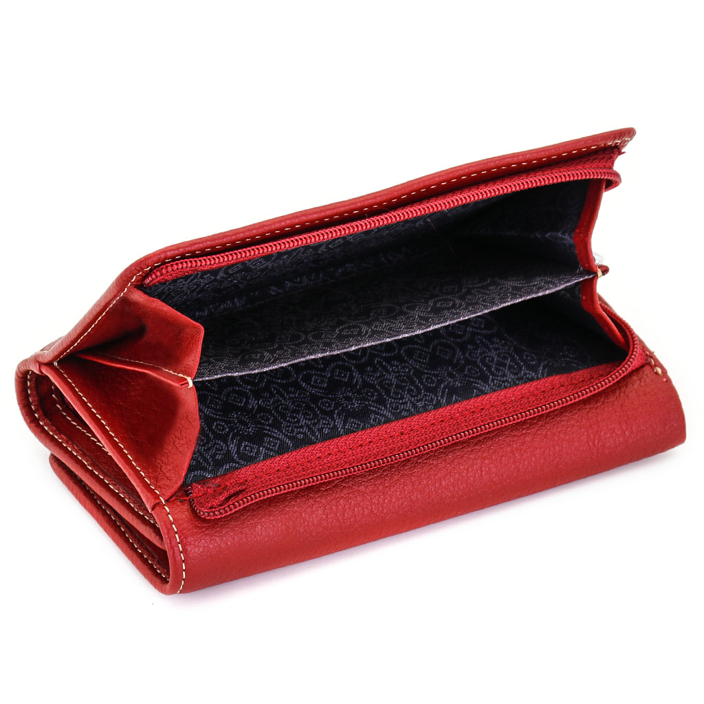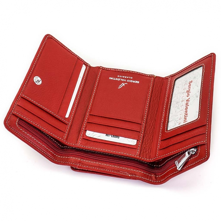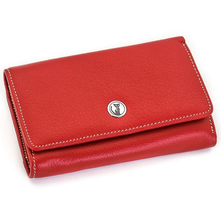 Размер 14 х 9 см. Закрывается на кнопку. Внутри - три отделения для купюр (одно на молнии), девять кармашков для пластиковых карт, четыре боковых кармана, прозрачное окошко для фотографии. Снаружи - отделение для монет на молнии