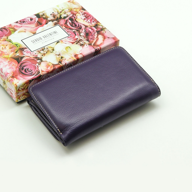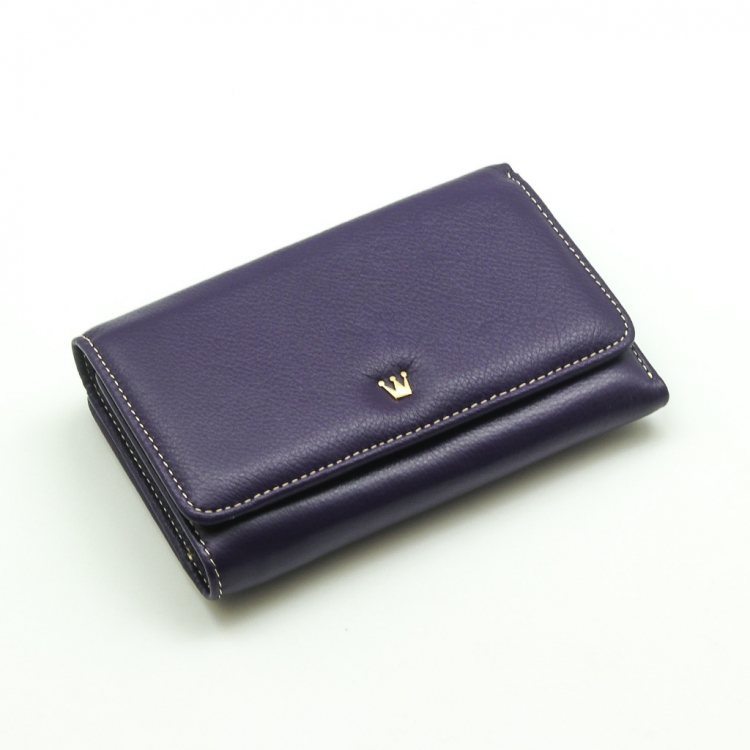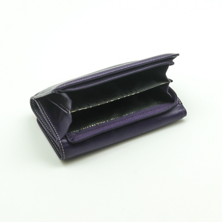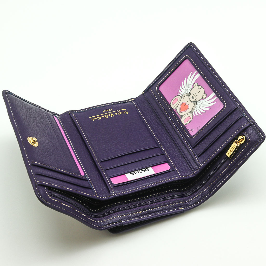 Размер 14 х 9 см. Закрывается на кнопку. Внутри - три отделения для купюр (одно на молнии), девять кармашков для пластиковых карт, четыре боковых кармана, прозрачное окошко для фотографии. Снаружи - отделение для монет на молнии