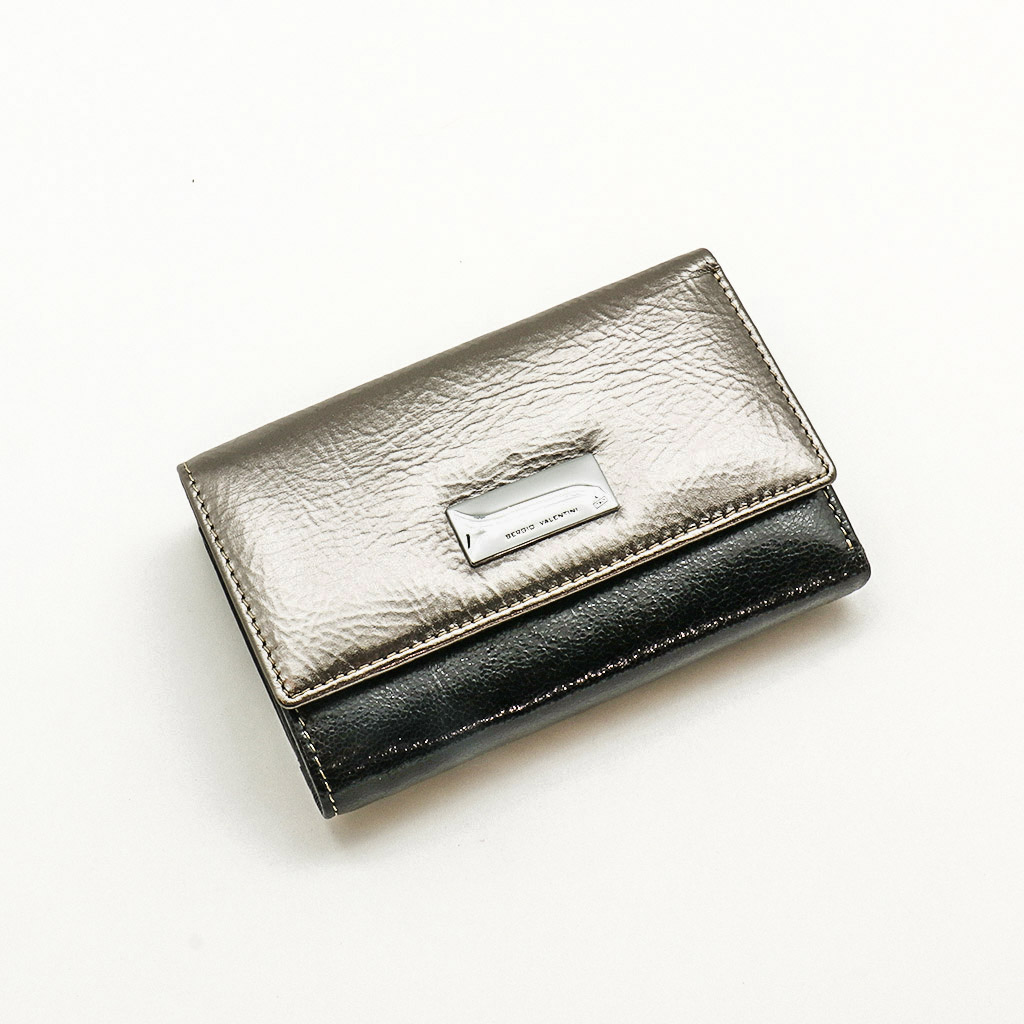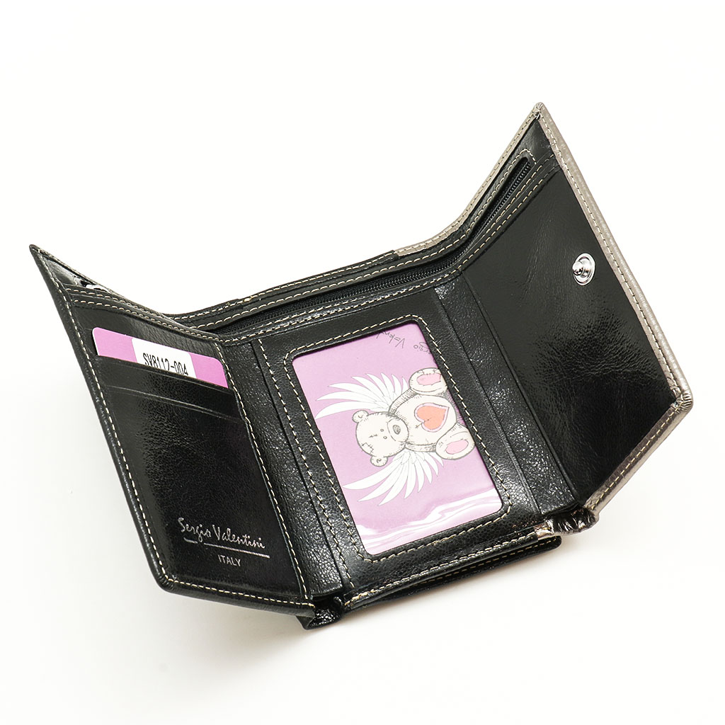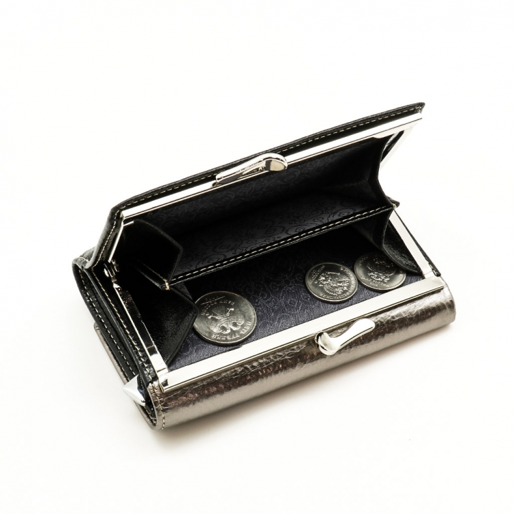 Размер 12,5 х 8,5 см. Закрывается на кнопку. Внутри - три отделения для купюр (одно на молнии), три кармашка для пластиковых карт, два боковых кармана, прозрачное окошко для фотографии. Снаружи - отделение для монет под рамочным замком.