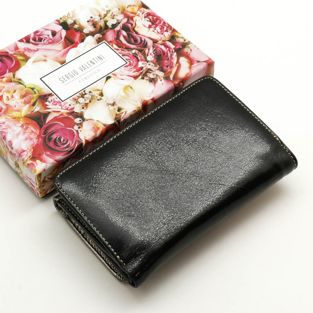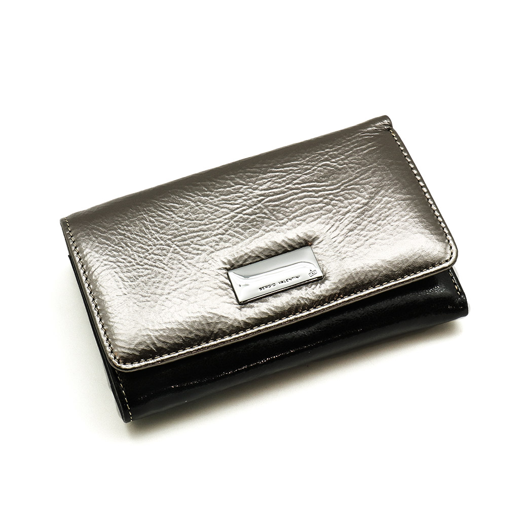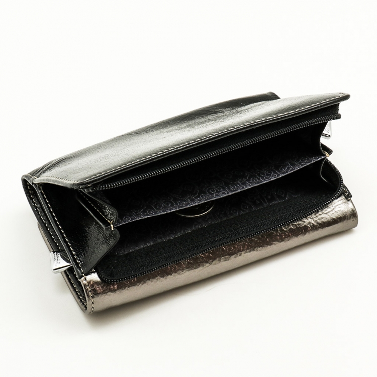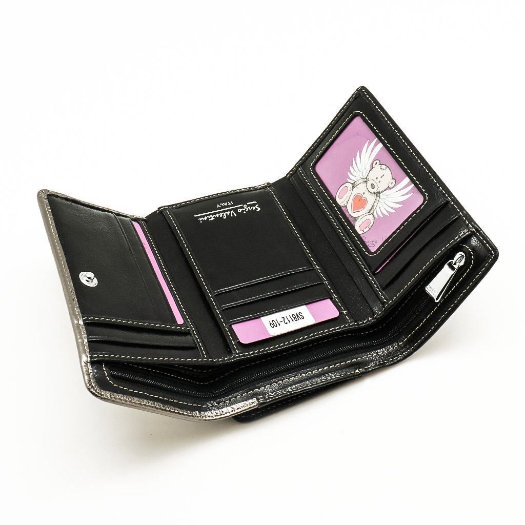 Размер 14 х 9 см. Закрывается на кнопку. Внутри - три отделения для купюр (одно на молнии), девять кармашков для пластиковых карт, четыре боковых кармана, прозрачное окошко для фотографии. Снаружи - отделение для монет на молнии