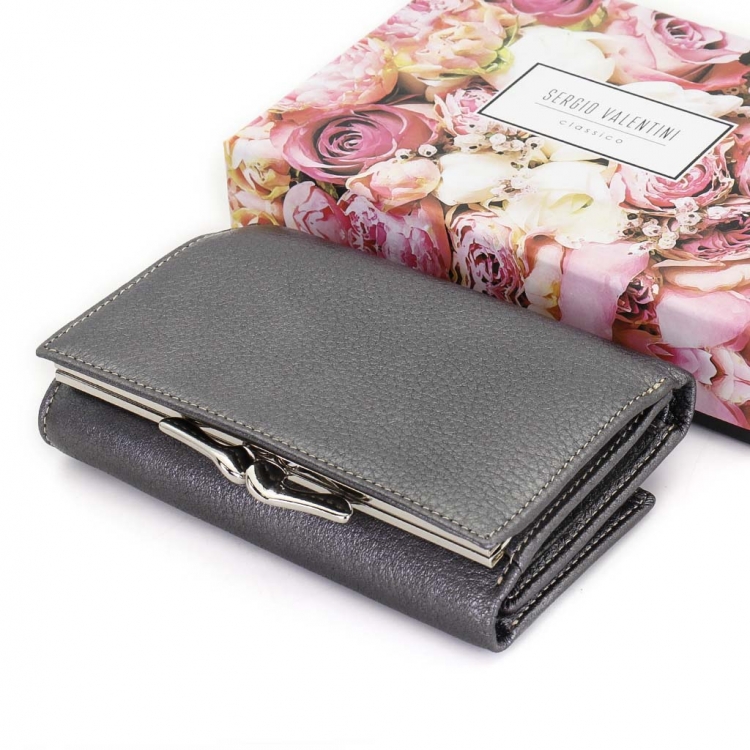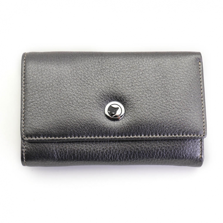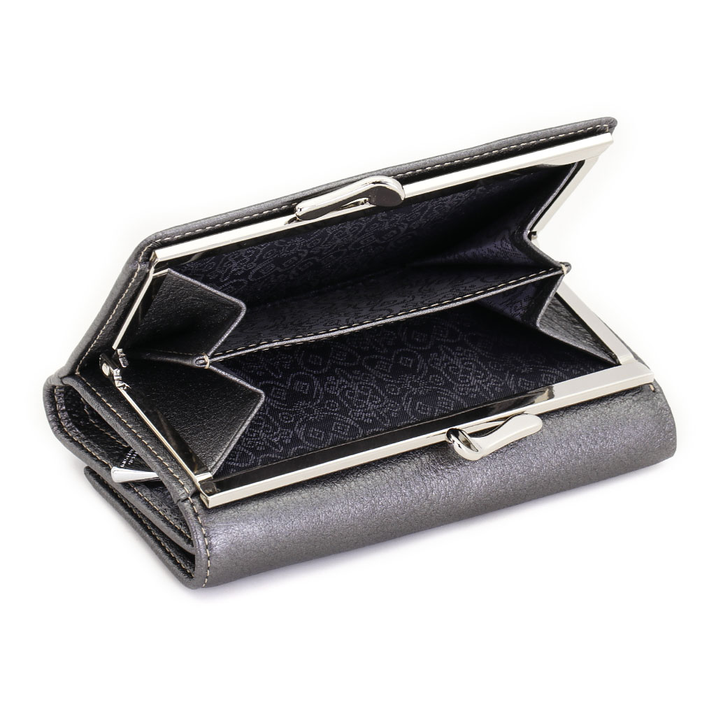Размер 12,5 х 8,5 см. Закрывается на кнопку. Внутри - три отделения для купюр (одно на молнии), три кармашка для пластиковых карт, два боковых кармана, прозрачное окошко для фотографии. Снаружи - отделение для монет под рамочным замком.