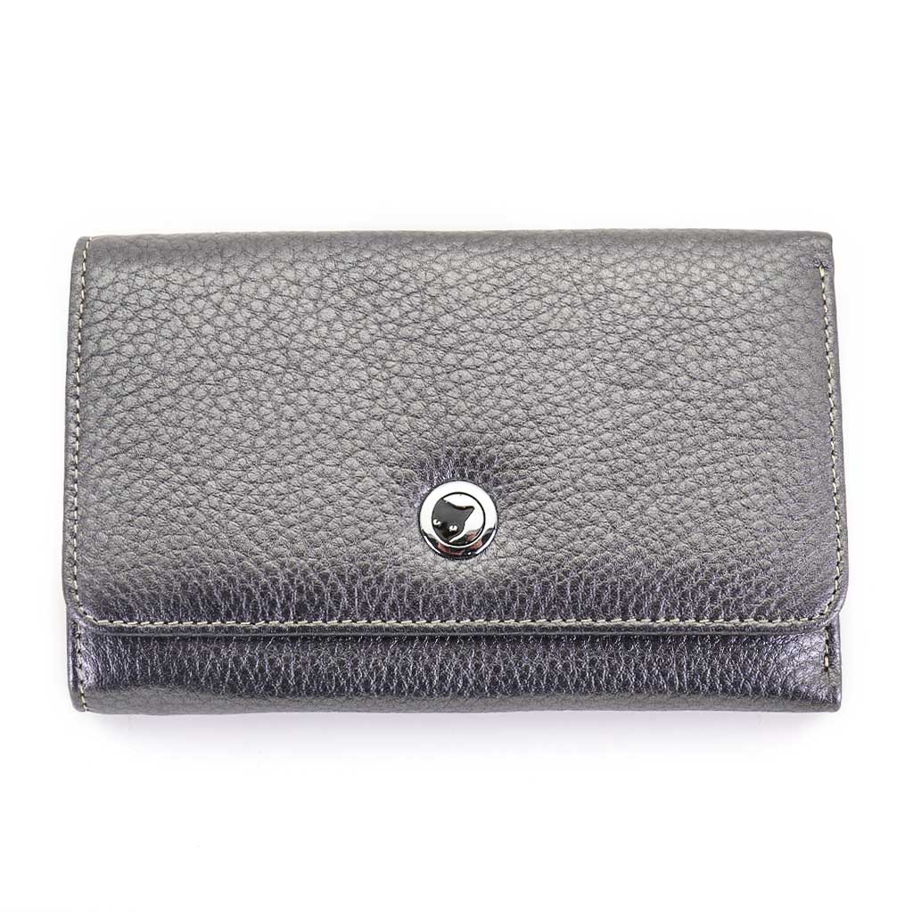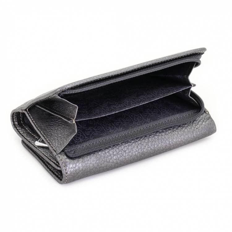 Размер 14 х 9 см. Закрывается на кнопку. Внутри - три отделения для купюр (одно на молнии), девять кармашков для пластиковых карт, четыре боковых кармана, прозрачное окошко для фотографии. Снаружи - отделение для монет на молнии