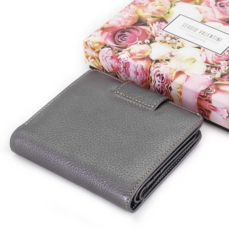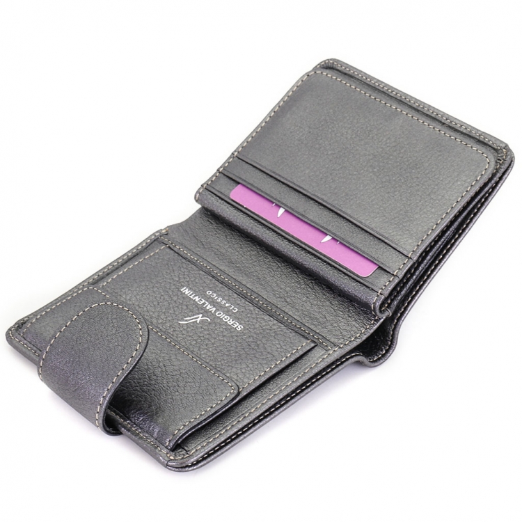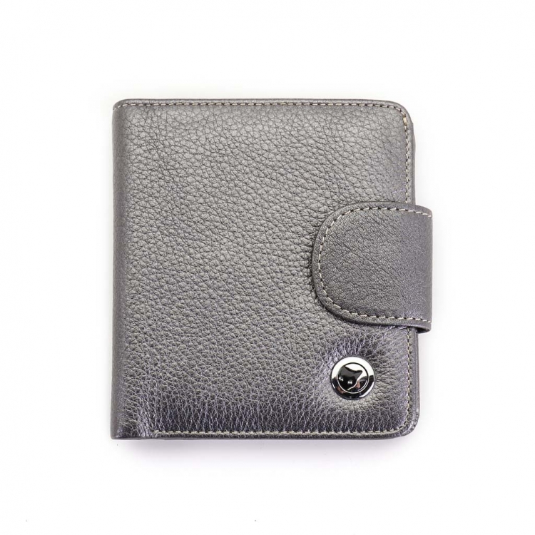 Размер 10 х 11 см. Закрывается на хлястик с кнопкой. Внутри - два отделения для купюр, шесть кармашков для пластиковых карт, два боковых кармана, прозрачное окошко для фотографии, карман для монет на кнопке.