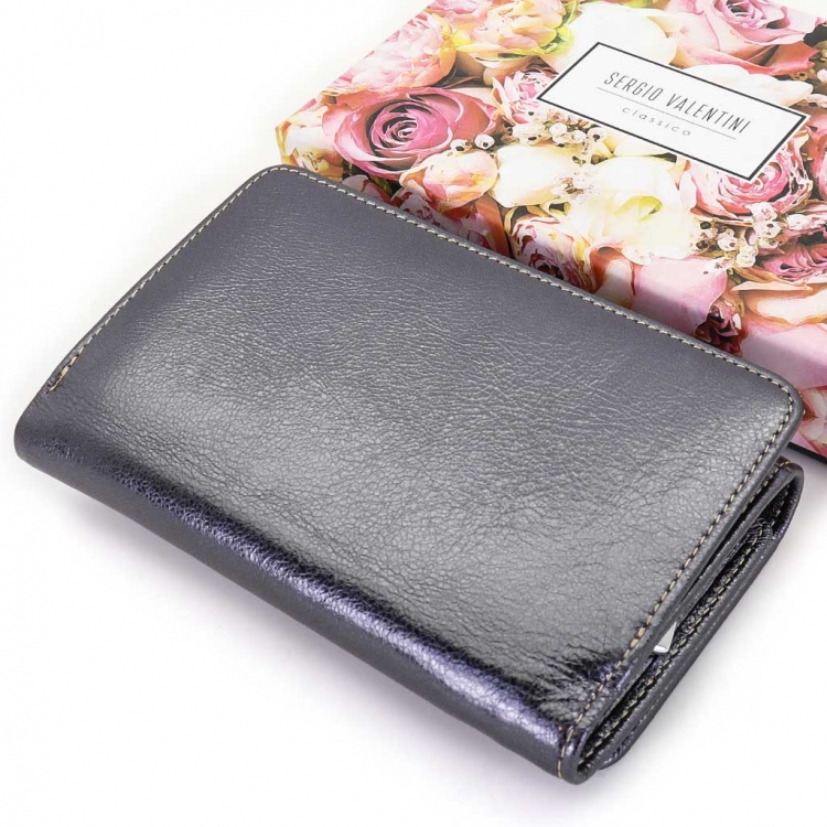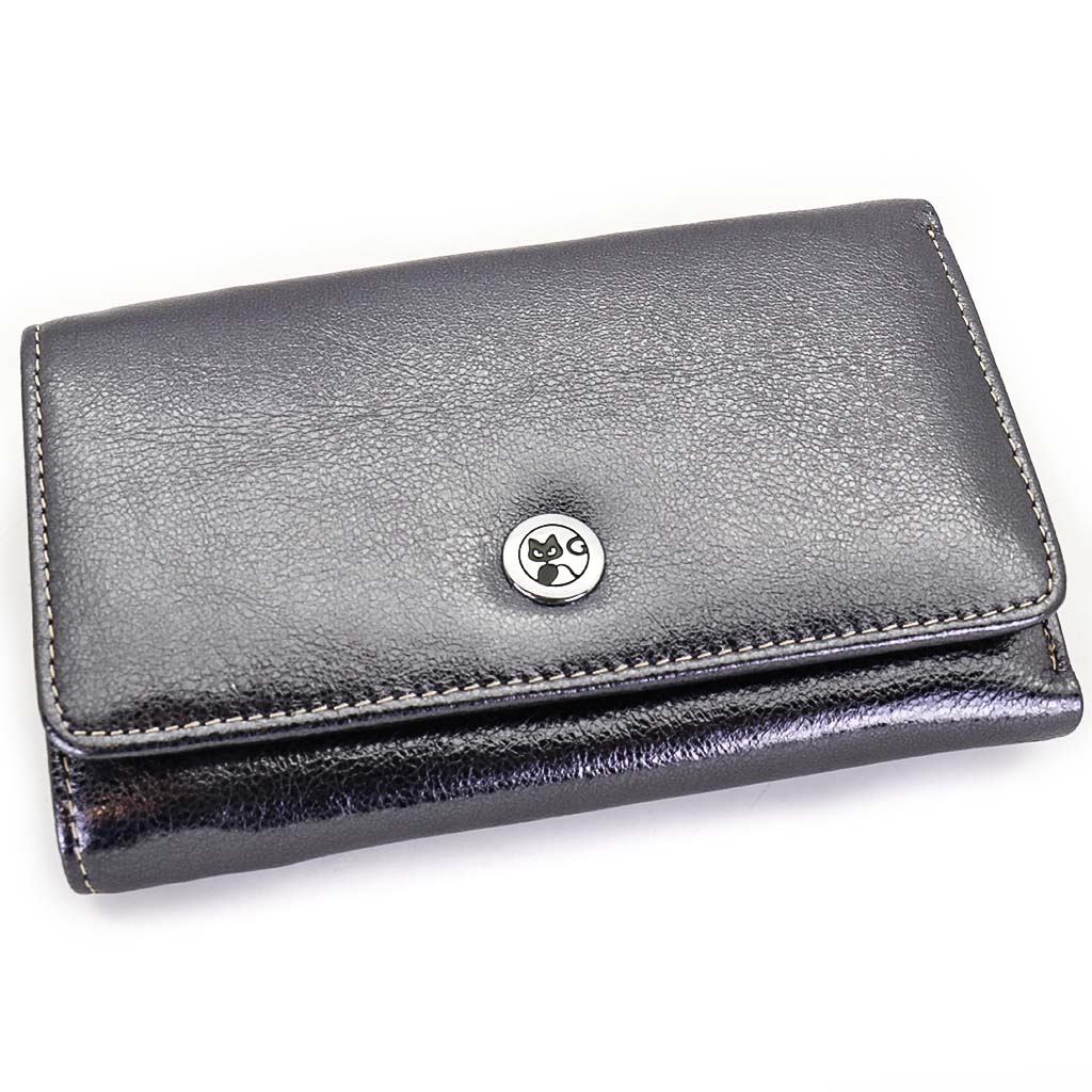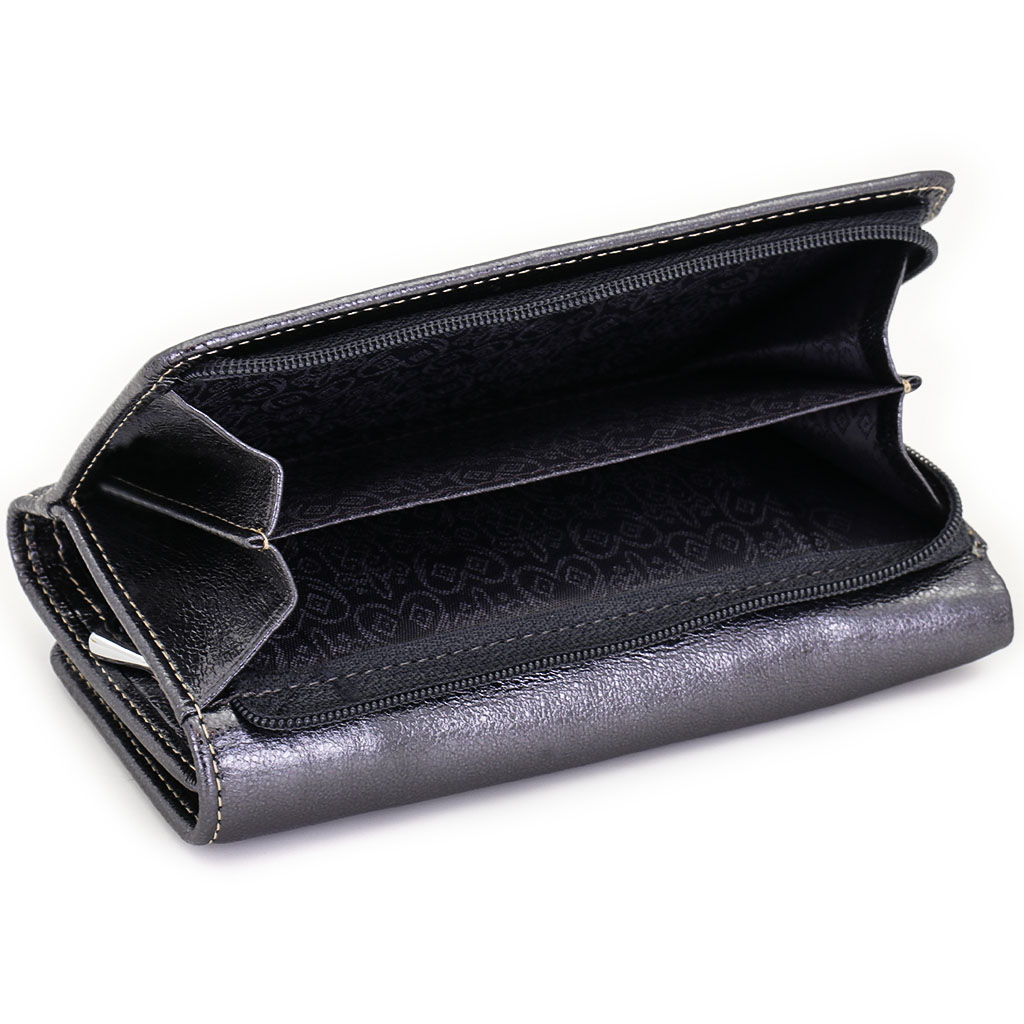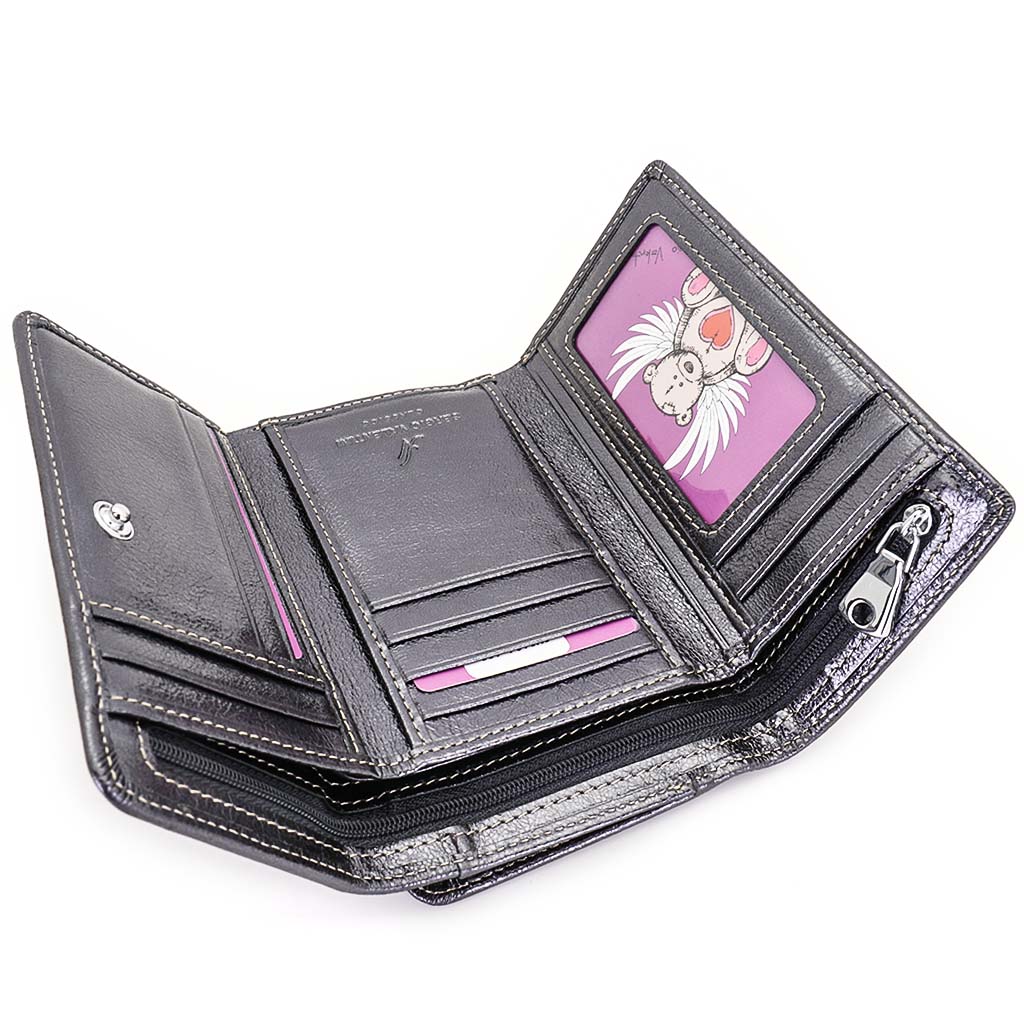 Размер 14 х 9 см. Закрывается на кнопку. Внутри - три отделения для купюр (одно на молнии), девять кармашков для пластиковых карт, четыре боковых кармана, прозрачное окошко для фотографии. Снаружи - отделение для монет на молнии
