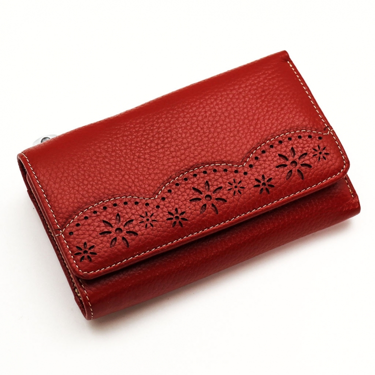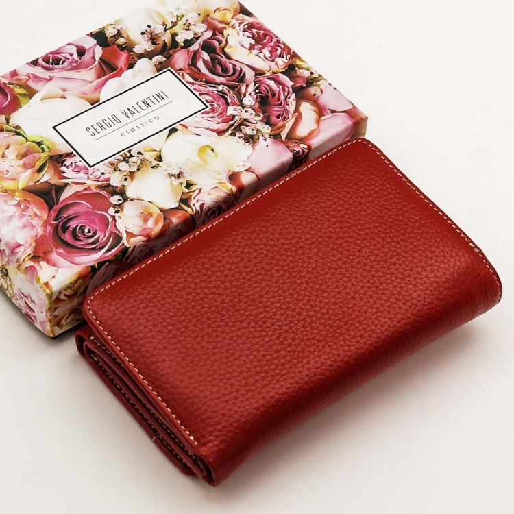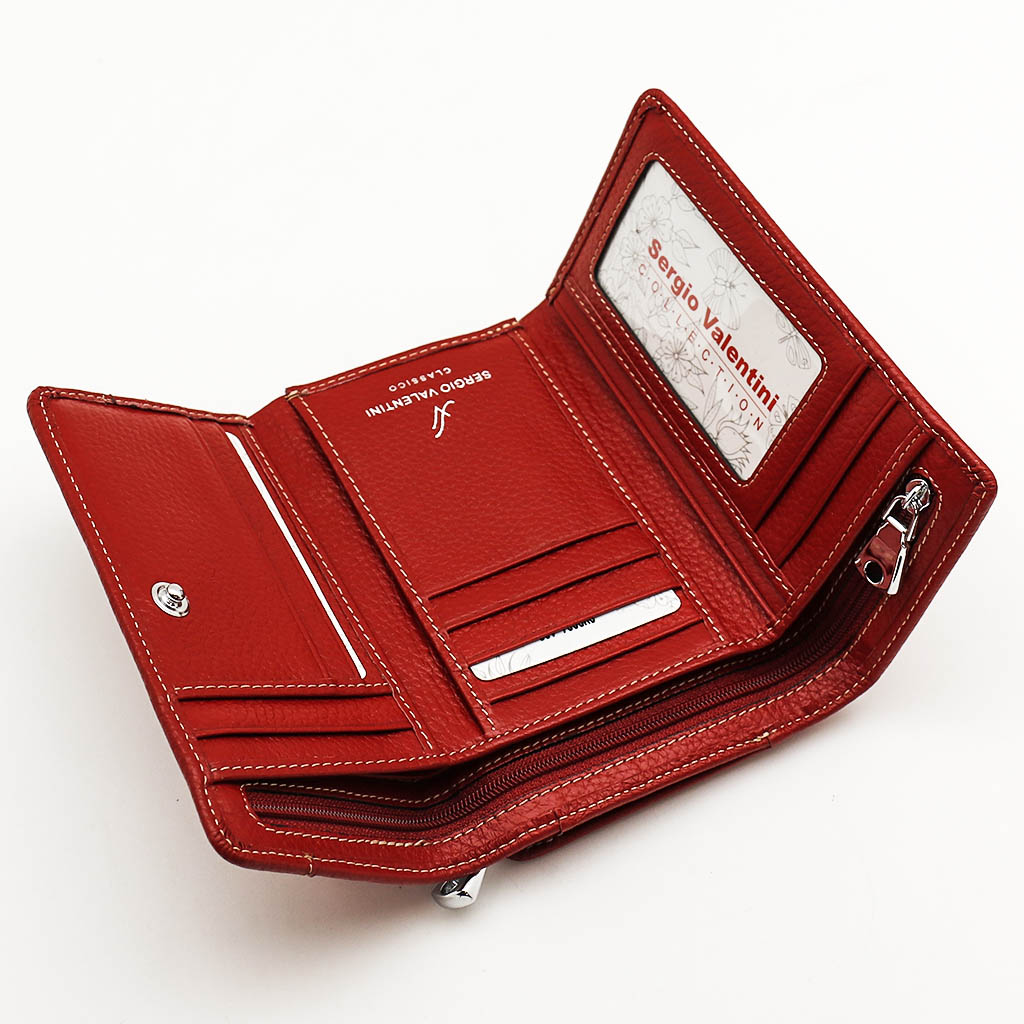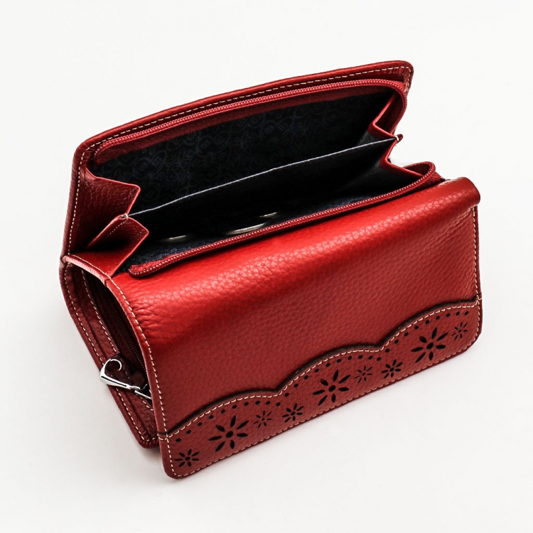 Размер 14 х 9 см. Закрывается на кнопку. Внутри - три отделения для купюр (одно на молнии), девять кармашков для пластиковых карт, четыре боковых кармана, прозрачное окошко для фотографии. Снаружи - отделение для монет на молнии
