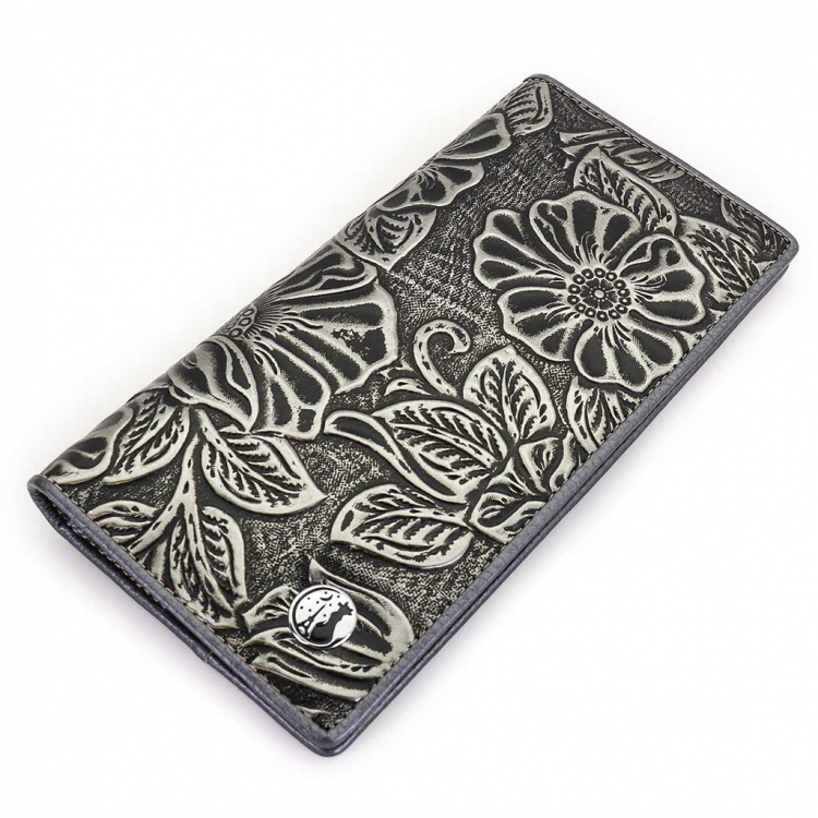 Размер 9 х 18 см. Закрывается на кнопку. Имеет три кармана для купюр, отделение для монет на молнии, четыре кармашка для карточек и прозрачное окошко для фотографии.