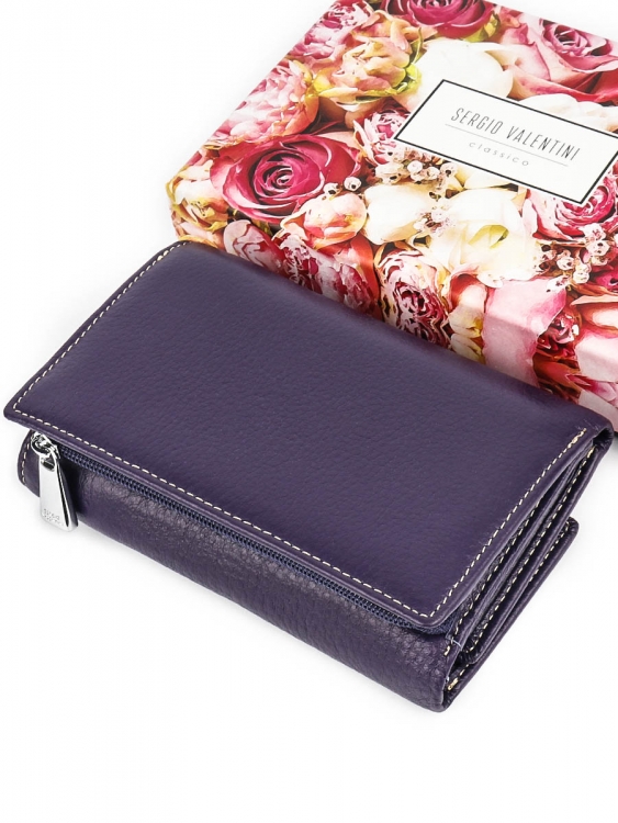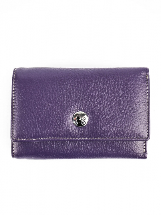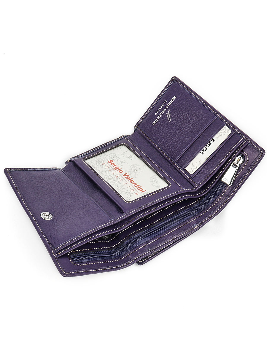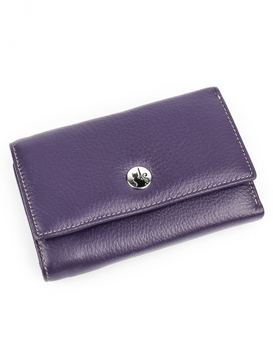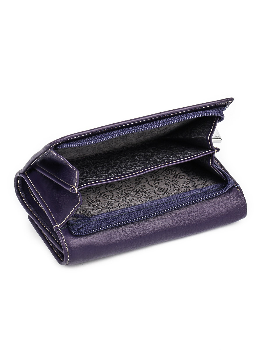 Размер 12,5 х 9 см.. Закрывается на кнопку. Внутри - три отделения для купюр (одно на молнии), три кармашка для пластиковых карт, два боковых кармана, прозрачное окошко для фотографии. Снаружи - отделение для монет на молнии.