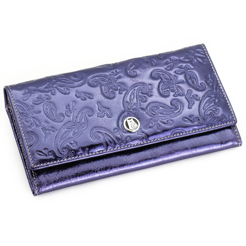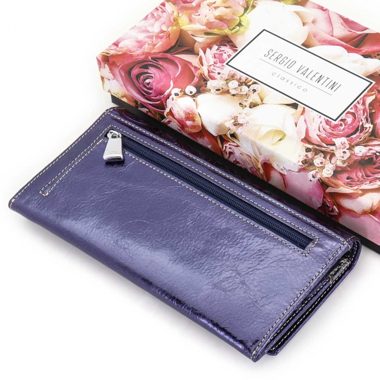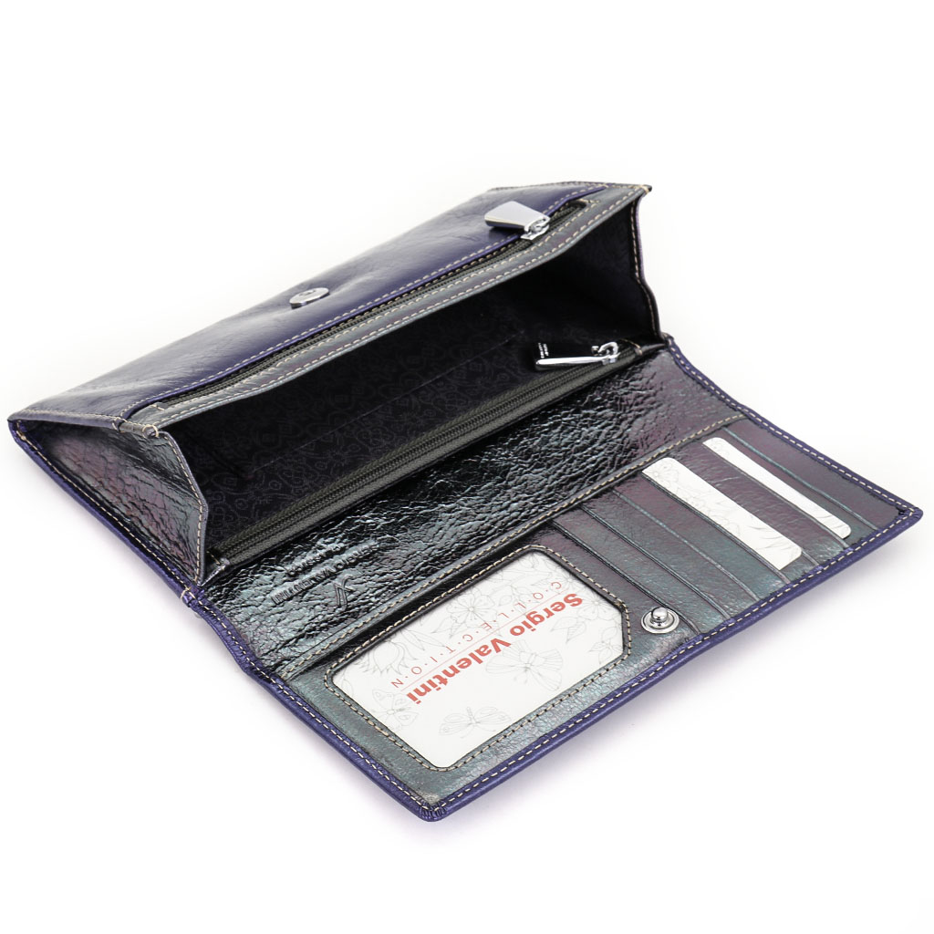 Размер 18 х 10 см. Закрывается на кнопку. Внутри - одно отделение и два кармана для купюр ,13 кармашков для пластиковых карт, два кармана на молнии, продольное отделение в клапане, прозрачное окно для фотографии. Снаружи, на тыльной стороне - карман без застёжки и отделение для монет на молнии.