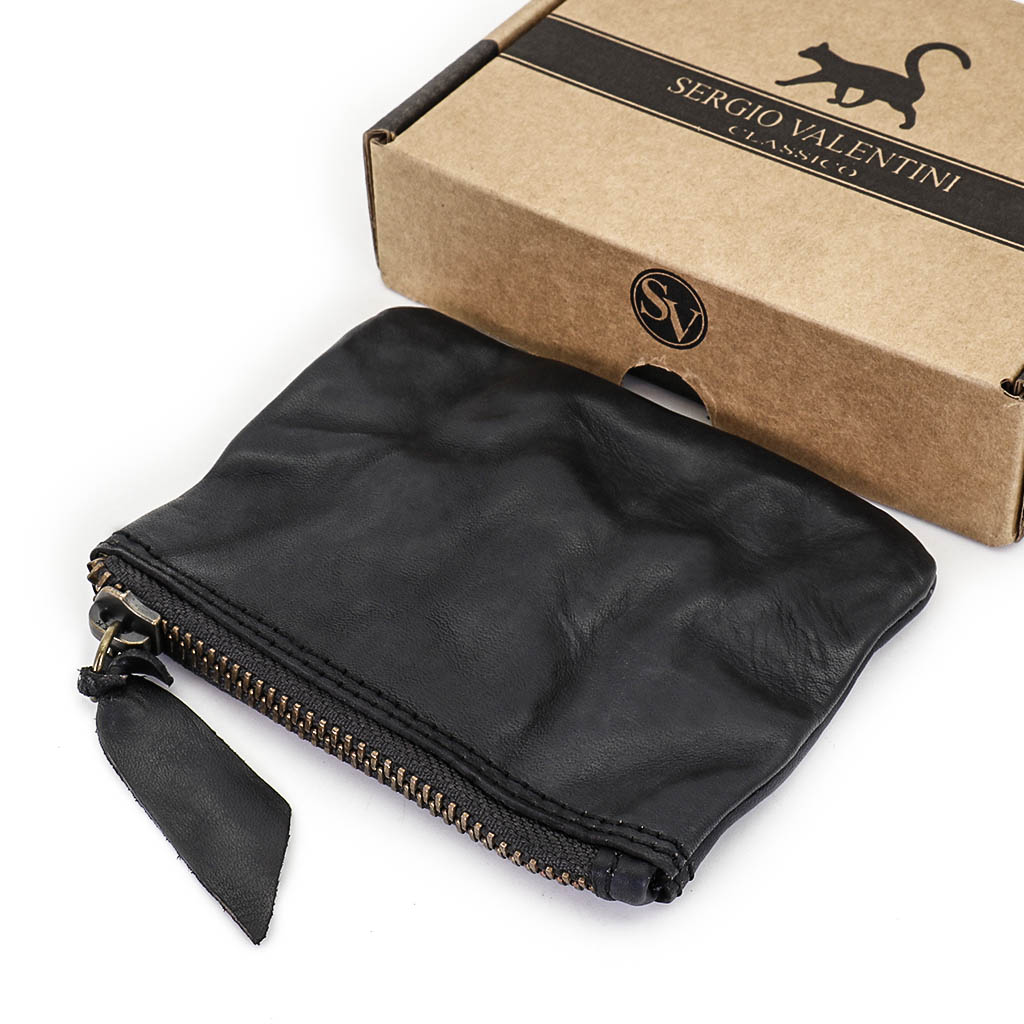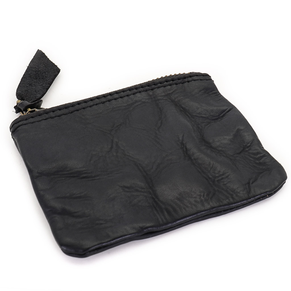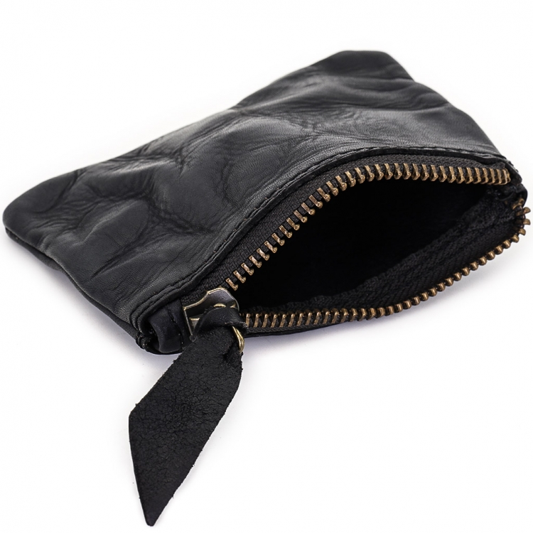 Размер 11,5 х 5,5 см. Винтажное портмоне из искусственно состаренной кожи черного цвета с одним отделением, закрывающимся на молнию.