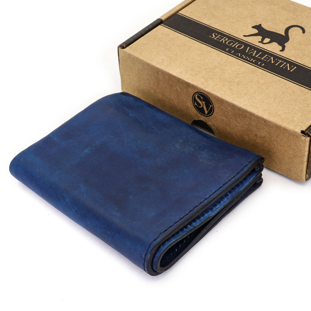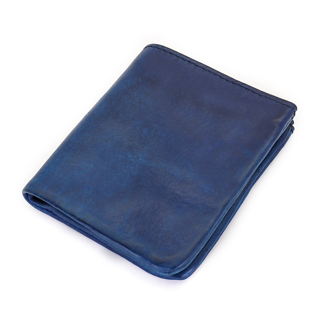 Размер 9 х 10,5 см. Винтажное портмоне из искусственно состаренной кожи тёмно-синего цвета с отделением для купюр, четырьмя кармашками для карточек и карманом для монет.