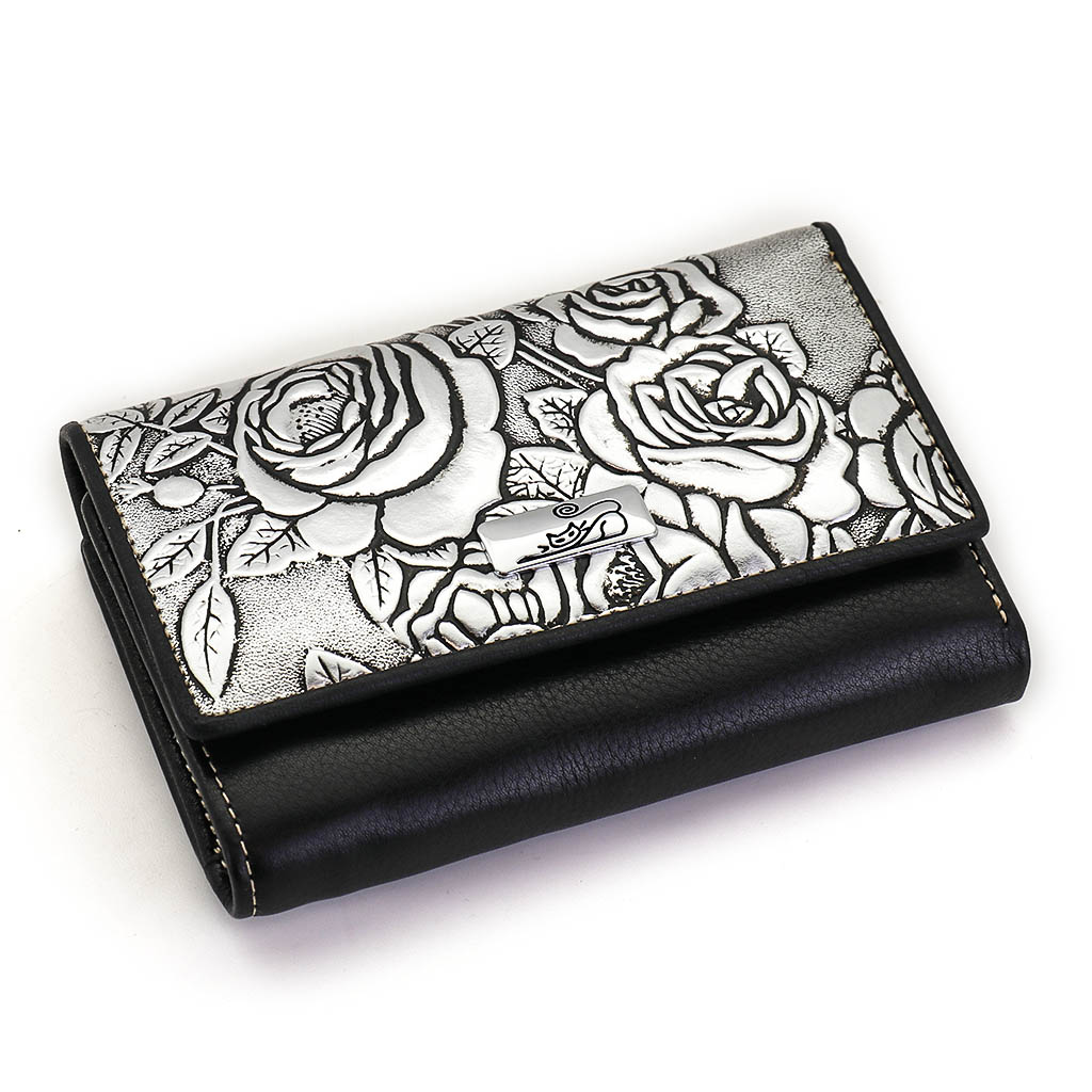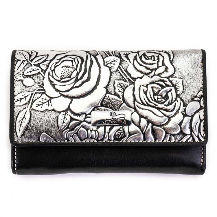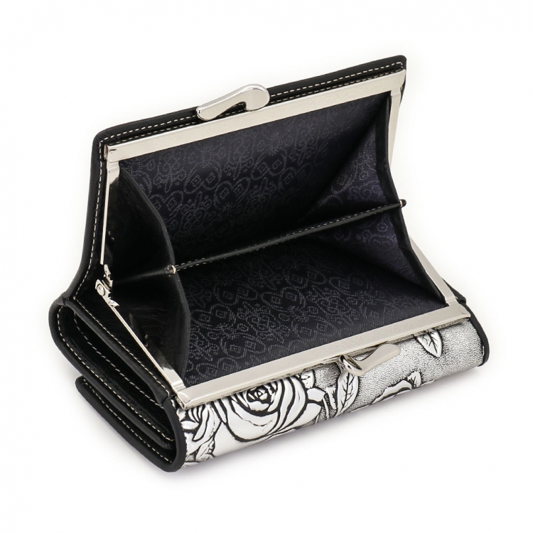 Размер 12,5 х 8,5 см. Закрывается на кнопку. Внутри - три отделения для купюр (одно на молнии), три кармашка для пластиковых карт, два боковых кармана, прозрачное окошко для фотографии. Снаружи - отделение для монет под рамочным замком.