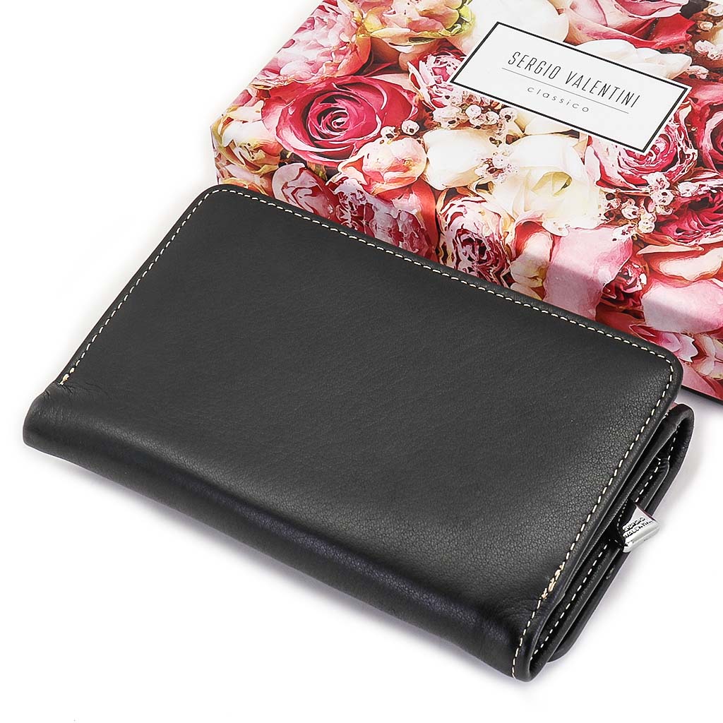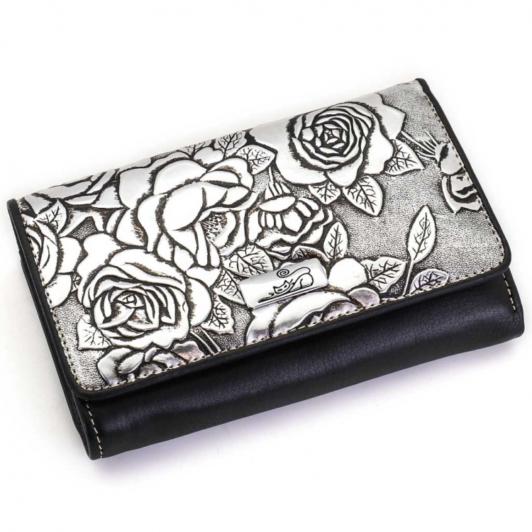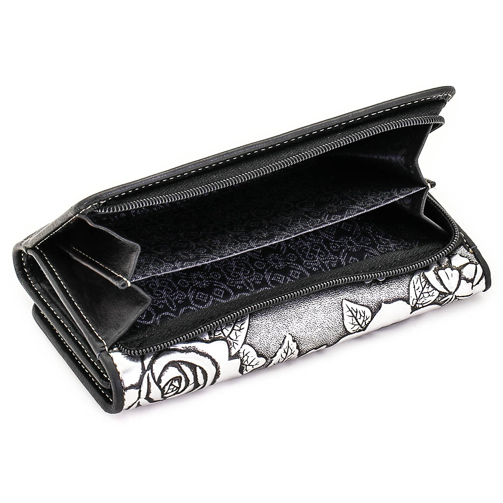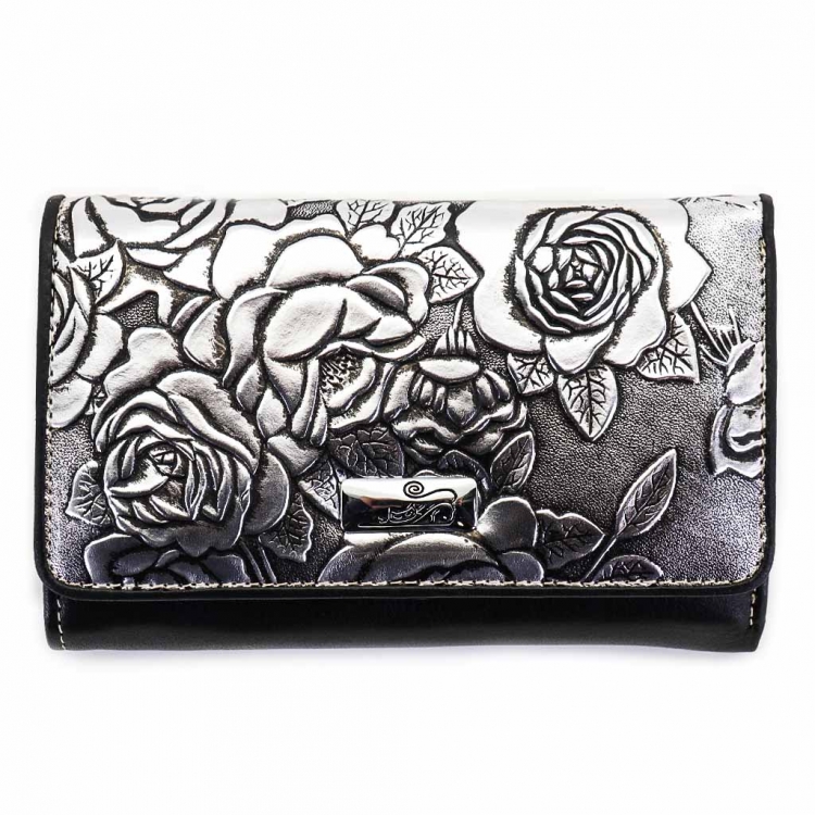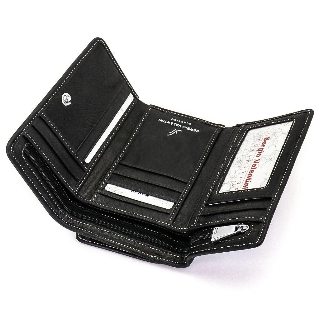 Размер 14 х 9 см. Закрывается на кнопку. Внутри - три отделения для купюр (одно на молнии), девять кармашков для пластиковых карт, четыре боковых кармана, прозрачное окошко для фотографии. Снаружи - отделение для монет на молнии
