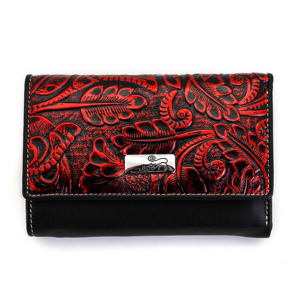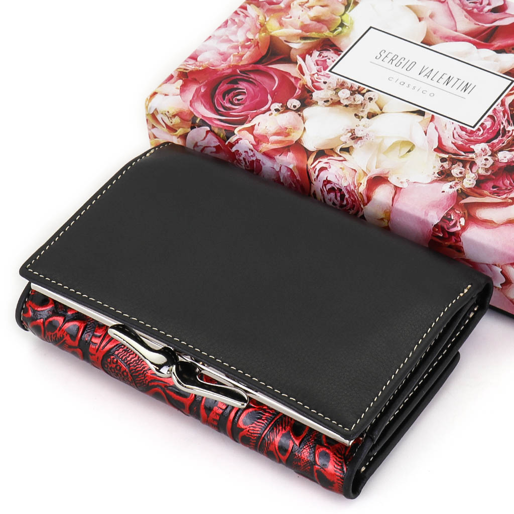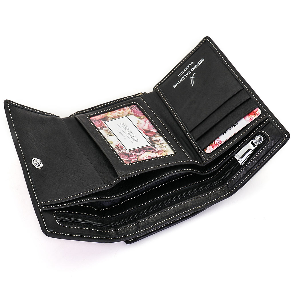 Размер 12,5 х 8,5 см. Закрывается на кнопку. Внутри - три отделения для купюр (одно на молнии), три кармашка для пластиковых карт, два боковых кармана, прозрачное окошко для фотографии. Снаружи - отделение для монет под рамочным замком.