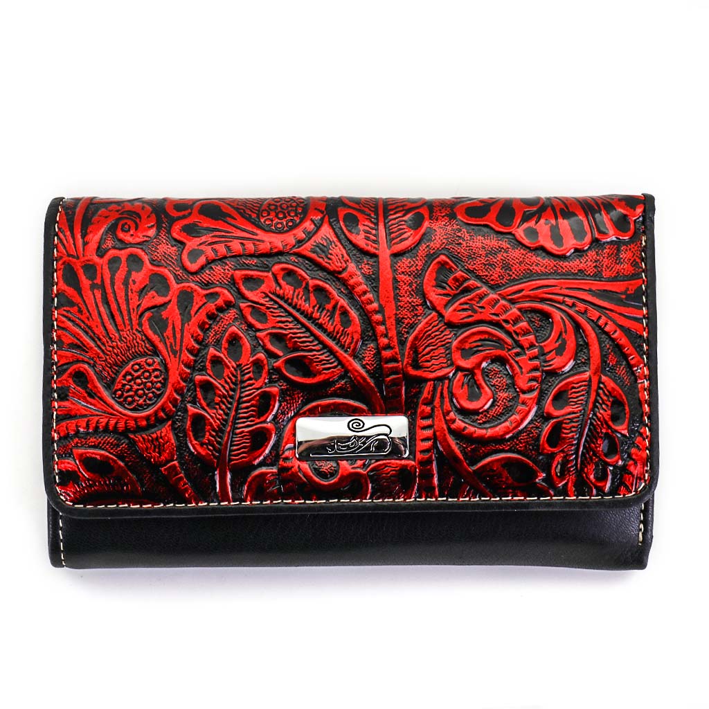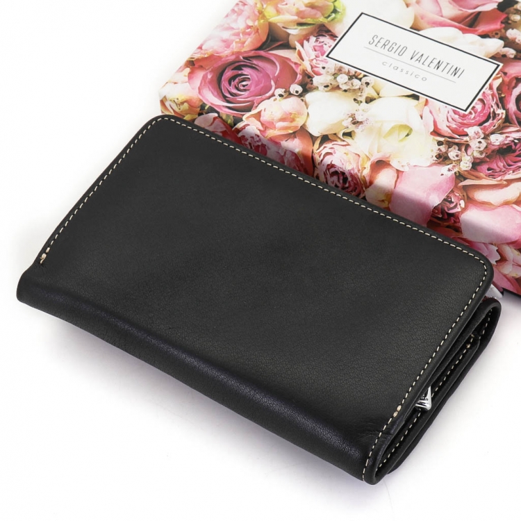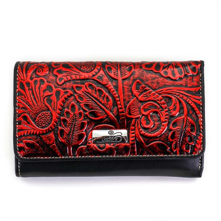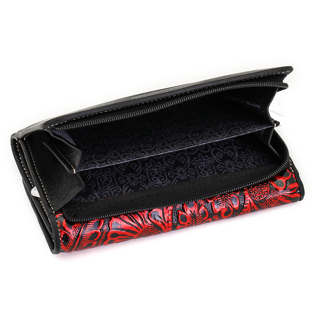Размер 14 х 9 см. Закрывается на кнопку. Внутри - три отделения для купюр (одно на молнии), девять кармашков для пластиковых карт, четыре боковых кармана, прозрачное окошко для фотографии. Снаружи - отделение для монет на молнии