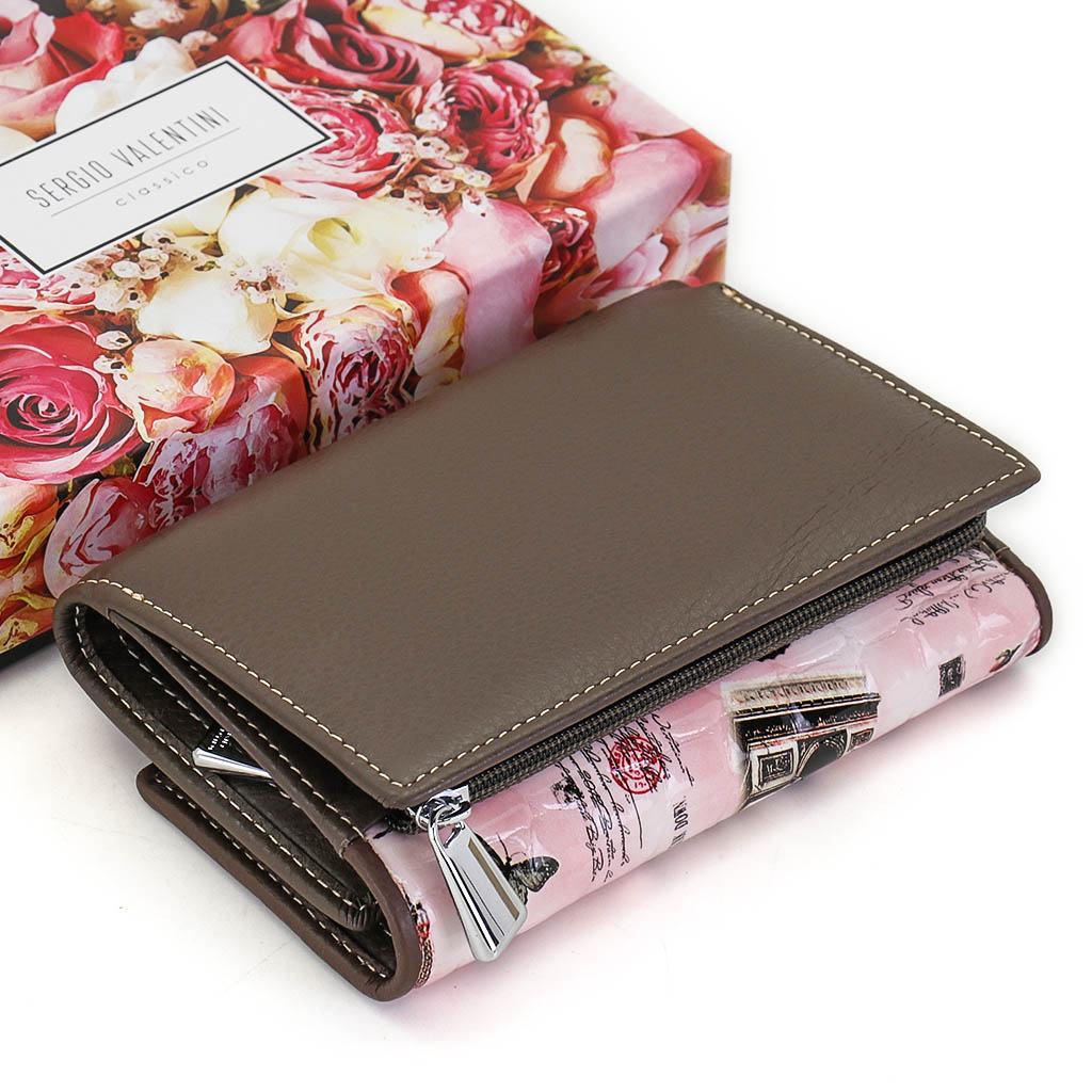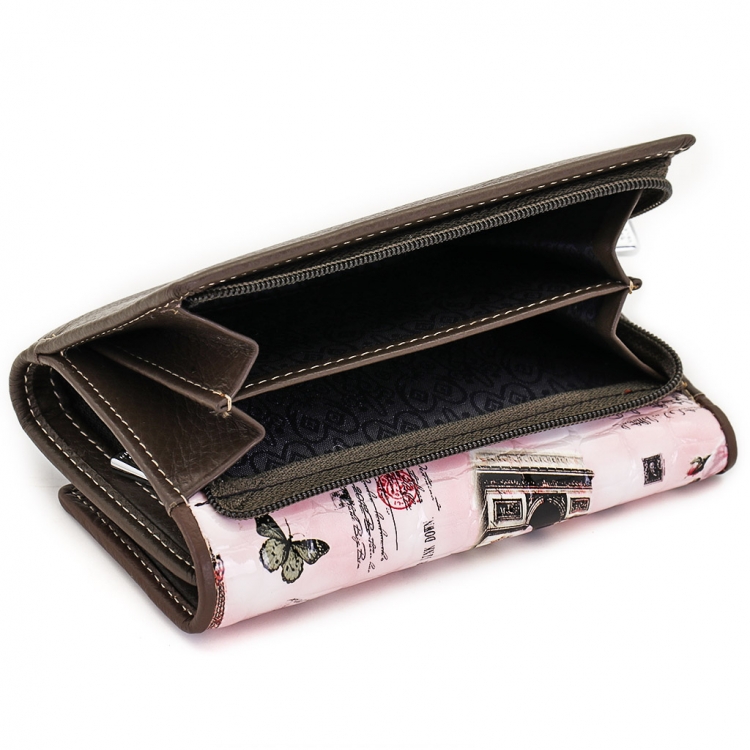 Размер 12,5 х 9 см.. Закрывается на кнопку. Внутри - три отделения для купюр (одно на молнии), три кармашка для пластиковых карт, два боковых кармана, прозрачное окошко для фотографии. Снаружи - отделение для монет на молнии.